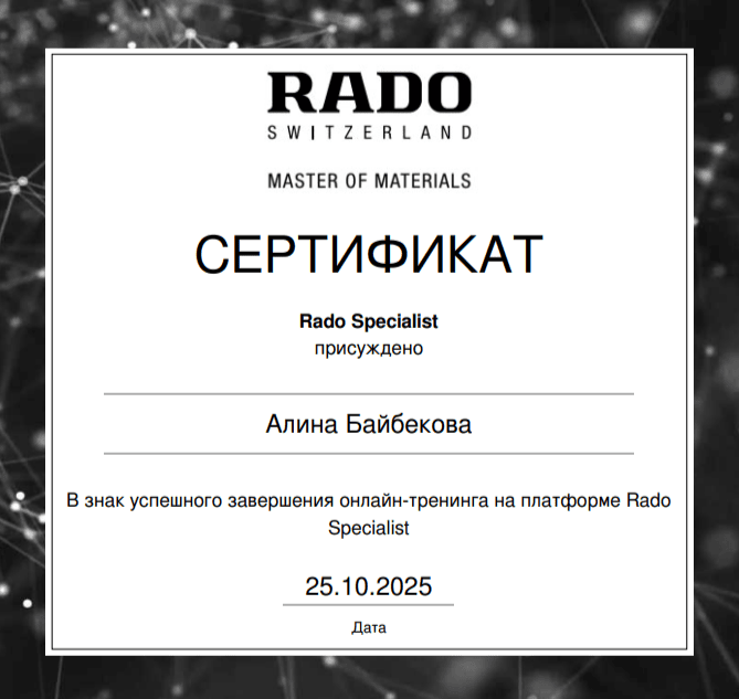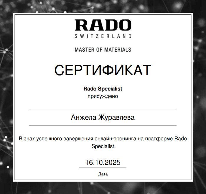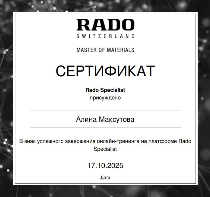 Наши консультанты проходят обязательную сертификацию у ведущих производителей часов, таких как Tissot, Rado, Certina и Casio. Это подтверждает их высокий уровень профессионализма и компетенций, необходимых для работы с оригинальной продукцией.