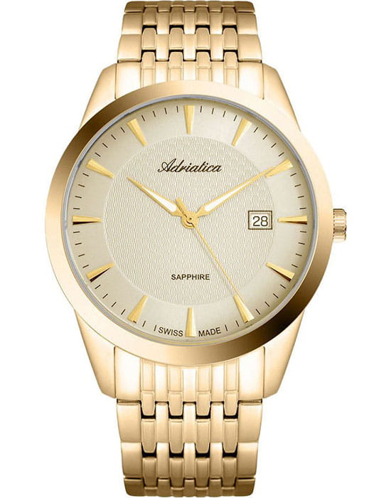 Мужские часы с сапфировым стеклом Adriatica A1288.1111Q, кварцевый механизм с высокой точностью. Сапфировое стекло устойчивое к появлению царапин, обладающее высокой прозрачностью. Класс водозащиты: 50 метров, позволит защитить корпус от случайных брызг или капель дождя. Корпус часов изготовлен из стали, позолоченного цвета.