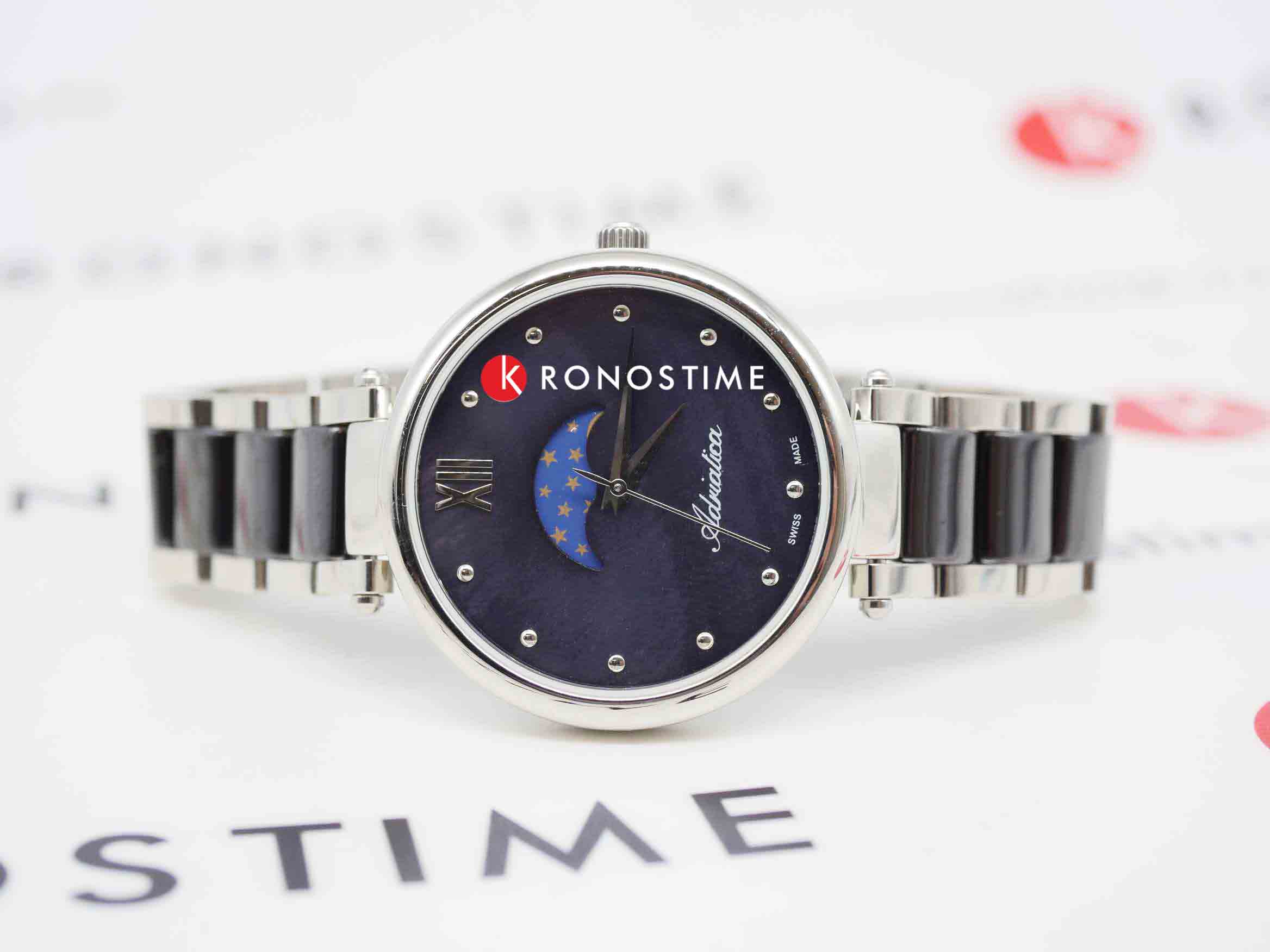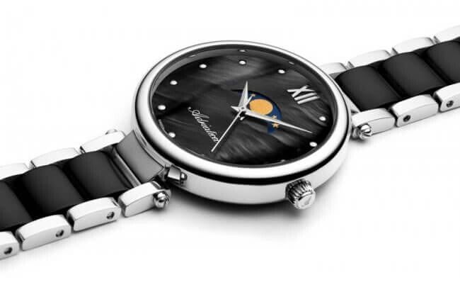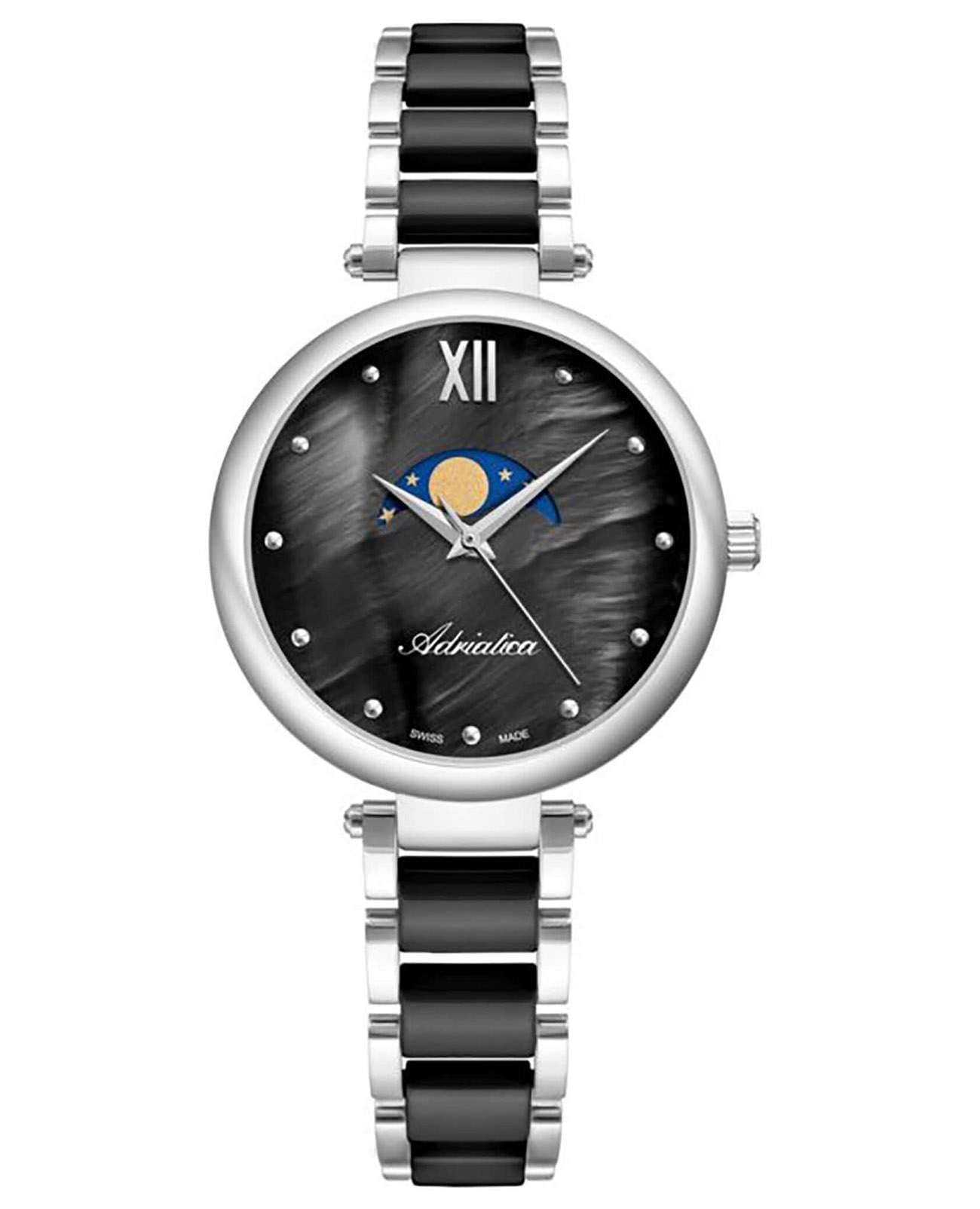 Женские часы Adriatica A3705.E18MQM представляют собой гармонию изысканности и функциональности, создавая идеальный аксессуар для тех, кто ценит качество и стиль. Эти швейцарские часы оснащены надежным кварцевым механизмом с калибром Ronda 788, который гарантирует точность и долговечность. Корпус, выполненный из нержавеющей стали, имеет диаметр 34 мм и толщину 7 мм, что придаёт ему утончённый и современный вид. Перламутровый черный циферблат, защищённый минеральным стекломМинеральное стеклоМинеральное стекло представляет собой искусственно выращенный минерал кварца. Такое стекло отличается особой устойчивостью к повреждениям и царапинам. Уступает по некоторым качествам сапфировому стеклу., добавляет элегантности и привлекает внимание. Особое внимание заслуживает браслет из нержавеющей стали с черными биокерамическимиБиокерамикаБиокерамика — это материал, который на две трети состоит из керамики, на одну треть — из биопластика. Он сочетает в себе лучшие качества обоих материалов и обладает прочностью и шелковистой на ощупь текстурой. вставками, который обеспечивает комфорт и надёжность при носке, а ювелирная застёжка добавляет дополнительный акцент на изысканность. Функция отображения фазы луны придаёт часам уникальность и делает их не только стильным, но и функциональным аксессуаром. Водозащита уровня 50WR позволяет не беспокоиться о воздействии влаги, что увеличивает практичность часов в повседневной жизни. Часы Adriatica A3705.E18MQM — это символ швейцарского качества, сочетающий в себе современные технологии и классический дизайн.