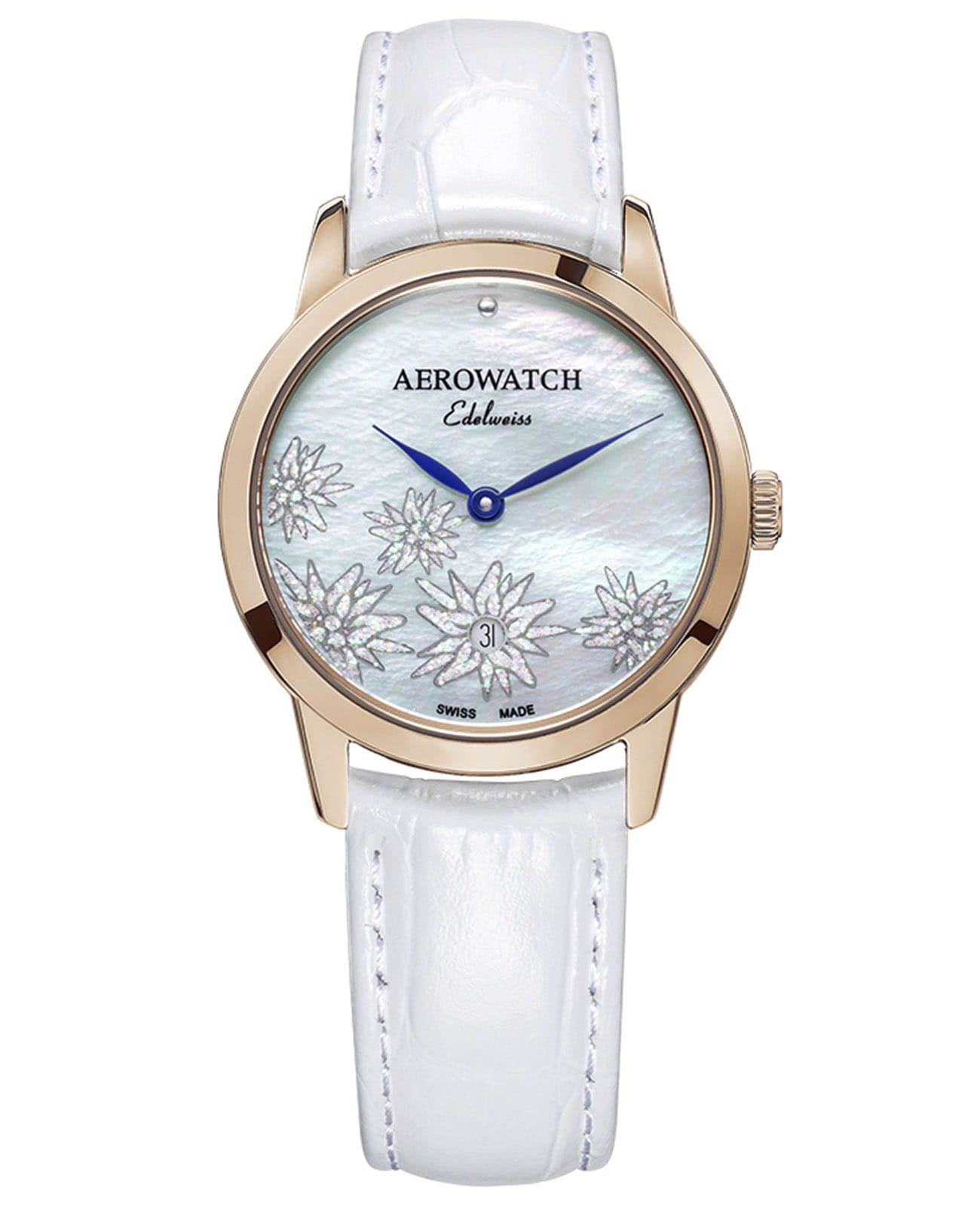 Женские швейцарские часы с Aerowatch Renaissance Les Grandes Classiques 49978 RO12, кварцевый механизм с высокой точностью. Сапфировое стеклоСапфировое стеклоПрочный и надёжный материал из кристалла сапфира синтетического происхождения, характеризующийся особой твёрдостью и устойчивостью к царапинам и повреждениям. устойчивое к появлению царапин, обладающее высокой прозрачностью. Корпус изготовлен из нержавеющей стали с PVDPVDУльтратонкое покрытие наносится в технике вакуумного напыления, сочетает в себе нитрид титана особой прочности со слоем золота или оксида хрома. Несёт в себе декоративную или защитную функцию. покрытием. Перламутровый циферблат украшен орнаментом Эдельвейс, окошко даты в положении 6 часов. Класс водозащиты: 50 метров, позволит защитить корпус от случайных брызг или капель дождя. Кожаный ремешок на стандартной застёжке.