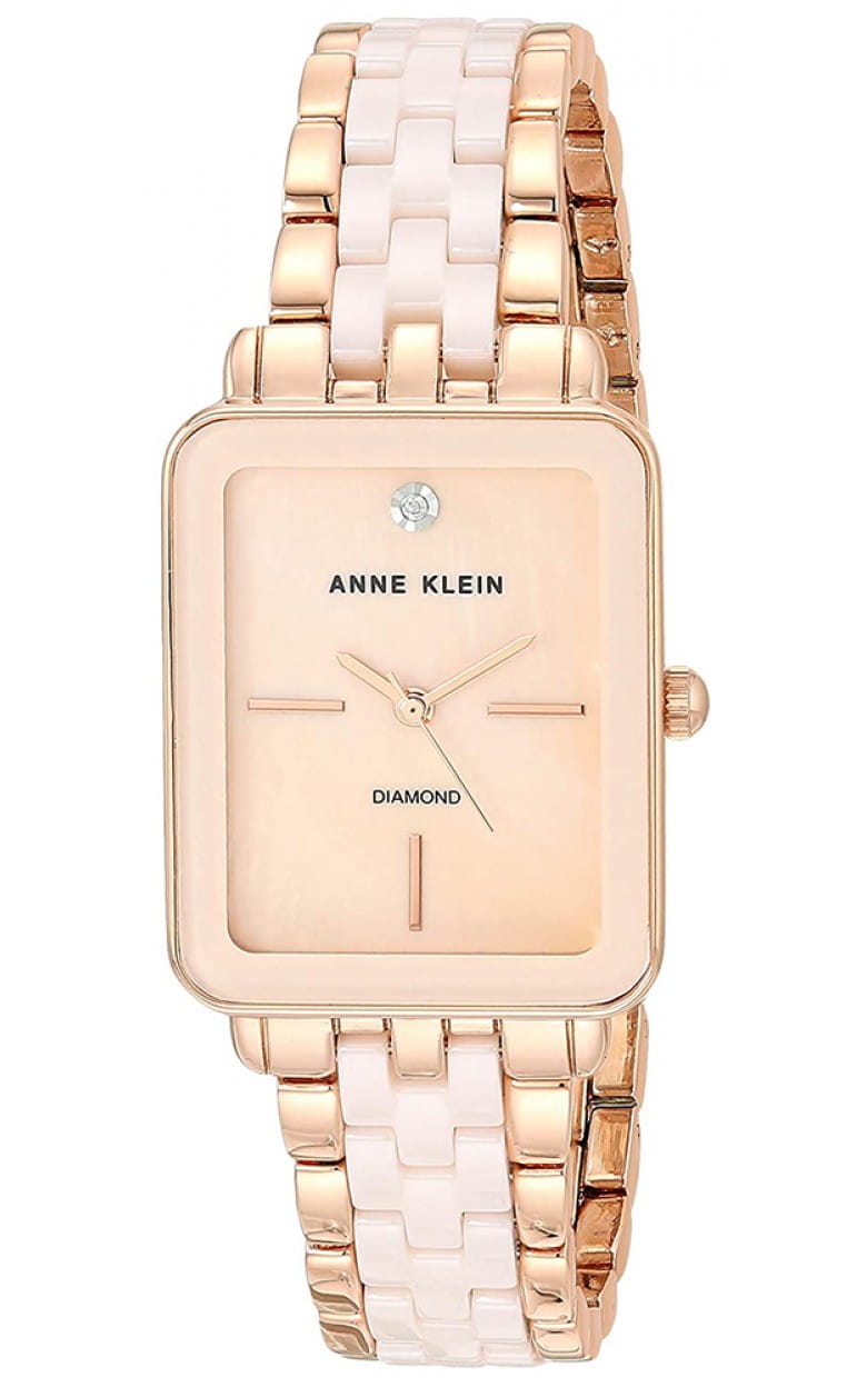 Женские американские часы с бриллиантом Anne Klein Diamond 3668LPRG, кварцевый механизм с высокой точностью. Класс водозащиты: 30 метров, позволит защитить корпус от случайных брызг или капель дождя. Корпус часов изготовлен из стали с розовым PVDPVDУльтратонкое покрытие наносится в технике вакуумного напыления, сочетает в себе нитрид титана особой прочности со слоем золота или оксида хрома. Несёт в себе декоративную или защитную функцию. покрытием. Перламутровый циферблат с бриллиантом на отметке ''12 часов'' и минеральным стекломМинеральное стеклоМинеральное стекло представляет собой искусственно выращенный минерал кварца. Такое стекло отличается особой устойчивостью к повреждениям и царапинам. Уступает по некоторым качествам сапфировому стеклу.. Браслет с керамическими вставками и розовым PVDPVDУльтратонкое покрытие наносится в технике вакуумного напыления, сочетает в себе нитрид титана особой прочности со слоем золота или оксида хрома. Несёт в себе декоративную или защитную функцию. покрытием.