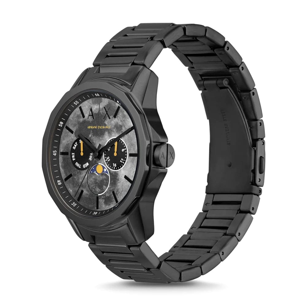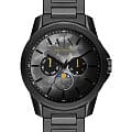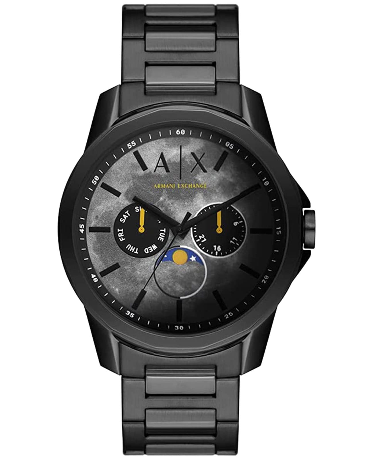 Мужские наручные часы с минеральным стекломМинеральное стеклоМинеральное стекло представляет собой искусственно выращенный минерал кварца. Такое стекло отличается особой устойчивостью к повреждениям и царапинам. Уступает по некоторым качествам сапфировому стеклу. Armani Exchange Banks AX1738, кварцевый механизм с высокой точностью. Класс водозащиты: 50 метров, позволит защитить корпус от случайных брызг или капель дождя. Корпус часов изготовлен из стали с IP-покрытиемIP-покрытиеМетод ионного напыления. Демонстрирует повышенную устойчивость к истиранию, окислению и химическим веществам. Под воздействием высокого давления и температуры около 1500°C молекулы металла надёжно соединяются с частицами корпуса часов.. Модель имеет серый циферблат с эффектом луны, черные часовую, минутную и секундную стрелки. Циферблат оснащен индексами в виде жезлов, а также дополнительными циферблатами фаз Луны, дня недели и даты. Стальной браслет на раскладной застёжкеРаскладная застёжкаТакой тип застёжки используется только на браслетах из металла. Она никогда не раскрывается полностью, происходит разделение на 2 и более частей. Раскладывающая застёжка снизит вероятность потери часов к минимуму. с IP-покрытиемIP-покрытиеМетод ионного напыления. Демонстрирует повышенную устойчивость к истиранию, окислению и химическим веществам. Под воздействием высокого давления и температуры около 1500°C молекулы металла надёжно соединяются с частицами корпуса часов..