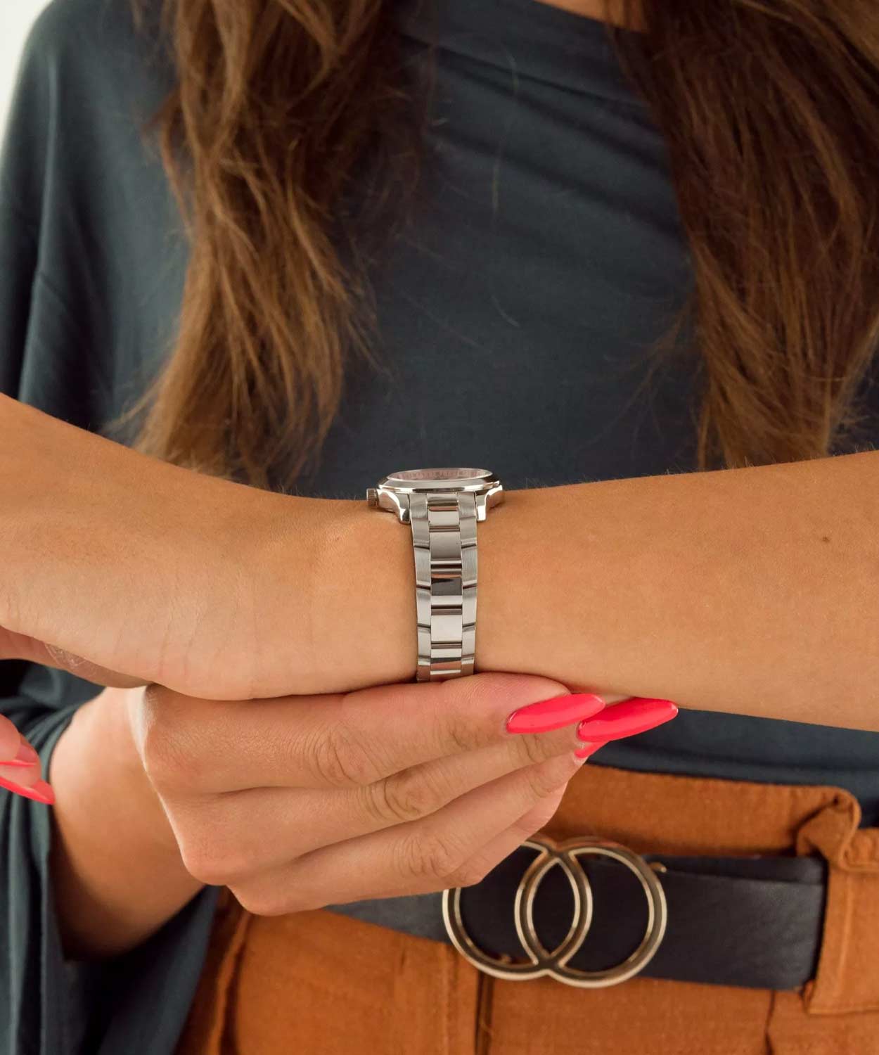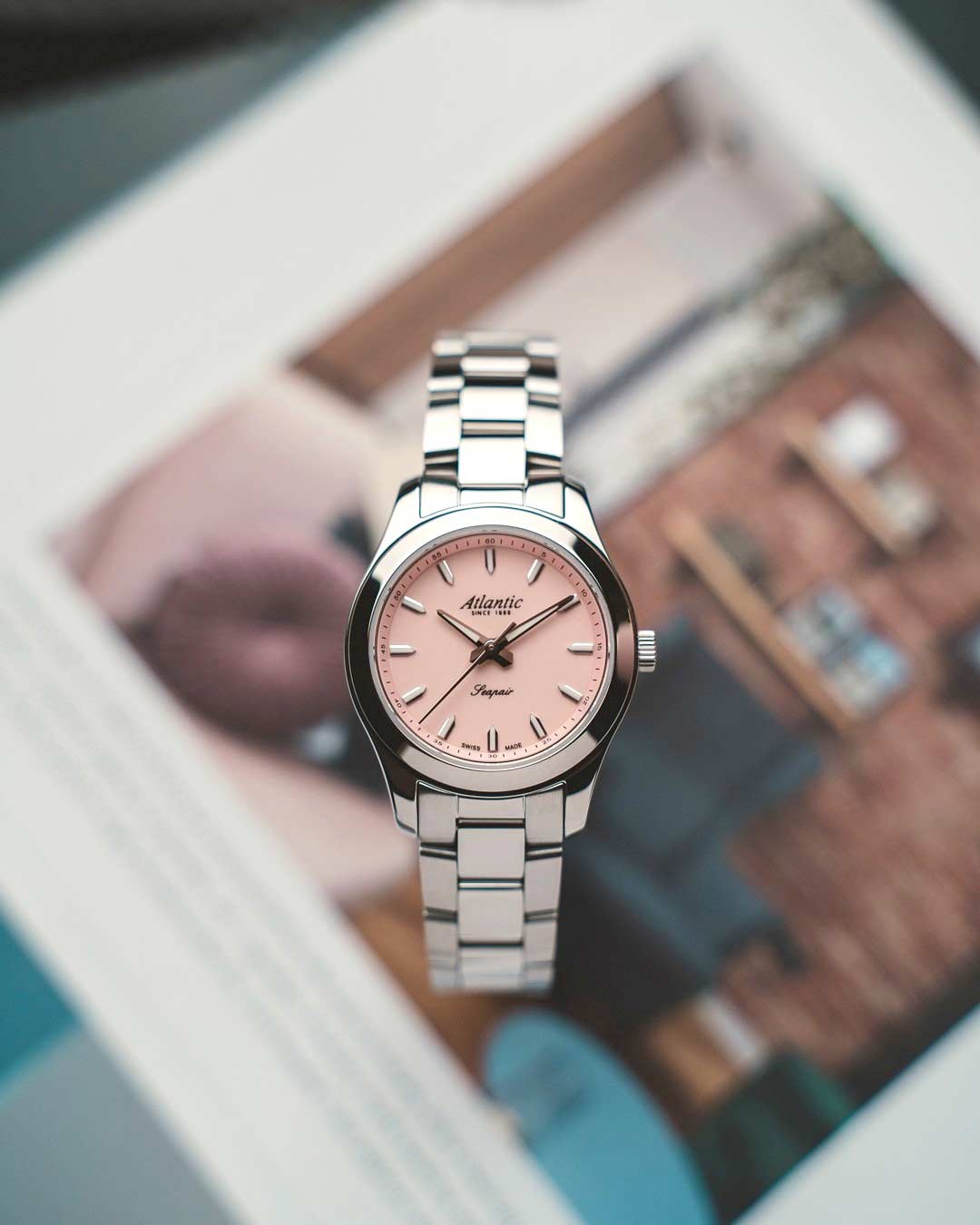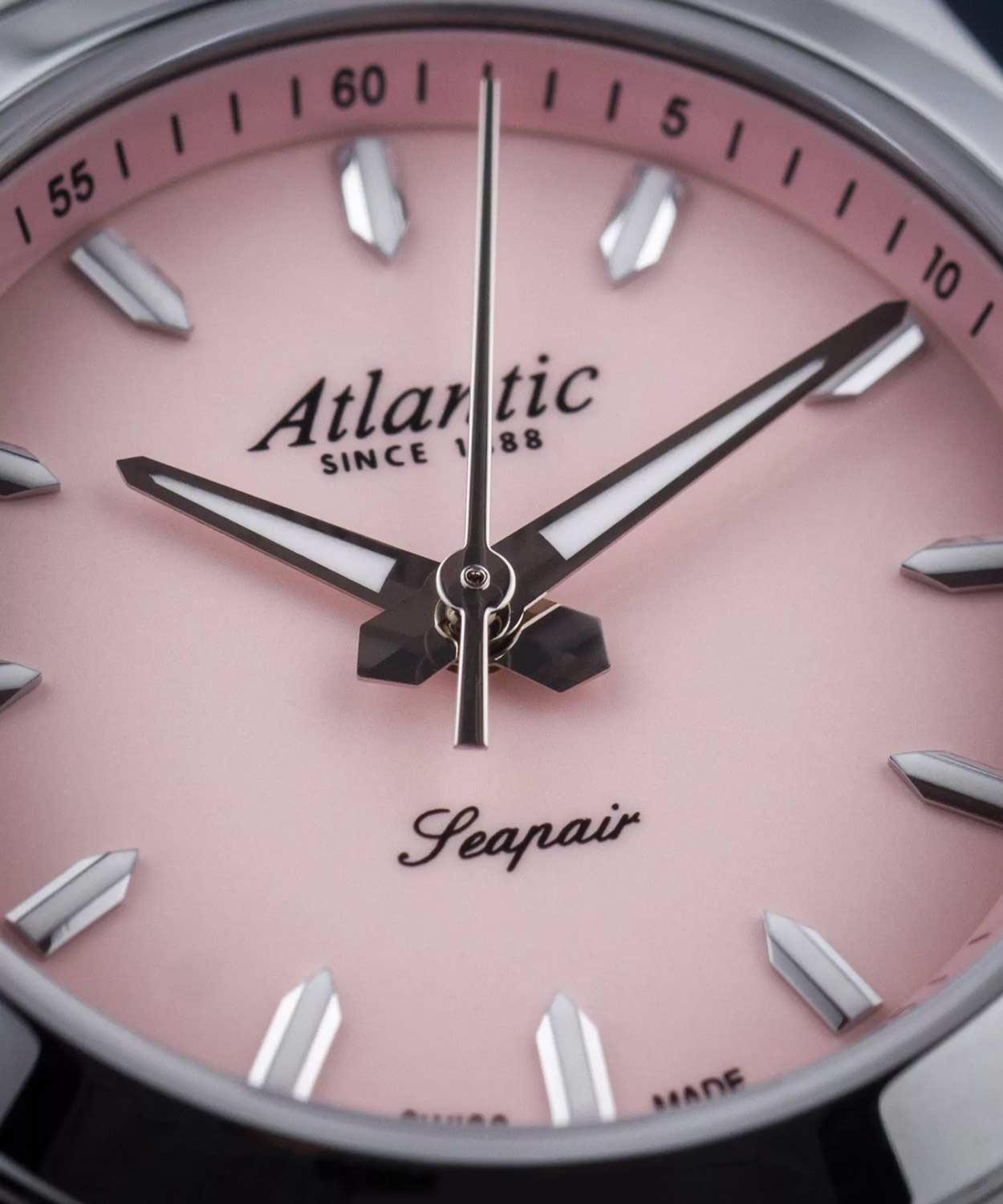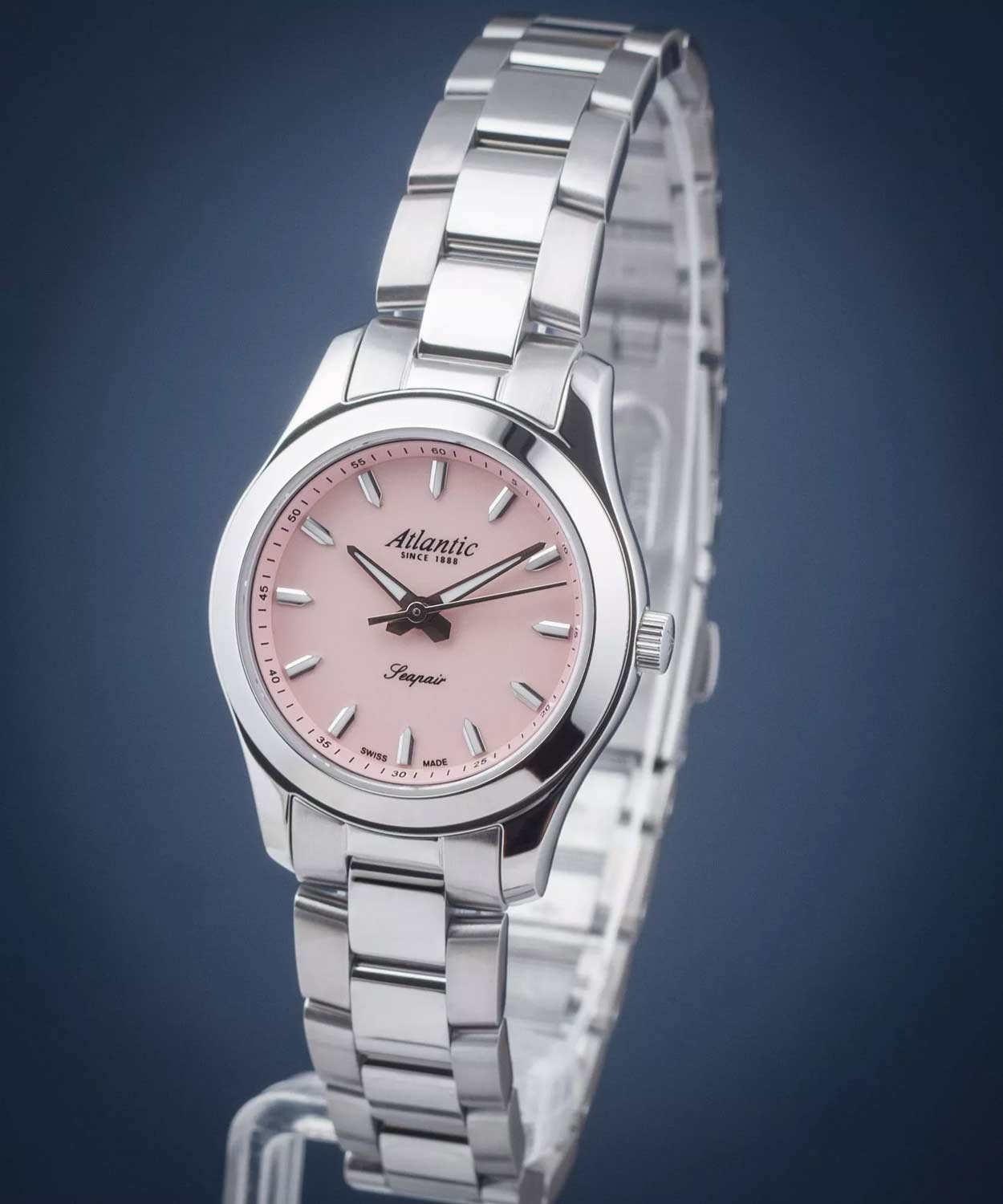 Женские швейцарские часы Atlantic Seapair Ladies 20335.41.91PK, кварцевый механизм с высокой точностью. Циферблат часов с люминесцентным покрытиемЛюминесцентное покрытиеПозволяет считывать показания времени в темноте. Производители наносят на стрелки, часовые индексы, безель или поверхность циферблата светонакопительный состав, дающий холодное свечение. стрелок и меток, дополнен сапфировым стекломСапфировое стеклоПрочный и надёжный материал из кристалла сапфира синтетического происхождения, характеризующийся особой твёрдостью и устойчивостью к царапинам и повреждениям., устойчивым к появлению царапин и обладающее высокой прозрачностью. Класс водозащиты: 30 метров, позволит защитить корпус от случайных брызг или капель дождя. Корпус часов изготовлен из нержавеющей стали. Стальной браслет с раскладной застёжкойРаскладная застёжкаТакой тип застёжки используется только на браслетах из металла. Она никогда не раскрывается полностью, происходит разделение на 2 и более частей. Раскладывающая застёжка снизит вероятность потери часов к минимуму..