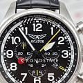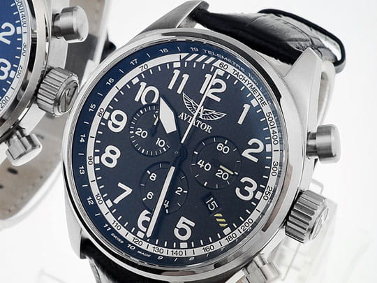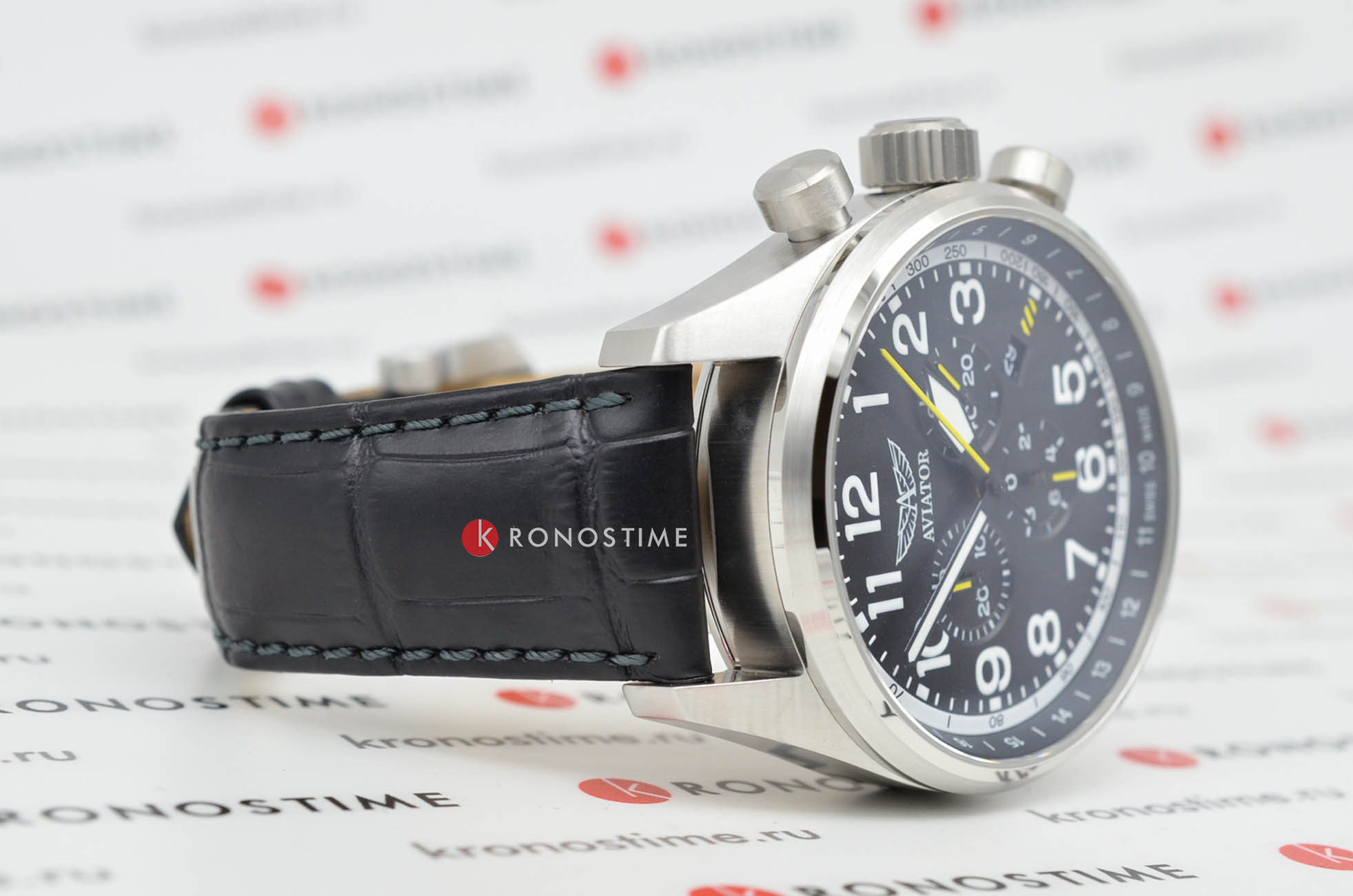 Aviator Airacobra V.2.25.0.169.4 — швейцарский GMT-хронограф в духе пилотских инструментов, объединяющий точность, удобство и лаконичный дизайн. Диаметр корпуса — 45 мм, выполнен из нержавеющей стали, что подчёркивает техническую надёжность в образе часов.