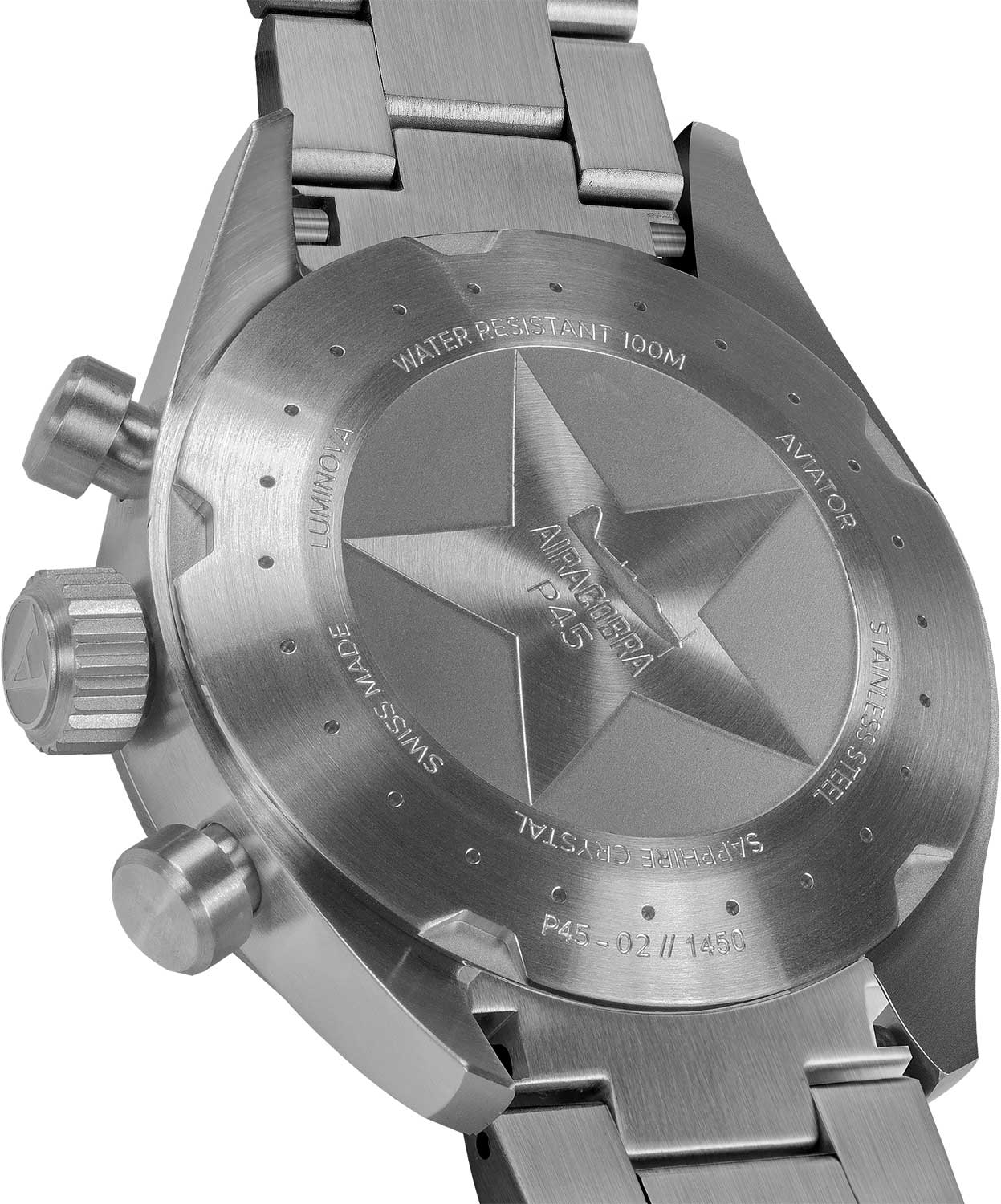 Aviator Airacobra V.2.25.0.169.5 — швейцарский GMT-хронограф в духе пилотских инструментов, объединяющий точность, удобство и лаконичный дизайн. Диаметр корпуса — 45 мм, выполнен из нержавеющей стали, что подчёркивает техническую надёжность в образе часов.