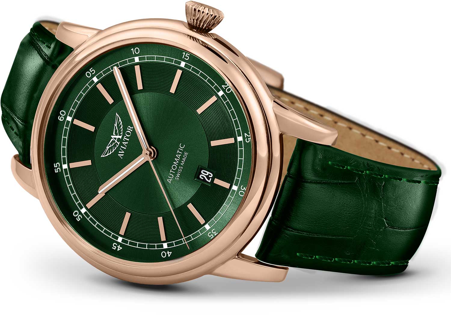 Aviator Douglas DC-3 V.3.32.2.237.4 — швейцарские часы в классике авиадизайна, сочетающие безупречную читаемость и высокую надёжность. Лимитированная серия. Корпус диаметром 45 мм выполнен из нержавеющей стали 316L с PVD-покрытиемPVDУльтратонкое покрытие наносится в технике вакуумного напыления, сочетает в себе нитрид титана особой прочности со слоем золота или оксида хрома. Несёт в себе декоративную или защитную функцию. цвета розового золота. Накладные метки выполнены в виде штрихов. Окошко даты находится в положении 6 часов. Часовые метки и стрелки покрыты люминесцентным покрытиемЛюминесцентное покрытиеПозволяет считывать показания времени в темноте. Производители наносят на стрелки, часовые индексы, безель или поверхность циферблата светонакопительный состав, дающий холодное свечение. Superluminova, позволяющим легко определять время даже в тёмное время суток. Поверхность защищена прочным сапфировым стекломСапфировое стеклоПрочный и надёжный материал из кристалла сапфира синтетического происхождения, характеризующийся особой твёрдостью и устойчивостью к царапинам и повреждениям. с антибликовым покрытием, устойчивым к царапинам. Сердце модели — швейцарский механизм Sellita SW 200, известный своей точностью и долговечностью. Калибр управляется регулятором Etachron , который обеспечивает высокую точность хода как на земле, так и над землей. Водозащита 100 метров, позволит плавать, нырять и заниматься другими водными видами спорта. Завинчивающаяся головка и задняя крышка обеспечивают уверенную ударопрочностьУдаропрочный корпусМеханизм заключён в корпус, выполненный из современных материалов, устойчивых к ударам, механическим повреждениям и падению с высоты: инновационный пластик, карбон, нержавеющая сталь, титан. и надёжную защиту от влаги и пыли. В механизме 26 камней, запас хода 38 часов. Модель дополнена кожаным ремешком с выразительной текстурой и классическим стилем, закреплённым с помощью застёжке-бабочке с кнопкамиЗастёжка "бабочка"Такой вид застёжки дополняется предохранителями, помогающими избежать случайного раскрытия браслета. Обладают изящным исполнением. — для максимального комфорта и лёгкости в повседневном использовании. Циферблат выполнен по технологии sun-ray (солнечные лучи). Коллекция Douglas была разработана в честь известного американского пассажирского самолета Douglas DC-3. Aviator — это образец лётной точности, инженерной чёткости и сдержанной роскоши, идеально подходящий для тех, кто ценит функциональность и уверенность в каждом элементе.