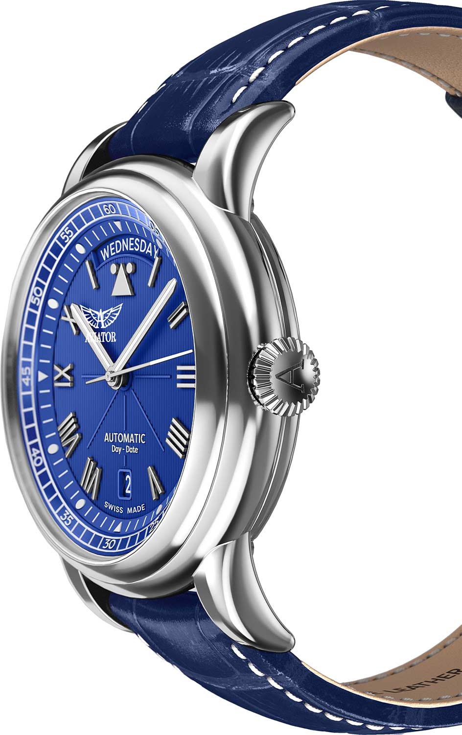 Aviator Douglas Day Date V.3.35.0.276.4 — швейцарские часы в классике авиадизайна, сочетающие безупречную читаемость и высокую надёжность. Лимитированная серия. Корпус диаметром 41,2 мм выполнен из нержавеющей стали 316L. Накладные метки выполнены в виде римских цифр. Окошко даты находится в положении 6 часов. День недели находится в положении 12 часов. Часовые метки и стрелки покрыты люминесцентным покрытиемЛюминесцентное покрытиеПозволяет считывать показания времени в темноте. Производители наносят на стрелки, часовые индексы, безель или поверхность циферблата светонакопительный состав, дающий холодное свечение. Superluminova, позволяющим легко определять время даже в тёмное время суток. Поверхность защищена прочным сапфировым стекломСапфировое стеклоПрочный и надёжный материал из кристалла сапфира синтетического происхождения, характеризующийся особой твёрдостью и устойчивостью к царапинам и повреждениям. с антибликовым покрытием, устойчивым к царапинам. Сердце модели — швейцарский механизм Sellita SW 240-1, известный своей точностью и долговечностью. Водозащита 100 метров, позволит плавать, нырять и заниматься другими водными видами спорта. Завинчивающаяся головка и задняя крышка обеспечивают уверенную ударопрочностьУдаропрочный корпусМеханизм заключён в корпус, выполненный из современных материалов, устойчивых к ударам, механическим повреждениям и падению с высоты: инновационный пластик, карбон, нержавеющая сталь, титан. и надёжную защиту от влаги и пыли. В механизме 26 камней, запас хода до 41 час. Модель дополнена кожаным ремешком с выразительной текстурой и классическим стилем, закреплённым с помощью застёжке-бабочке с кнопкамиЗастёжка "бабочка"Такой вид застёжки дополняется предохранителями, помогающими избежать случайного раскрытия браслета. Обладают изящным исполнением. — для максимального комфорта и лёгкости в повседневном использовании. Модель вдохновлена американским пассажирским самолетом Douglas DC-3, который является одним из лучших самолетов за всю историю авиации. Aviator — это образец лётной точности, инженерной чёткости и сдержанной роскоши, идеально подходящий для тех, кто ценит функциональность и уверенность в каждом элементе.
