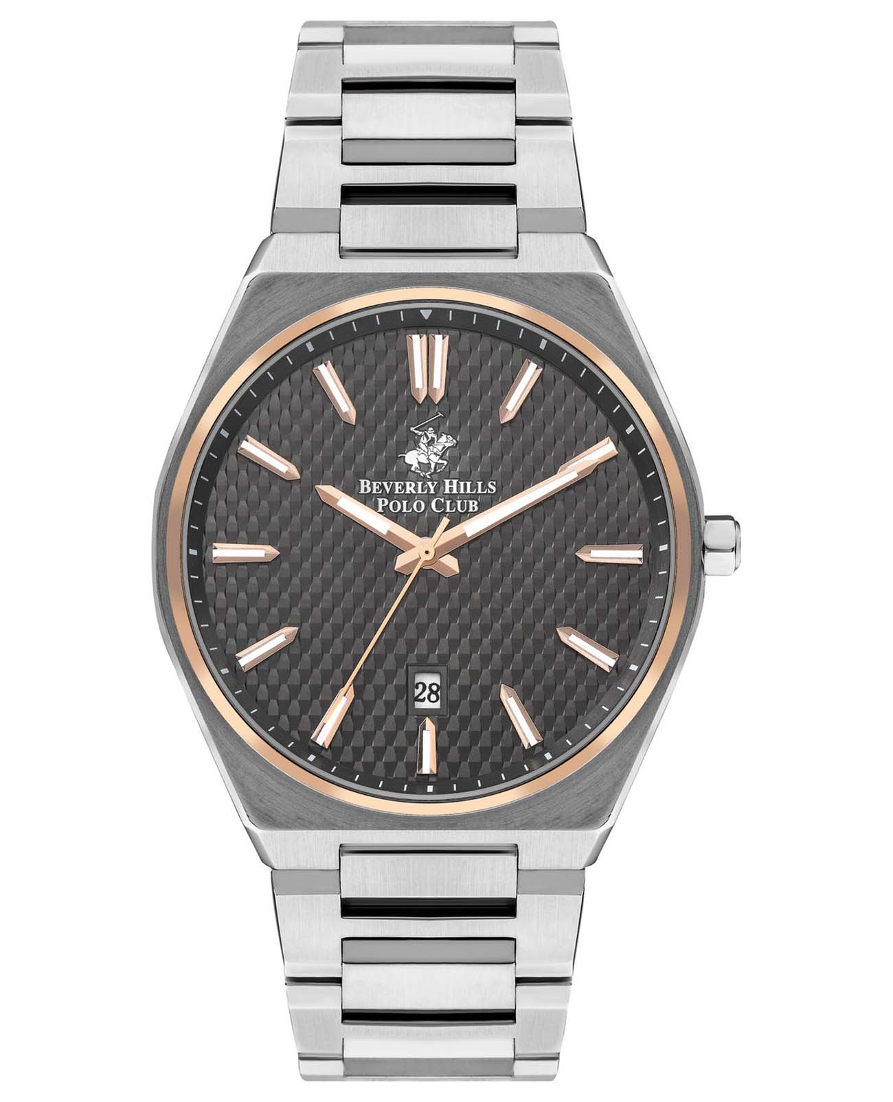 Американские мужские часы Beverly Hills Polo Club BP3503X.560 с минеральным стекломМинеральное стеклоМинеральное стекло представляет собой искусственно выращенный минерал кварца. Такое стекло отличается особой устойчивостью к повреждениям и царапинам. Уступает по некоторым качествам сапфировому стеклу., кварцевый механизм с высокой точностью. Корпус и браслет часов изготовлен из нержавеющей стали. НеподвижныйбезельБезельВнешний ободок, закрепляющий стекло. В спортивных часах так называется поворотное кольцо с делениями на циферблате, выполняет роль таймера – замеряет отрезки времени на шкале. Неподвижный безель – элемент декора. Однонаправленно вращающийся безель на дайверских часах позволяет фиксировать моменты погружения и выныривания на поверхность. из нержавеющей стали с IP-покрытиемIP-покрытиеМетод ионного напыления. Демонстрирует повышенную устойчивость к истиранию, окислению и химическим веществам. Под воздействием высокого давления и температуры около 1500°C молекулы металла надёжно соединяются с частицами корпуса часов.. Стрелки с люминесцентной подсветкойЛюминесцентное покрытиеПозволяет считывать показания времени в темноте. Производители наносят на стрелки, часовые индексы, безель или поверхность циферблата светонакопительный состав, дающий холодное свечение..Окошко даты в положении 6 часов. Класс водозащиты: 100 метров, позволит плавать, нырять и заниматься другими водными видами спорта. Стальной браслет на застёжке «бабочка» с кнопкамиЗастёжка "бабочка"Такой вид застёжки дополняется предохранителями, помогающими избежать случайного раскрытия браслета. Обладают изящным исполнением. .