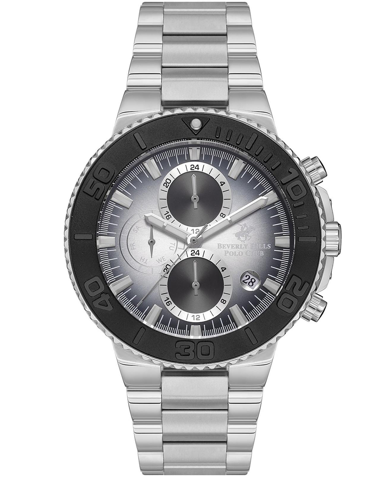 Американские мужские часы-хронографХронографФункция позволяет измерять отрезки времени с особой точностью: часы, минуты, секунды. Верным признаком хронографа является наличие на циферблате 3 дополнительных окошек-счётчиков. Beverly Hills Polo Club BP3540X.350 с минеральным стекломМинеральное стеклоМинеральное стекло представляет собой искусственно выращенный минерал кварца. Такое стекло отличается особой устойчивостью к повреждениям и царапинам. Уступает по некоторым качествам сапфировому стеклу., кварцевый механизм с высокой точностью. Класс водозащиты: 50 метров, позволит защитить корпус от случайных брызг или капель дождя. Стальной браслет на раскладной застёжкойРаскладная застёжкаТакой тип застёжки используется только на браслетах из металла. Она никогда не раскрывается полностью, происходит разделение на 2 и более частей. Раскладывающая застёжка снизит вероятность потери часов к минимуму.. Окошко даты находится в положении между 4 и 5 часов. На отдельных циферблатах отражены день недели, 24-х часовой формат времени и второй часовой поясВторой часовой поясФункция, позволяющая отображать время двух часовых поясов одновременно.. Стрелки и метки с люминесцентным покрытиемЛюминесцентное покрытиеПозволяет считывать показания времени в темноте. Производители наносят на стрелки, часовые индексы, безель или поверхность циферблата светонакопительный состав, дающий холодное свечение.. Вращающийся безельБезельВнешний ободок, закрепляющий стекло. В спортивных часах так называется поворотное кольцо с делениями на циферблате, выполняет роль таймера – замеряет отрезки времени на шкале. Неподвижный безель – элемент декора. Однонаправленно вращающийся безель на дайверских часах позволяет фиксировать моменты погружения и выныривания на поверхность. с IP-покрытиемIP-покрытиеМетод ионного напыления. Демонстрирует повышенную устойчивость к истиранию, окислению и химическим веществам. Под воздействием высокого давления и температуры около 1500°C молекулы металла надёжно соединяются с частицами корпуса часов..