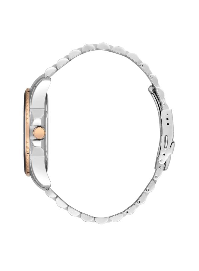 Мужские наручные часы Beverly Hills Polo Club BP3559X.590 с надёжным кварцевым механизмом. Минеральное стеклоМинеральное стеклоМинеральное стекло представляет собой искусственно выращенный минерал кварца. Такое стекло отличается особой устойчивостью к повреждениям и царапинам. Уступает по некоторым качествам сапфировому стеклу. устойчивое к мелким механическим повреждениям. Корпус часов изготовлен из нержавеющей стали. Стальной браслет с частичным IP-покрытиемIP-покрытиеМетод ионного напыления. Демонстрирует повышенную устойчивость к истиранию, окислению и химическим веществам. Под воздействием высокого давления и температуры около 1500°C молекулы металла надёжно соединяются с частицами корпуса часов. на раскладной застёжкеРаскладная застёжкаТакой тип застёжки используется только на браслетах из металла. Она никогда не раскрывается полностью, происходит разделение на 2 и более частей. Раскладывающая застёжка снизит вероятность потери часов к минимуму.. Вращающийся стальной безельБезельВнешний ободок, закрепляющий стекло. В спортивных часах так называется поворотное кольцо с делениями на циферблате, выполняет роль таймера – замеряет отрезки времени на шкале. Неподвижный безель – элемент декора. Однонаправленно вращающийся безель на дайверских часах позволяет фиксировать моменты погружения и выныривания на поверхность. с IP-покрытиемIP-покрытиеМетод ионного напыления. Демонстрирует повышенную устойчивость к истиранию, окислению и химическим веществам. Под воздействием высокого давления и температуры около 1500°C молекулы металла надёжно соединяются с частицами корпуса часов.. Стрелки и метки с люминесцентным покрытиемЛюминесцентное покрытиеПозволяет считывать показания времени в темноте. Производители наносят на стрелки, часовые индексы, безель или поверхность циферблата светонакопительный состав, дающий холодное свечение.. Класс водозащиты: 100 метров, позволит плавать, нырять и заниматься другими водными видами спорта.