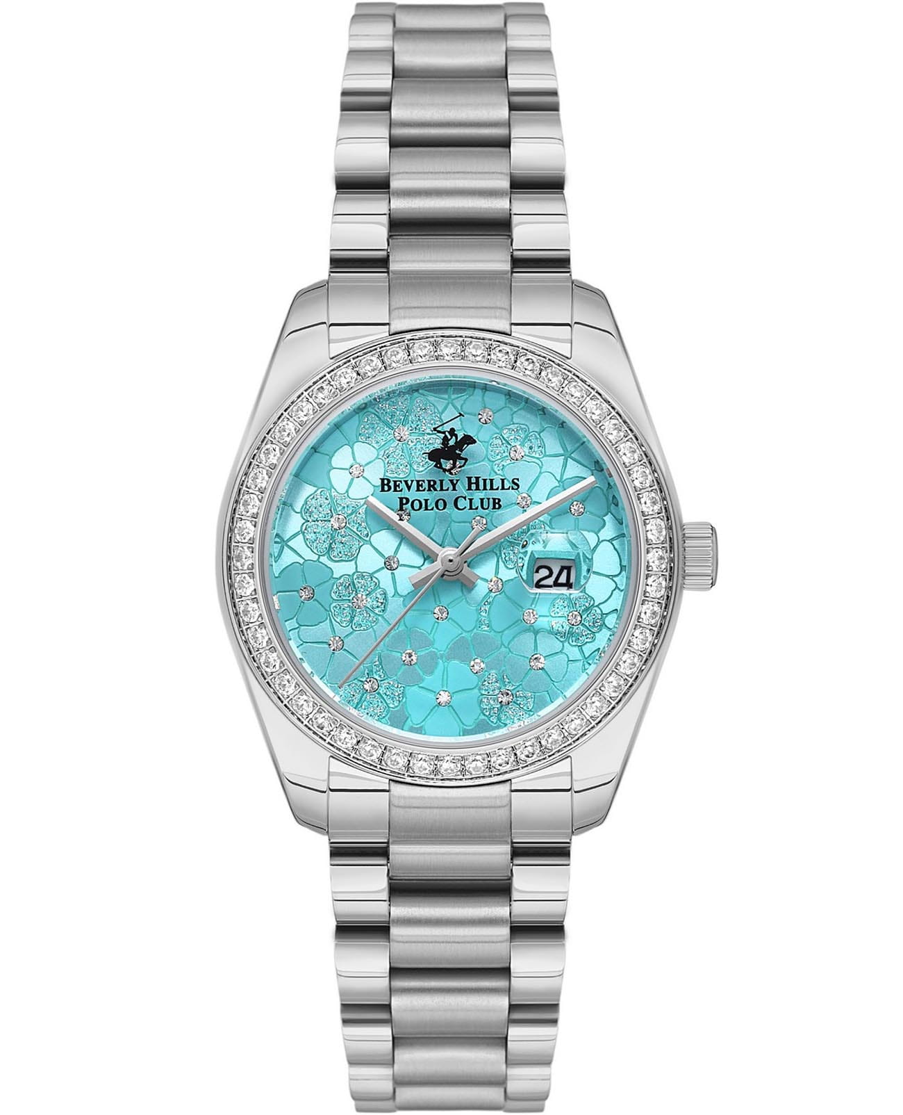 Женские часы Beverly Hills Polo BP3596C.300 с надёжным кварцевым механизмом. Минеральное стеклоМинеральное стеклоМинеральное стекло представляет собой искусственно выращенный минерал кварца. Такое стекло отличается особой устойчивостью к повреждениям и царапинам. Уступает по некоторым качествам сапфировому стеклу. устойчивое к появлению царапин, обладающее высокой прозрачностью. Класс водозащиты: 50 метров, позволит защитить корпус от случайных брызг или капель дождя. Корпус и браслет часов изготовлены из нержавеющей стали. Стальной браслет на застёжке-бабочке с кнопкамиЗастёжка "бабочка"Такой вид застёжки дополняется предохранителями, помогающими избежать случайного раскрытия браслета. Обладают изящным исполнением. . Циферблат и безельБезельВнешний ободок, закрепляющий стекло. В спортивных часах так называется поворотное кольцо с делениями на циферблате, выполняет роль таймера – замеряет отрезки времени на шкале. Неподвижный безель – элемент декора. Однонаправленно вращающийся безель на дайверских часах позволяет фиксировать моменты погружения и выныривания на поверхность. инкрустирован кристаллами циркония. Окошко дня недели находится в положении 3 часа.
