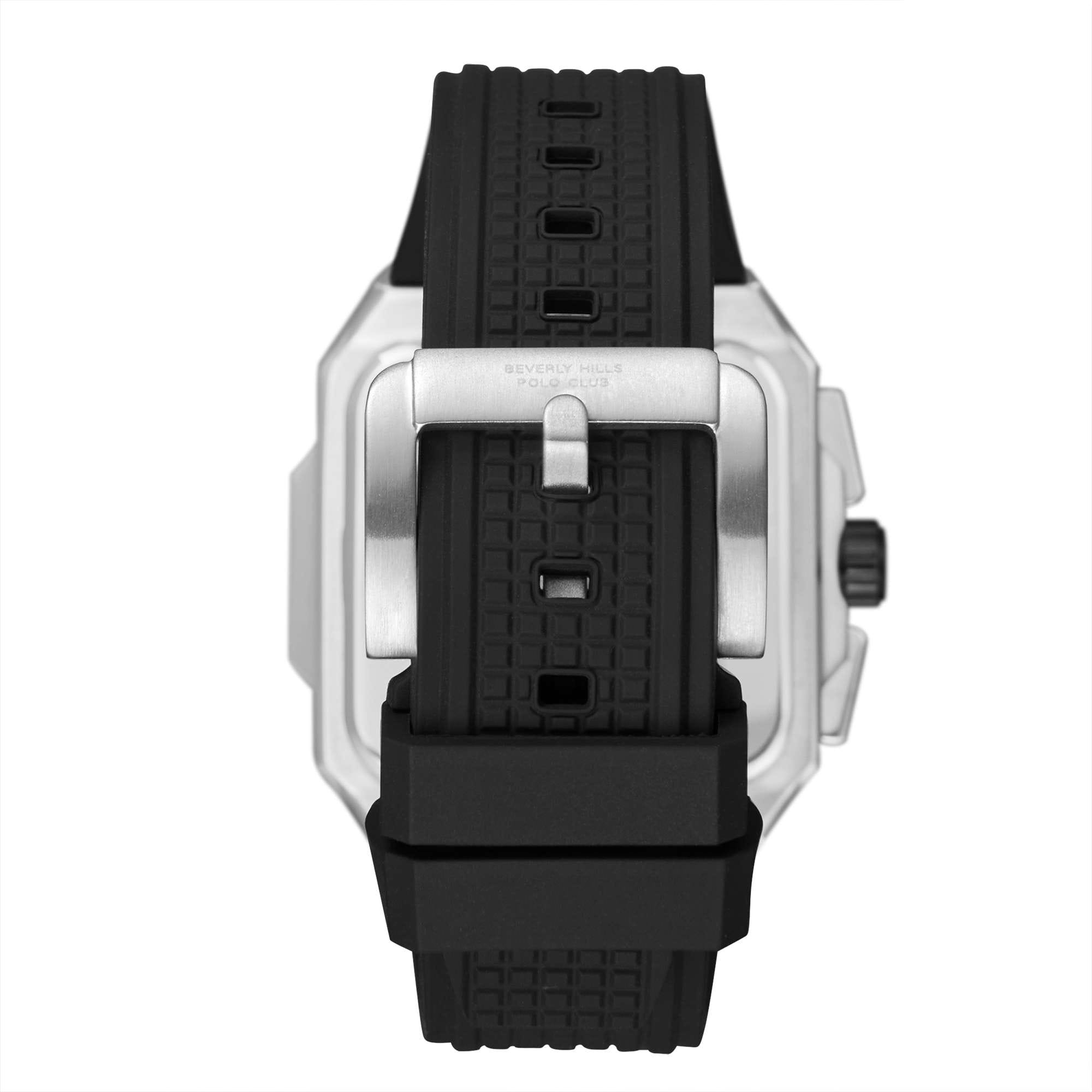 Мужские кварцевые часы Beverly Hills Polo Club — это гармоничное сочетание силы, стиля и современных технологий. Корпус размером 40×40 мм выполнен из нержавеющей стали. БезельБезельВнешний ободок, закрепляющий стекло. В спортивных часах так называется поворотное кольцо с делениями на циферблате, выполняет роль таймера – замеряет отрезки времени на шкале. Неподвижный безель – элемент декора. Однонаправленно вращающийся безель на дайверских часах позволяет фиксировать моменты погружения и выныривания на поверхность. с IP-покрытиемIP-покрытиеМетод ионного напыления. Демонстрирует повышенную устойчивость к истиранию, окислению и химическим веществам. Под воздействием высокого давления и температуры около 1500°C молекулы металла надёжно соединяются с частицами корпуса часов.. Циферблат чёрного цвета оформлен штрихами, стрелками и тремя вынесенными субциферблатами: для отображения дня недели, даты и 24-часового формата времени. Стрелки с люминесцентным покрытиемЛюминесцентное покрытиеПозволяет считывать показания времени в темноте. Производители наносят на стрелки, часовые индексы, безель или поверхность циферблата светонакопительный состав, дающий холодное свечение., обеспечивающим хорошую читаемость в темноте. Циферблат защищён минеральным стекломМинеральное стеклоМинеральное стекло представляет собой искусственно выращенный минерал кварца. Такое стекло отличается особой устойчивостью к повреждениям и царапинам. Уступает по некоторым качествам сапфировому стеклу.. Часы оснащены каучуковым ремешком на классической пряжке. Водонепроницаемость 100 м позволяет использовать часы для плавания и повседневного ношения. Идеальный выбор для тех, кто ценит американское качество и универсальный дизайн.