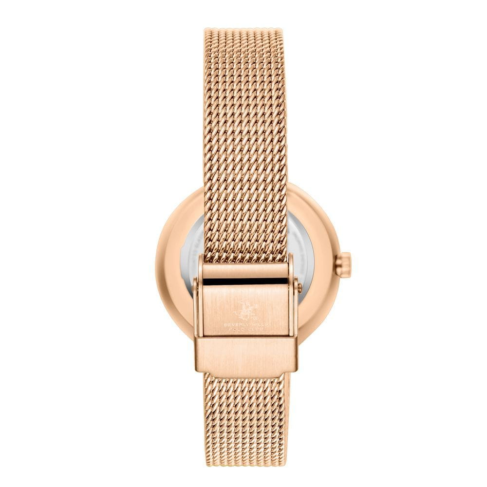 Beverly Hills Polo Club BP3760X.440 — женские часы, сочетающие изящество и функциональность в компактном формате. Корпус из стали диаметром 30 мм и браслет украшены IP‑покрытиемIP-покрытиеМетод ионного напыления. Демонстрирует повышенную устойчивость к истиранию, окислению и химическим веществам. Под воздействием высокого давления и температуры около 1500°C молекулы металла надёжно соединяются с частицами корпуса часов. золотого оттенка, создавая благородный дизайн. Стрелки и метки выполнены в золоте, подчёркивая элегантность и визуальную лёгкость. Механизм — точный кварцевый, надёжный и неприхотливый, требующий только замены батареи раз в 1–2 года . Циферблат покрыт прочным минеральным стекломМинеральное стеклоМинеральное стекло представляет собой искусственно выращенный минерал кварца. Такое стекло отличается особой устойчивостью к повреждениям и царапинам. Уступает по некоторым качествам сапфировому стеклу., устойчивым к царапинам и сохраняющим безупречный внешний вид . Браслет миланского плетения на раскладном замкеРаскладной замокДанный вариант застежки используется только на часах с металлическим браслетом. Отличительная особенность такого крепления в том, что длина браслета становится универсальной и вы можете самостоятельно отрегулировать нужный вам размер – застежка просто двигается по браслету часов., обеспечивая плавное и надёжное прилегание. Водозащита на уровне 3 ATM (≈30 м) защищает от брызг и случайных осадков . Beverly Hills Polo Club — утончённый аксессуар для женщин, ценящих стиль, надёжность и изысканные детали, где каждая функция подчёркнута строгой, но изящной эстетикой. Элегантный браслет в комплекте выполнен из стали с золотым покрытием и гармонично сочетается с дизайном часов. Универсальная форма и качественная застёжка обеспечивают комфорт при ношении, а лаконичный стиль делает его идеальным дополнением к образу — как для повседневной носки, так и для особых случаев.