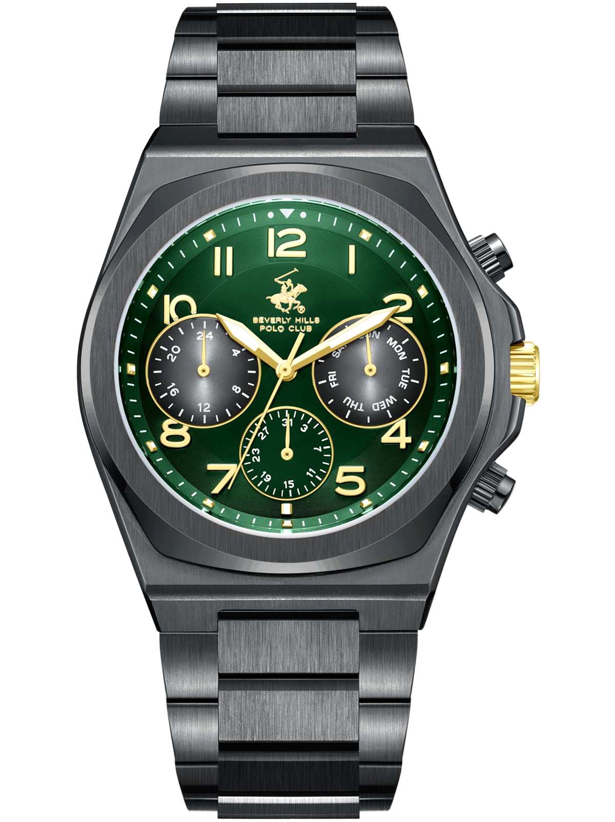 Американские мужские часы Beverly Hills Polo Club BP3777X.670 - это стильный мужской аксессуар, который сочетает элегантный дизайн и практичность. Корпус выполнен из нержавеющей стали с IP-покрытиемIP-покрытиеМетод ионного напыления. Демонстрирует повышенную устойчивость к истиранию, окислению и химическим веществам. Под воздействием высокого давления и температуры около 1500°C молекулы металла надёжно соединяются с частицами корпуса часов. черного цвета, диаметром 42 мм, что обеспечивает долговечность и утончённый внешний вид. Надежное минеральное стеклоМинеральное стеклоМинеральное стекло представляет собой искусственно выращенный минерал кварца. Такое стекло отличается особой устойчивостью к повреждениям и царапинам. Уступает по некоторым качествам сапфировому стеклу. с сапфировым покрытием защищает циферблат от царапин и обеспечивает долговечность. Модель оснащена кварцевым механизмом, обеспечивающим высокую точность хода. Стальной браслет с IP-покрытиемIP-покрытиеМетод ионного напыления. Демонстрирует повышенную устойчивость к истиранию, окислению и химическим веществам. Под воздействием высокого давления и температуры около 1500°C молекулы металла надёжно соединяются с частицами корпуса часов. на раскладной застёжкеРаскладная застёжкаТакой тип застёжки используется только на браслетах из металла. Она никогда не раскрывается полностью, происходит разделение на 2 и более частей. Раскладывающая застёжка снизит вероятность потери часов к минимуму. обеспечивает комфортное ношение. Функциональность модели расширена за счёт индикации дня недели, с дополнительным 24-х часовым индикатором. Стрелки с люминесцентным покрытиемЛюминесцентное покрытиеПозволяет считывать показания времени в темноте. Производители наносят на стрелки, часовые индексы, безель или поверхность циферблата светонакопительный состав, дающий холодное свечение. позволяют легко считывать время даже в условиях недостаточного освещения. Водозащита 50 метров позволит защитить корпус от случайных брызг или капель дождя. Эта модель – отличный выбор для тех, кто ищет сочетание стиля, качества и функциональности. Часы станут не только полезным аксессуаром, но и выразительным элементом вашего имиджа.