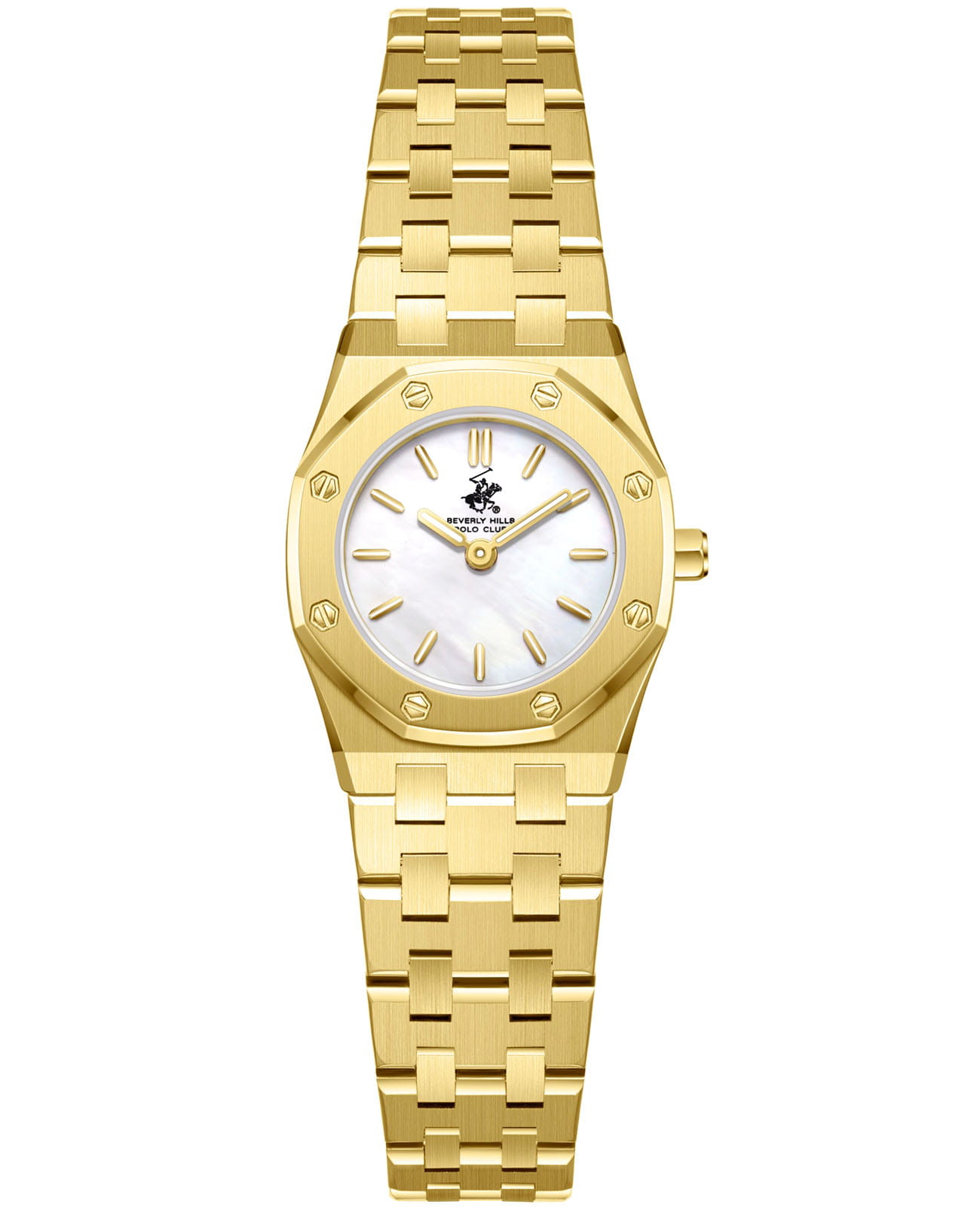 Американские женские часы Beverly Hills Polo Club BP3798X.120 - это стильный женский аксессуар, который сочетает элегантный дизайн и практичность. Корпус выполнен из нержавеющей стали с IP-покрытиемIP-покрытиеМетод ионного напыления. Демонстрирует повышенную устойчивость к истиранию, окислению и химическим веществам. Под воздействием высокого давления и температуры около 1500°C молекулы металла надёжно соединяются с частицами корпуса часов. золотистого цвета, диаметром 23 мм, что обеспечивает долговечность и утончённый внешний вид. Надежное минеральное стеклоМинеральное стеклоМинеральное стекло представляет собой искусственно выращенный минерал кварца. Такое стекло отличается особой устойчивостью к повреждениям и царапинам. Уступает по некоторым качествам сапфировому стеклу. с сапфировым покрытием защищает циферблат от царапин и обеспечивает долговечность. Метки в виде штрихов. Модель оснащена кварцевым механизмом, обеспечивающим высокую точность хода. Стальной браслет на застёжке-бабочке с кнопкамиЗастёжка "бабочка"Такой вид застёжки дополняется предохранителями, помогающими избежать случайного раскрытия браслета. Обладают изящным исполнением. обеспечивает комфортное ношение. Стрелки и метки оснащены люминесцентным покрытиемЛюминесцентное покрытиеПозволяет считывать показания времени в темноте. Производители наносят на стрелки, часовые индексы, безель или поверхность циферблата светонакопительный состав, дающий холодное свечение., обеспечивающим отличную видимость даже при слабом освещении. Водозащита 30 метров позволит защитить корпус от случайных брызг или капель дождя. Эта модель – отличный выбор для тех, кто ищет сочетание стиля, качества и функциональности. Часы станут не только полезным аксессуаром, но и выразительным элементом вашего имиджа.