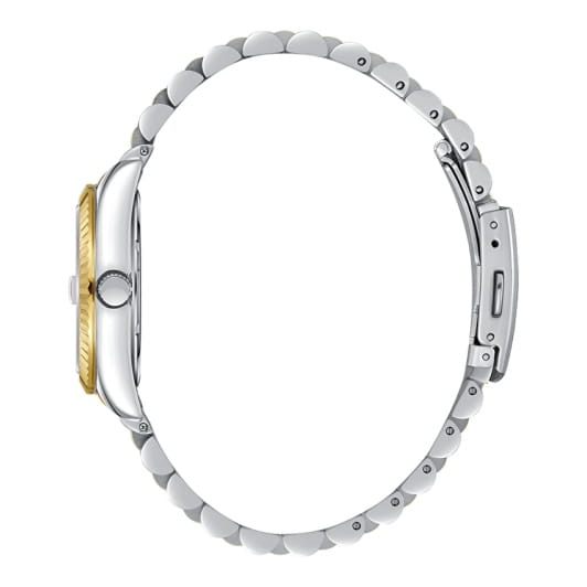 Американские женские часы Beverly Hills Polo Club BP3801X.270 - это стильный женский аксессуар, который сочетает элегантный дизайн и практичность. Корпус выполнен из нержавеющей стали серебристого цвета, диаметром 32 мм, что обеспечивает долговечность и утончённый внешний вид. Надежное минеральное стеклоМинеральное стеклоМинеральное стекло представляет собой искусственно выращенный минерал кварца. Такое стекло отличается особой устойчивостью к повреждениям и царапинам. Уступает по некоторым качествам сапфировому стеклу. с сапфировым покрытием защищает циферблат от царапин и обеспечивает долговечность. Неподвижный рифленый безельБезельВнешний ободок, закрепляющий стекло. В спортивных часах так называется поворотное кольцо с делениями на циферблате, выполняет роль таймера – замеряет отрезки времени на шкале. Неподвижный безель – элемент декора. Однонаправленно вращающийся безель на дайверских часах позволяет фиксировать моменты погружения и выныривания на поверхность. с IP-покрытиемIP-покрытиеМетод ионного напыления. Демонстрирует повышенную устойчивость к истиранию, окислению и химическим веществам. Под воздействием высокого давления и температуры около 1500°C молекулы металла надёжно соединяются с частицами корпуса часов. золотого цвета. Метки инкрустированы цирконами. Модель оснащена кварцевым механизмом, обеспечивающим высокую точность хода. Стальной браслет с частичным IP-покрытиемIP-покрытиеМетод ионного напыления. Демонстрирует повышенную устойчивость к истиранию, окислению и химическим веществам. Под воздействием высокого давления и температуры около 1500°C молекулы металла надёжно соединяются с частицами корпуса часов. на раскладной застёжкеРаскладная застёжкаТакой тип застёжки используется только на браслетах из металла. Она никогда не раскрывается полностью, происходит разделение на 2 и более частей. Раскладывающая застёжка снизит вероятность потери часов к минимуму. обеспечивает комфортное ношение. Водозащита 30 метров позволит защитить корпус от случайных брызг или капель дождя. Эта модель – отличный выбор для тех, кто ищет сочетание стиля, качества и функциональности. Часы станут не только полезным аксессуаром, но и выразительным элементом вашего имиджа.