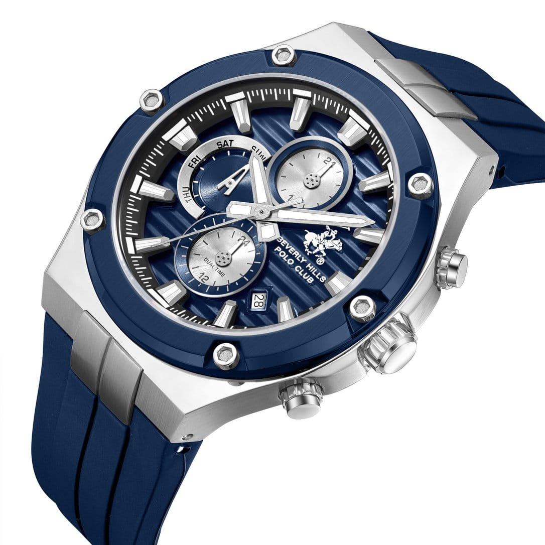 BEVERLY HILLS POLO CLUB BP3822X.399 — стильные мужские часы, сочетающие спортивную динамику и функциональность. Крупный корпус выполнен из нержавеющей стали серебристого цвета, диаметром 46,5 мм, гармонично дополнен каучуковым ремешком на стандартной застежке, что обеспечивает комфортное ношение. Минеральное стеклоМинеральное стеклоМинеральное стекло представляет собой искусственно выращенный минерал кварца. Такое стекло отличается особой устойчивостью к повреждениям и царапинам. Уступает по некоторым качествам сапфировому стеклу. с сапфировым покрытием защищает циферблат от царапин, а кварцевый механизм обеспечивает высокую точность. Благодаря своей универсальной эстетике эти часы уместны и в деловой среде, и в повседневном образе. Стрелки и метки с люминесцентным покрытиемЛюминесцентное покрытиеПозволяет считывать показания времени в темноте. Производители наносят на стрелки, часовые индексы, безель или поверхность циферблата светонакопительный состав, дающий холодное свечение., обеспечивающим хорошую читаемость в темноте. Неподвижный безельБезельВнешний ободок, закрепляющий стекло. В спортивных часах так называется поворотное кольцо с делениями на циферблате, выполняет роль таймера – замеряет отрезки времени на шкале. Неподвижный безель – элемент декора. Однонаправленно вращающийся безель на дайверских часах позволяет фиксировать моменты погружения и выныривания на поверхность. с IP-покрытиемIP-покрытиеМетод ионного напыления. Демонстрирует повышенную устойчивость к истиранию, окислению и химическим веществам. Под воздействием высокого давления и температуры около 1500°C молекулы металла надёжно соединяются с частицами корпуса часов. синего цвета. Указатель дня недели вынесен на отдельный циферблат, также присутствует индикация 24-часового формата времени. Окошко даты находится в положении между 4 и 5 часов. Идеальный выбор для тех, кто ценит элегантный дизайн и качество. Водозащита до 50 метров позволит защитить корпус от случайных брызг или капель дождя.