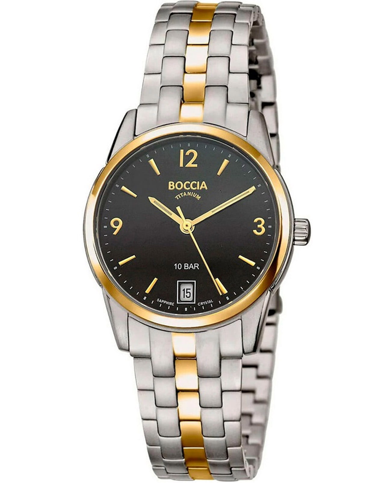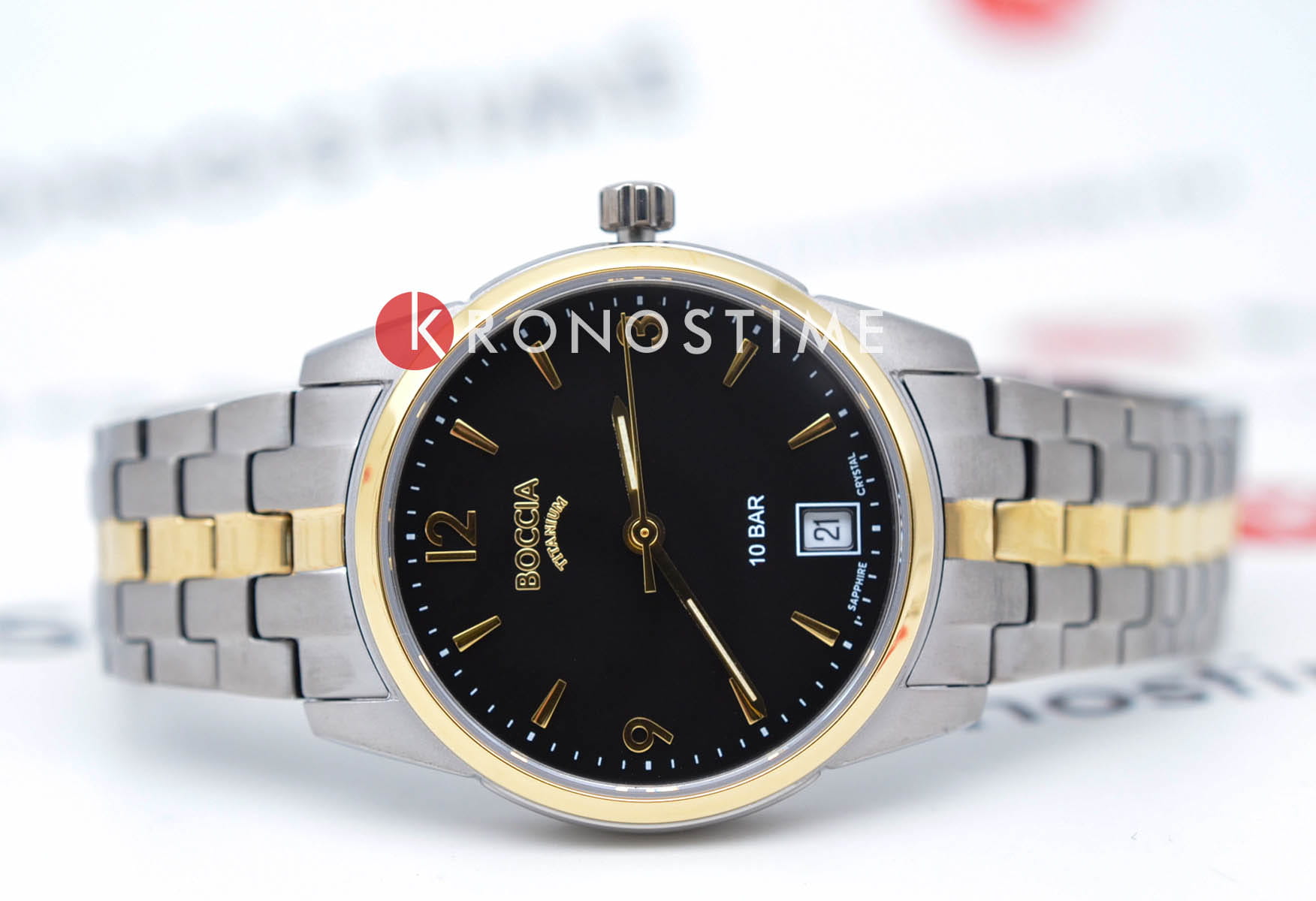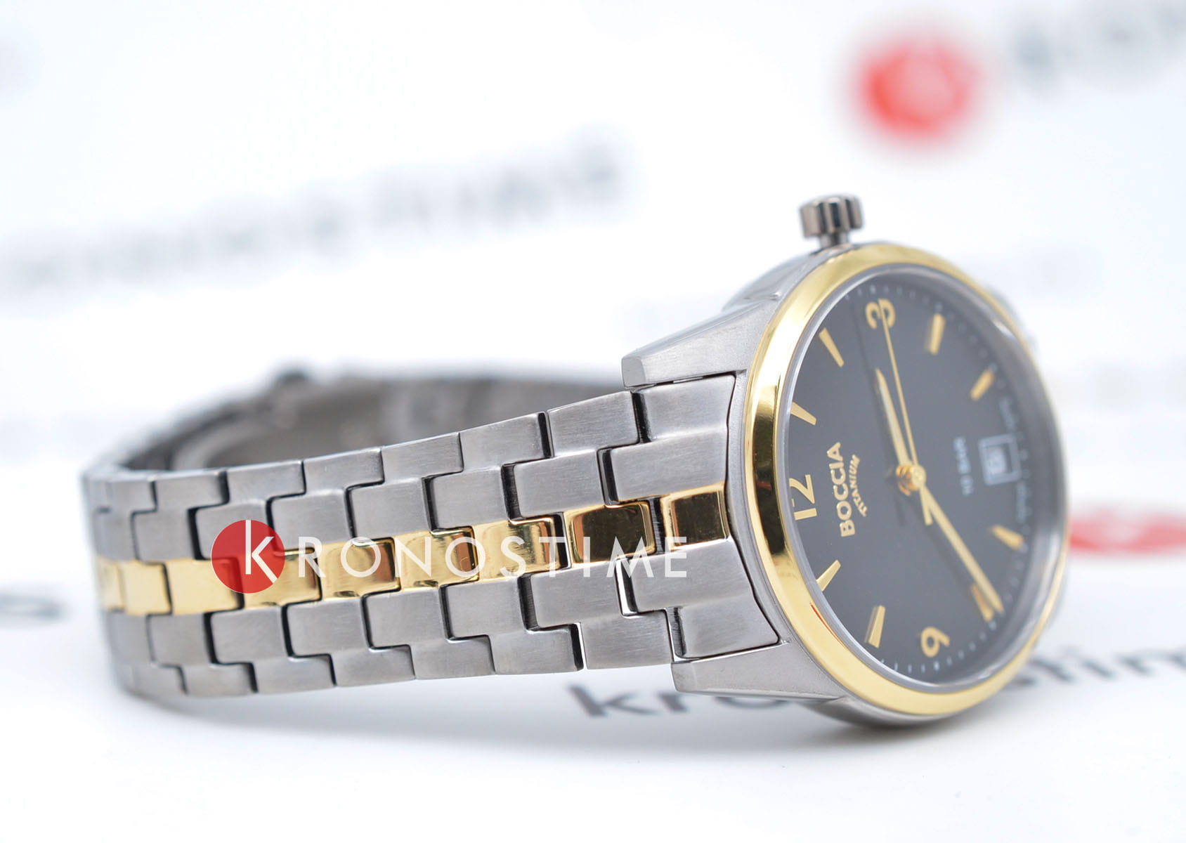 Мужские немецкие титановые часы Boccia Titanium 3272-05, кварцевый механизм с высокой точностью. Сапфировое стеклоСапфировое стеклоПрочный и надёжный материал из кристалла сапфира синтетического происхождения, характеризующийся особой твёрдостью и устойчивостью к царапинам и повреждениям. устойчивое к появлению царапин, обладающее высокой прозрачностью. Корпус изготовлен из титана. Класс водозащиты: 50 метров, позволит защитить корпус от случайных брызг или капель дождя. БезельБезельВнешний ободок, закрепляющий стекло. В спортивных часах так называется поворотное кольцо с делениями на циферблате, выполняет роль таймера – замеряет отрезки времени на шкале. Неподвижный безель – элемент декора. Однонаправленно вращающийся безель на дайверских часах позволяет фиксировать моменты погружения и выныривания на поверхность. с PVD-покрытиемPVDУльтратонкое покрытие наносится в технике вакуумного напыления, сочетает в себе нитрид титана особой прочности со слоем золота или оксида хрома. Несёт в себе декоративную или защитную функцию.. Титановый браслет на раскладной застёжкеРаскладная застёжкаТакой тип застёжки используется только на браслетах из металла. Она никогда не раскрывается полностью, происходит разделение на 2 и более частей. Раскладывающая застёжка снизит вероятность потери часов к минимуму. с частичным PVD-покрытиемPVDУльтратонкое покрытие наносится в технике вакуумного напыления, сочетает в себе нитрид титана особой прочности со слоем золота или оксида хрома. Несёт в себе декоративную или защитную функцию..
