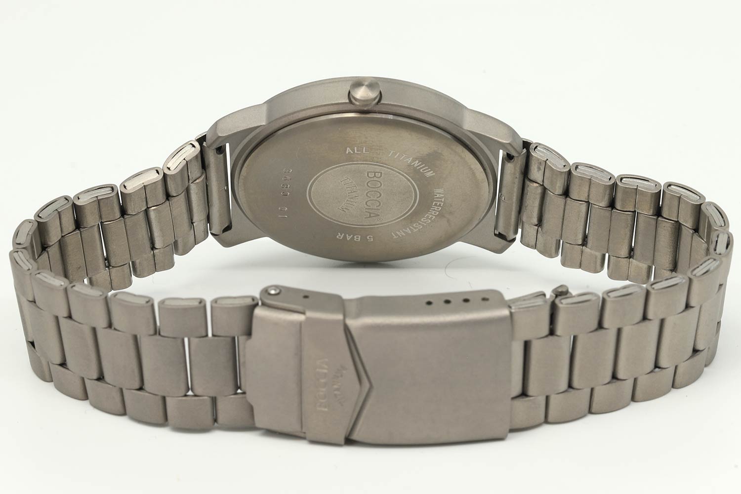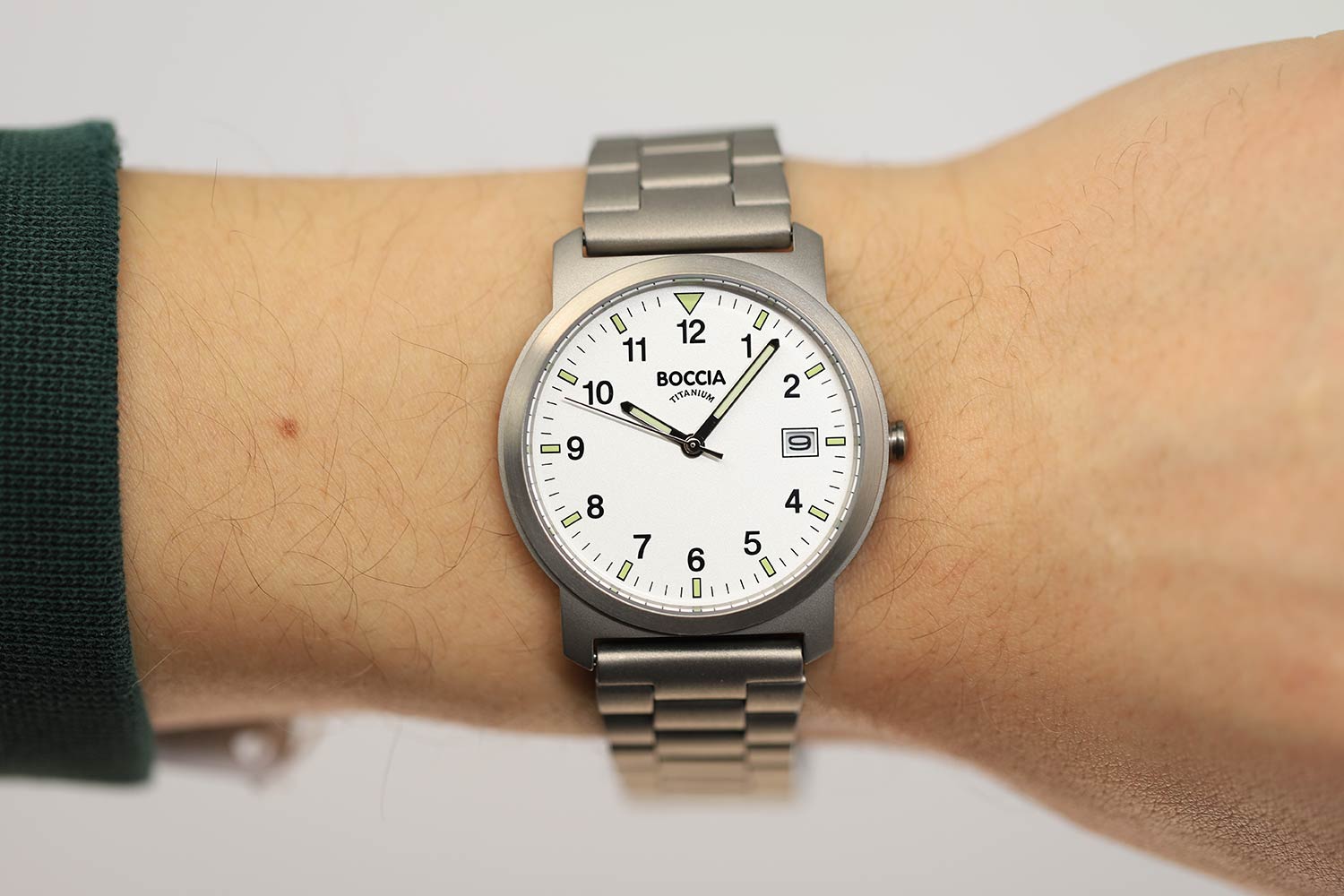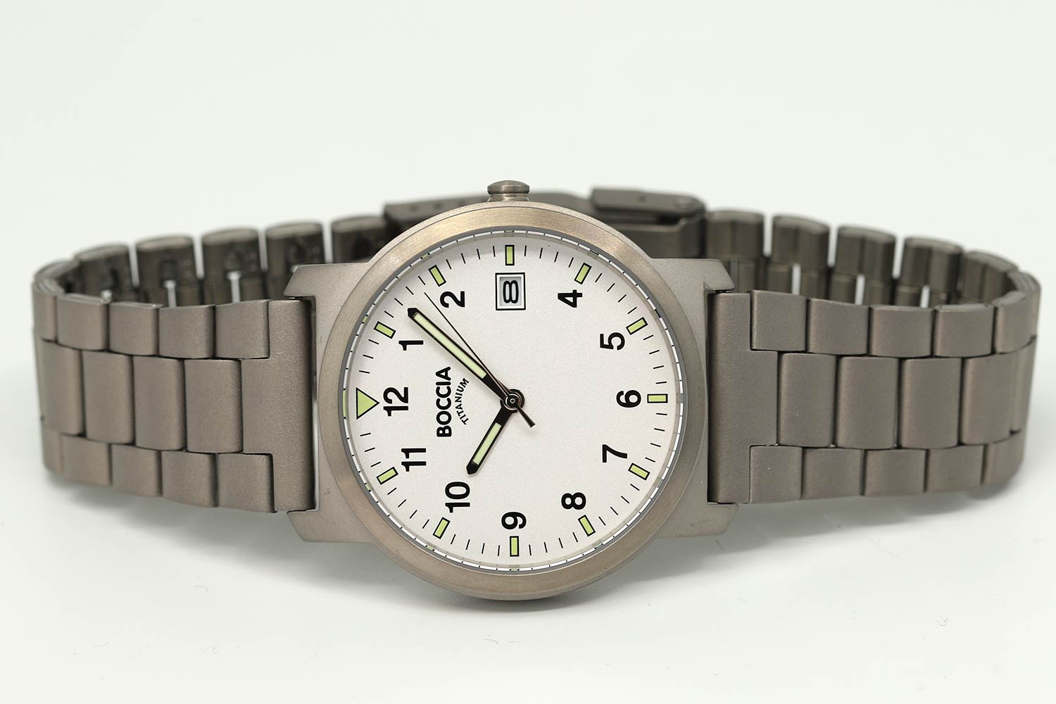 Мужские наручные часы Boccia Titanium 3630-01 с надёжным кварцевым механизмом. Корпус и браслет часов изготовлены из титана. Минеральное стеклоМинеральное стеклоМинеральное стекло представляет собой искусственно выращенный минерал кварца. Такое стекло отличается особой устойчивостью к повреждениям и царапинам. Уступает по некоторым качествам сапфировому стеклу. устойчивое к мелким механическим повреждениям. Класс водозащиты: 50 метров, позволит защитить корпус от случайных брызг или капель дождя. Окошко даты в положении 3 часа. Титановый браслет на раскладной застёжкеРаскладная застёжкаТакой тип застёжки используется только на браслетах из металла. Она никогда не раскрывается полностью, происходит разделение на 2 и более частей. Раскладывающая застёжка снизит вероятность потери часов к минимуму.. Стрелки и метки с люминесцентным покрытиемЛюминесцентное покрытиеПозволяет считывать показания времени в темноте. Производители наносят на стрелки, часовые индексы, безель или поверхность циферблата светонакопительный состав, дающий холодное свечение..
