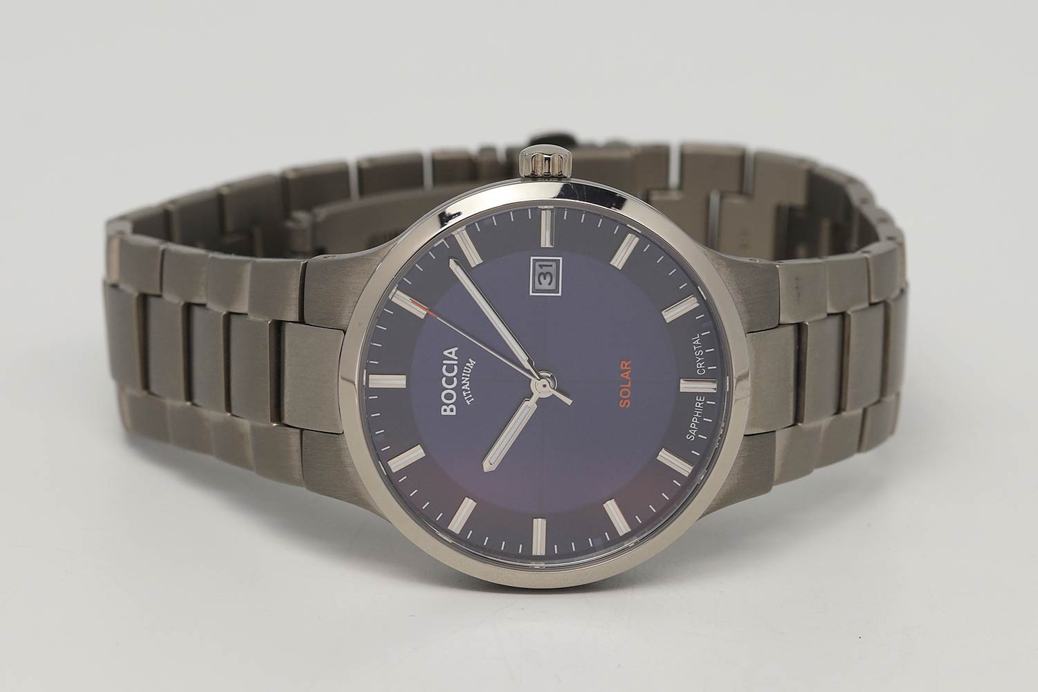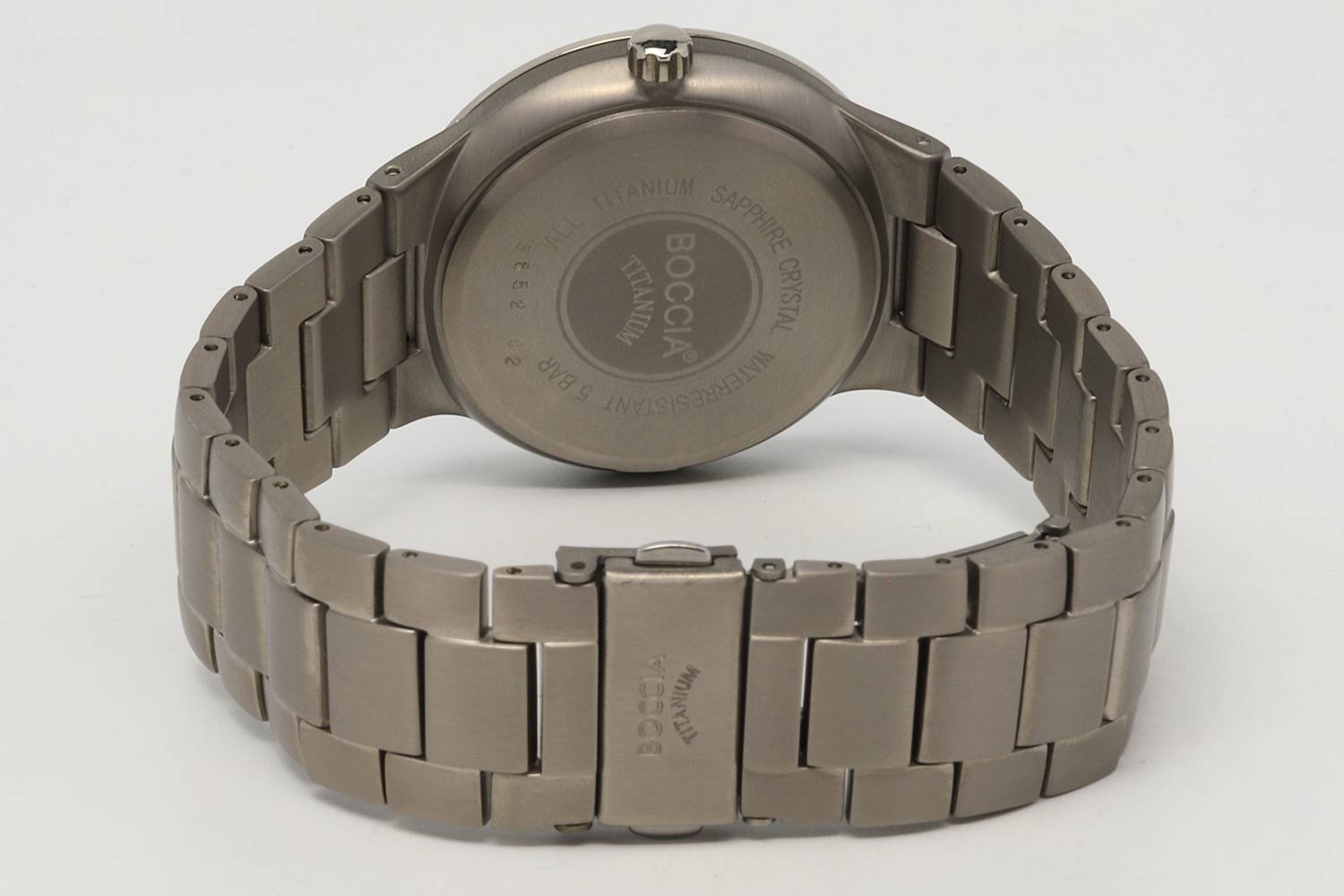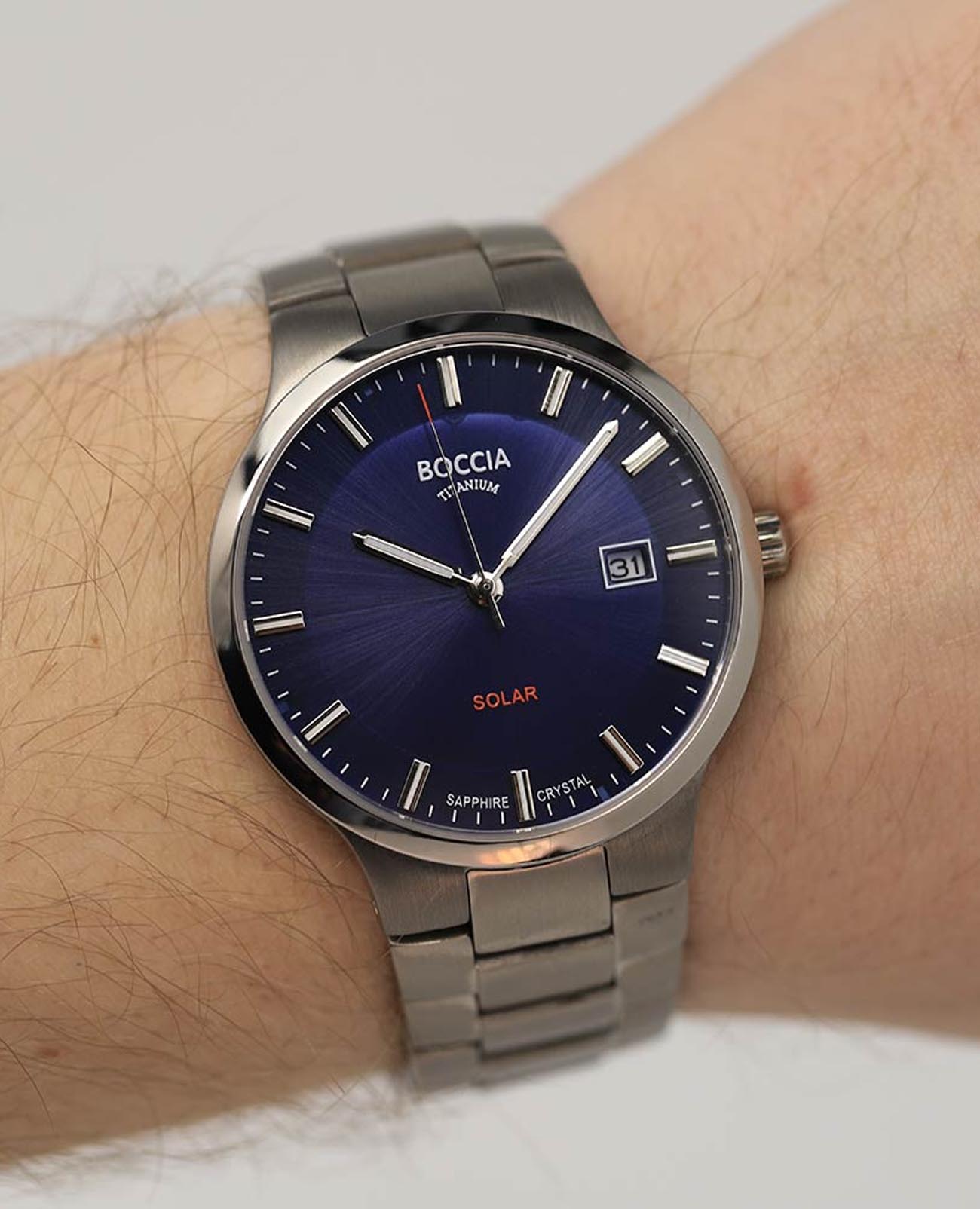 Мужские наручные часы Boccia Titanium 3652-02 с солнечной батареей. Сапфировое стеклоСапфировое стеклоПрочный и надёжный материал из кристалла сапфира синтетического происхождения, характеризующийся особой твёрдостью и устойчивостью к царапинам и повреждениям. устойчивое к мелким механическим повреждениям. Корпус и браслет часов изготовлены из титана. Титановый браслет на раскладной застёжкеРаскладная застёжкаТакой тип застёжки используется только на браслетах из металла. Она никогда не раскрывается полностью, происходит разделение на 2 и более частей. Раскладывающая застёжка снизит вероятность потери часов к минимуму.. Класс водозащиты: 50 метров, позволит защитить корпус от случайных брызг или капель дождя. Стрелки и метки с люминесцентным покрытиемЛюминесцентное покрытиеПозволяет считывать показания времени в темноте. Производители наносят на стрелки, часовые индексы, безель или поверхность циферблата светонакопительный состав, дающий холодное свечение.. Окошки даты находится в положении 3 часа.