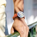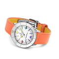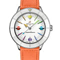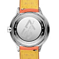 Класс водозащиты: 100 метров, позволит плавать, нырять и заниматься другими водными видами спорта. Корпус часов изготовлен из нержавеющей стали, серебристого цвета. Ремешок из телячьей кожи мандаринового цвета со складной клипсой.