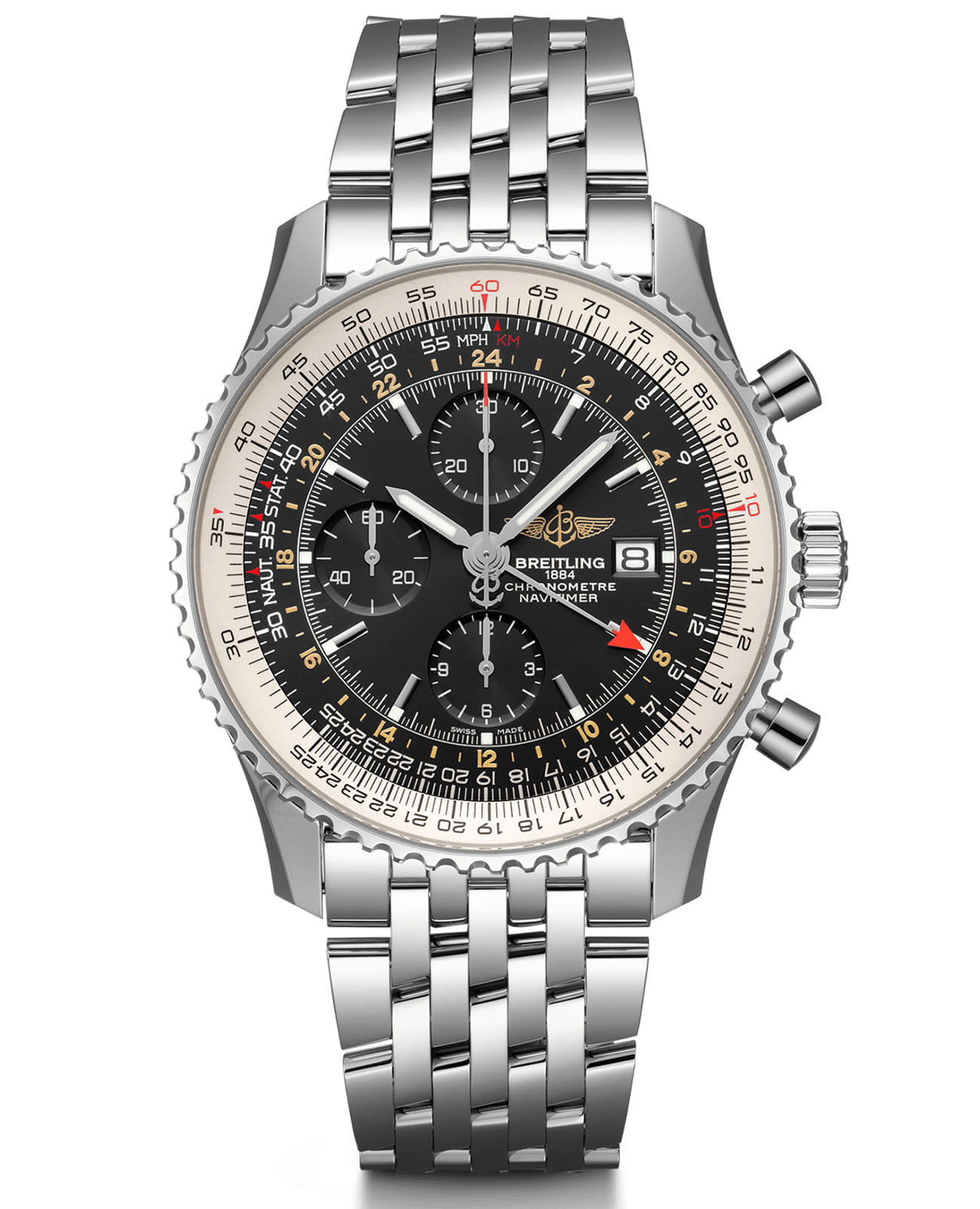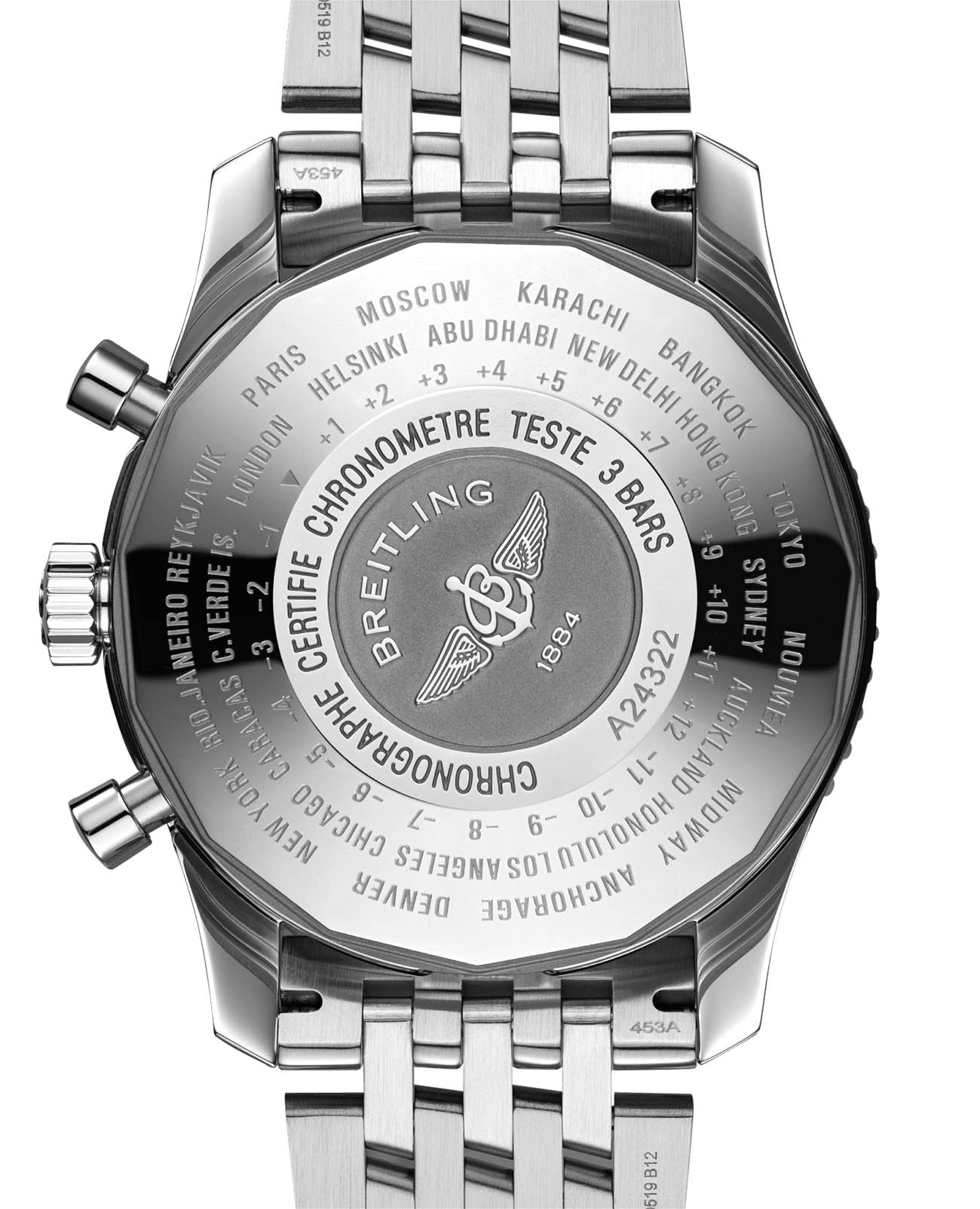 Мужские швейцарские часы-хронограф с секундомером Breitling Navitimer Chronograph GMT 46 A24322121B1A1, механический механизм (автоматический калибр) с высокой точностью. Сапфировое стеклоСапфировое стеклоПрочный и надёжный материал из кристалла сапфира синтетического происхождения, характеризующийся особой твёрдостью и устойчивостью к царапинам и повреждениям. устойчивое к появлению царапин, обладающее высокой прозрачностью. Класс водозащиты: 30 метров, позволит защитить корпус от случайных брызг или капель дождя. Корпус часов изготовлен из нержавеющей стали. Стальной браслет на застёжке-бабочке с кнопкамиЗастёжка "бабочка"Такой вид застёжки дополняется предохранителями, помогающими избежать случайного раскрытия браслета. Обладают изящным исполнением. . Стрелки и метки с люминесцентным покрытиемЛюминесцентное покрытиеПозволяет считывать показания времени в темноте. Производители наносят на стрелки, часовые индексы, безель или поверхность циферблата светонакопительный состав, дающий холодное свечение.. Шкала тахиметра на циферблате. Окошко даты находится в положении 3 часов. Калибр Breitling Caliber 24