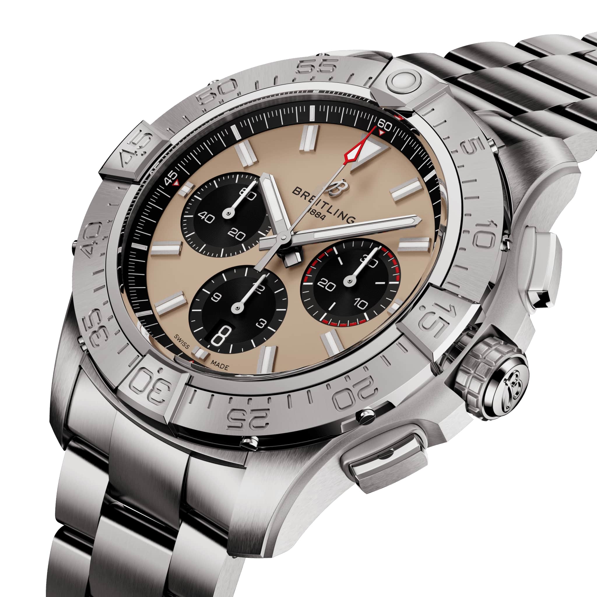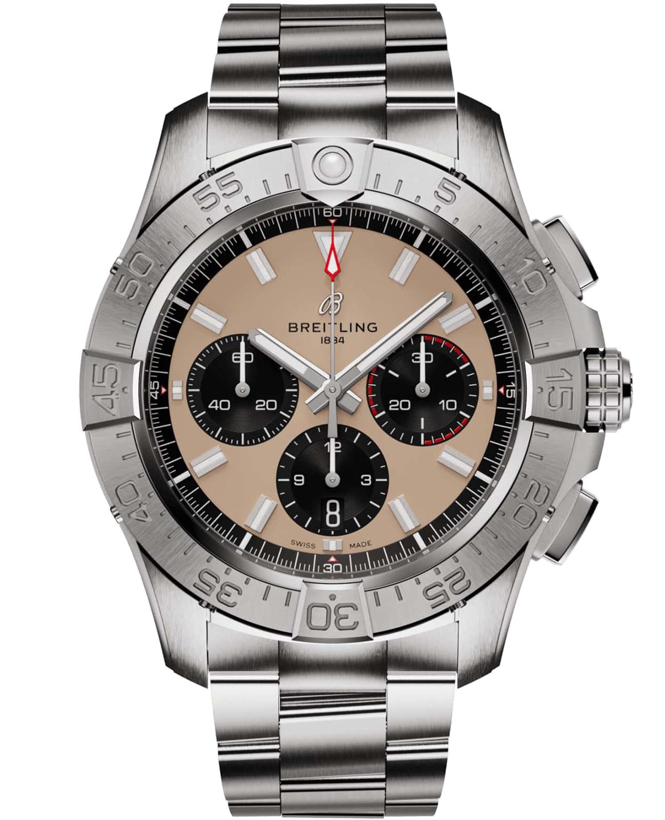 Breitling Avenger B01 Chronograph 44 с референсным номером AB0147101A1A1 — элегантные мужские часы, сочетающие стиль и функциональность. Корпус диаметром 44 мм выполнен из нержавеющей стали, что обеспечивает прочность и долговечность. Сапфировое стеклоСапфировое стеклоПрочный и надёжный материал из кристалла сапфира синтетического происхождения, характеризующийся особой твёрдостью и устойчивостью к царапинам и повреждениям. с антибликовым покрытием с обеих сторон защищает циферблат и обеспечивает отличную читаемость. Бежевый матовый циферблат с накладными часовыми метками и стрелками, покрытыми люминесцентным покрытиемЛюминесцентное покрытиеПозволяет считывать показания времени в темноте. Производители наносят на стрелки, часовые индексы, безель или поверхность циферблата светонакопительный состав, дающий холодное свечение., гарантирует превосходную видимость в любых условиях. Хронограф включает три счётчика: 60 секунд, 30 минут и 12 часов, а окошко даты расположено на отметке «3 часа». Часы оснащены автоматическим калибром Breitling 01, сертифицированным COSCСертификат COSCОфициальный сертификат, подтверждающий то, что часы ходят с особо высокой точностью. Для получения документа часы подвергаются тестовым испытаниям, разработанным швейцарским институтом тестирования хронометров COSC. Допустимая норма для механических часов -4/+6 секунд в день, для кварцевых моделей +/- 0,07 секунд в день.. Механизм имеет частоту 28 800 полуколебаний в час, 47 камней и запас хода около 70 часов. Водозащита до 30 ATM (300 метров) делает их подходящими для плавания и дайвинга. Браслет из нержавеющей стали с раскладной застёжкойРаскладная застёжкаТакой тип застёжки используется только на браслетах из металла. Она никогда не раскрывается полностью, происходит разделение на 2 и более частей. Раскладывающая застёжка снизит вероятность потери часов к минимуму. и предохранителем обеспечивает комфортное ношение и надёжную фиксацию. Breitling Avenger B01 Chronograph 44 AB0147101A1A1 — выбор для мужчин, которые ценят стиль, высокую функциональность и безупречное качество.