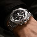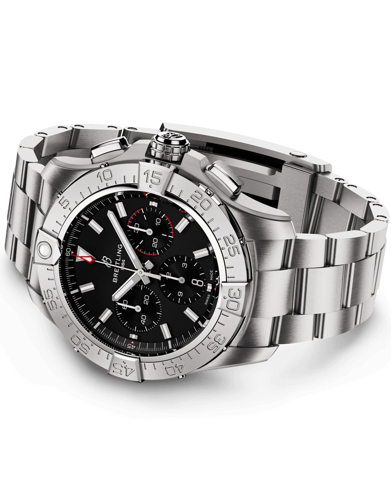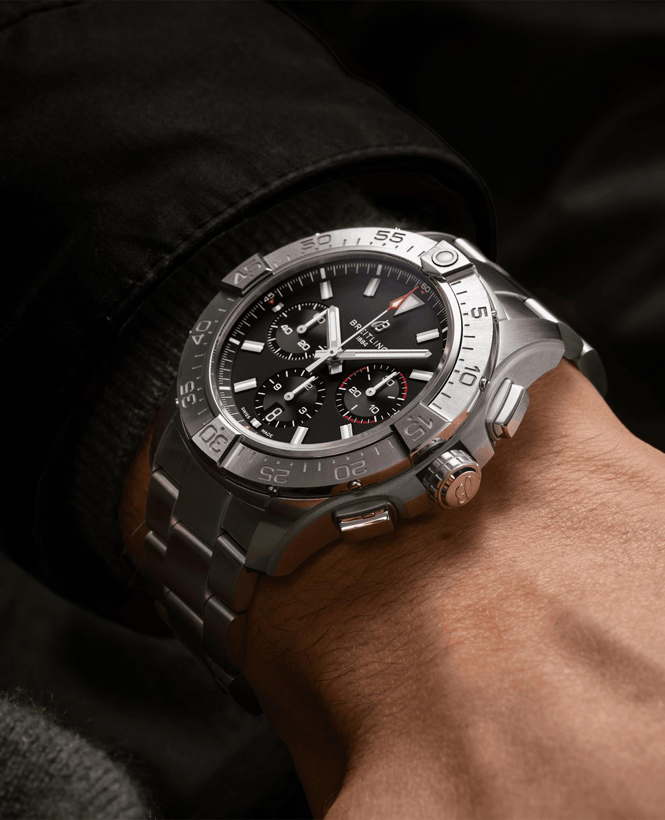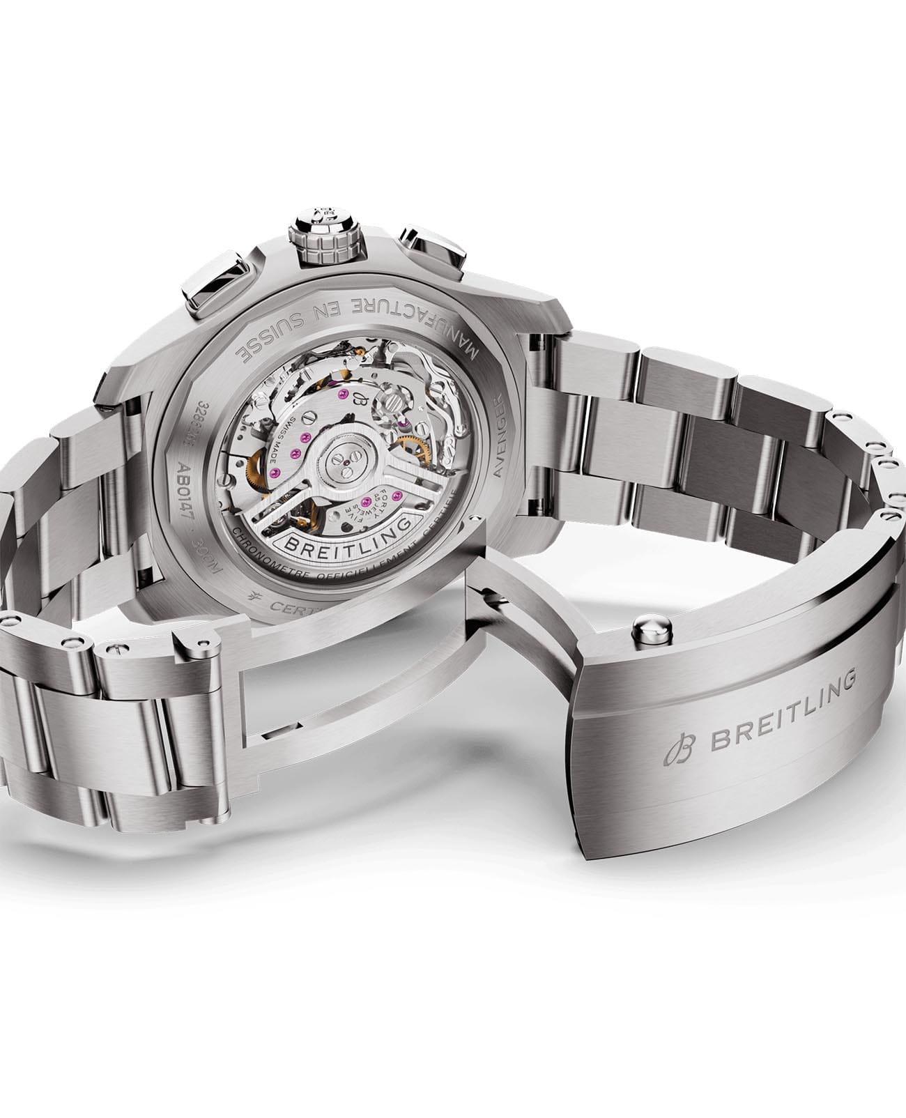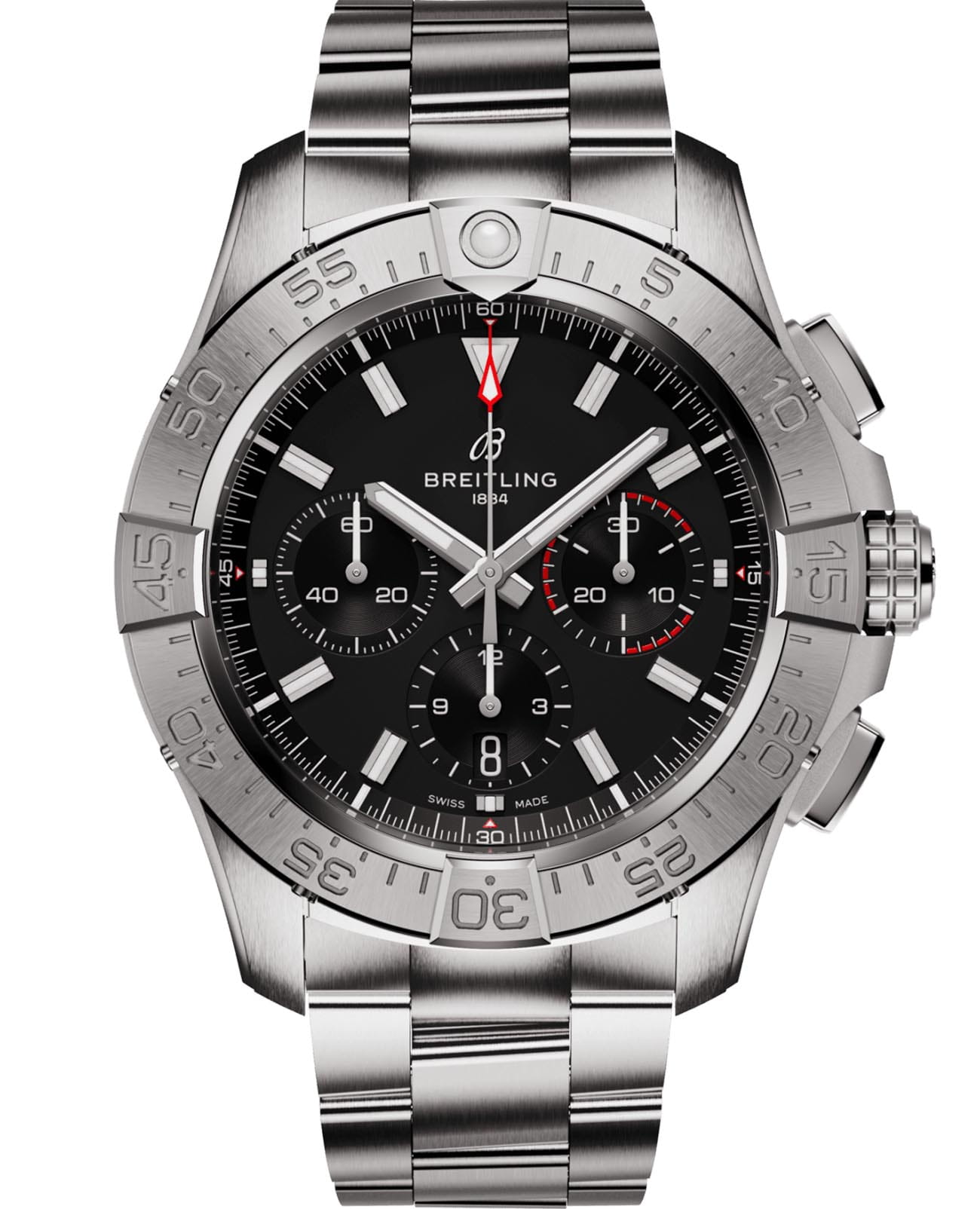 Мужские наручные часы c хронографомХронографФункция позволяет измерять отрезки времени с особой точностью: часы, минуты, секунды. Верным признаком хронографа является наличие на циферблате 3 дополнительных окошек-счётчиков. Breitling Avenger B01 Chronograph 44 AB0147101B1A1 с надёжным автоматическим механизмом. Корпус часов изготовлен из нержавеющей стали. Сапфировое стеклоСапфировое стеклоПрочный и надёжный материал из кристалла сапфира синтетического происхождения, характеризующийся особой твёрдостью и устойчивостью к царапинам и повреждениям. с антибликовым покрытием, устойчивое к мелким механическим повреждениям. Стальной браслет с раскладной застёжкойРаскладная застёжкаТакой тип застёжки используется только на браслетах из металла. Она никогда не раскрывается полностью, происходит разделение на 2 и более частей. Раскладывающая застёжка снизит вероятность потери часов к минимуму.. Стрелки и метки с люминесцентным покрытиемЛюминесцентное покрытиеПозволяет считывать показания времени в темноте. Производители наносят на стрелки, часовые индексы, безель или поверхность циферблата светонакопительный состав, дающий холодное свечение.. Однонаправленный безельБезельВнешний ободок, закрепляющий стекло. В спортивных часах так называется поворотное кольцо с делениями на циферблате, выполняет роль таймера – замеряет отрезки времени на шкале. Неподвижный безель – элемент декора. Однонаправленно вращающийся безель на дайверских часах позволяет фиксировать моменты погружения и выныривания на поверхность.. Класс водозащиты: 300 метров, позволит плавать, нырять и заниматься другими водными видами спорта.
