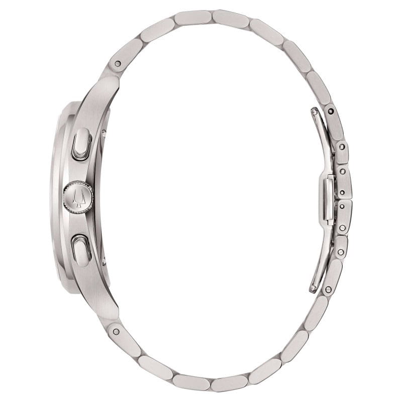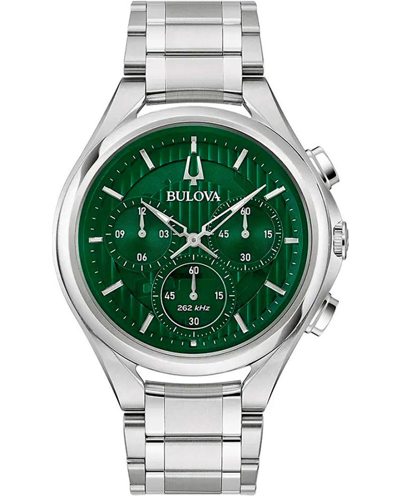 Мужские кварцевые часы-хронографХронографФункция позволяет измерять отрезки времени с особой точностью: часы, минуты, секунды. Верным признаком хронографа является наличие на циферблате 3 дополнительных окошек-счётчиков. Bulova CURV 96A297 – отражающий идеальное сочетание современного дизайна, надёжности и функциональности. Элегантный облик станет превосходным завершением образа, наделив его индивидуальным характером. Корпус из нержавеющей стали серебристого цвета, диаметром 44 мм идеально сбалансирован и элегантен. Защиту циферблата обеспечивает прочное сапфировое стеклоСапфировое стеклоПрочный и надёжный материал из кристалла сапфира синтетического происхождения, характеризующийся особой твёрдостью и устойчивостью к царапинам и повреждениям. с антибликовым покрытиемАнтибликовое покрытиеСлой оксида металла в 0,13-0,3 микрон, благодаря которому стекло часов не бликует и не отражает свет. Антибликовое покрытие уменьшает отражение света в 10 раз, обеспечивая отличную читаемость показателей циферблата. гарантирующее четкость показаний. Центральные часовая и минутная стрелки, секундная стрелка вынесена на малый циферблат. Стальной браслет на застёжке-бабочке с кнопкамиЗастёжка "бабочка"Такой вид застёжки дополняется предохранителями, помогающими избежать случайного раскрытия браслета. Обладают изящным исполнением. обеспечивает комфортное ношение. Водозащита 30 метров позволит защитить корпус от случайных брызг или капель дождя. Стрелки с люминесцентным покрытиемЛюминесцентное покрытиеПозволяет считывать показания времени в темноте. Производители наносят на стрелки, часовые индексы, безель или поверхность циферблата светонакопительный состав, дающий холодное свечение. позволяющие легко определять время даже в темноте. Эта модель – отличный выбор для тех, кто ищет сочетание стиля, качества и функциональности. Часы станут не только полезным аксессуаром, но и выразительным элементом вашего имиджа.