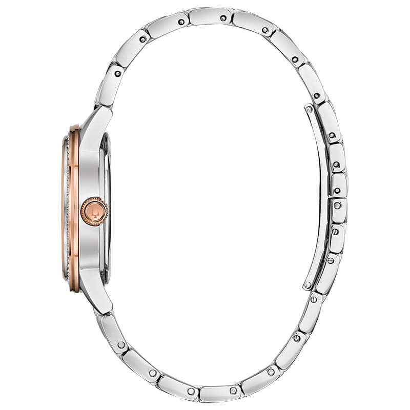 Женские кварцевые часы Bulova Crystal Ladies 98L246 – отражающий идеальное сочетание современного дизайна, надёжности и функциональности. Элегантный облик станет превосходным завершением образа, наделив его индивидуальным характером. Корпус из нержавеющей стали, диаметром 33 мм идеально сбалансирован и элегантен. Минеральное стеклоМинеральное стеклоМинеральное стекло представляет собой искусственно выращенный минерал кварца. Такое стекло отличается особой устойчивостью к повреждениям и царапинам. Уступает по некоторым качествам сапфировому стеклу. защищает циферблат от царапин и устойчивое к мелким механическим повреждениям. БезельБезельВнешний ободок, закрепляющий стекло. В спортивных часах так называется поворотное кольцо с делениями на циферблате, выполняет роль таймера – замеряет отрезки времени на шкале. Неподвижный безель – элемент декора. Однонаправленно вращающийся безель на дайверских часах позволяет фиксировать моменты погружения и выныривания на поверхность. с IP-покрытиемIP-покрытиеМетод ионного напыления. Демонстрирует повышенную устойчивость к истиранию, окислению и химическим веществам. Под воздействием высокого давления и температуры около 1500°C молекулы металла надёжно соединяются с частицами корпуса часов., браслет и циферблат украшены кристаллами Swarovski. Стальной браслет с IP-покрытиемIP-покрытиеМетод ионного напыления. Демонстрирует повышенную устойчивость к истиранию, окислению и химическим веществам. Под воздействием высокого давления и температуры около 1500°C молекулы металла надёжно соединяются с частицами корпуса часов. на застёжке-бабочке с кнопкамиЗастёжка "бабочка"Такой вид застёжки дополняется предохранителями, помогающими избежать случайного раскрытия браслета. Обладают изящным исполнением. обеспечивает комфортное ношение. Водозащита 30 метров позволит защитить корпус от случайных брызг или капель дождя. Эта модель – отличный выбор для тех, кто ищет сочетание стиля, качества и функциональности. Часы станут не только полезным аксессуаром, но и выразительным элементом вашего имиджа.