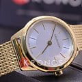 Стильным элементом стал стальной браслет плетения Mesh. Привлекательно выглядит игра оттенков серебристого циферблата «солнечные лучи» и PVD-покрытияPVDУльтратонкое покрытие наносится в технике вакуумного напыления, сочетает в себе нитрид титана особой прочности со слоем золота или оксида хрома. Несёт в себе декоративную или защитную функцию. золотистого цвета. Швейцарский кварцевый калибр от ETA. Минеральное стекло. Водонепроницаемость до 3 бар.