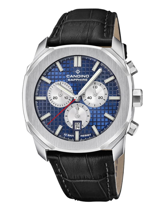 Швейцарские мужские наручные часы-хронографХронографФункция позволяет измерять отрезки времени с особой точностью: часы, минуты, секунды. Верным признаком хронографа является наличие на циферблате 3 дополнительных окошек-счётчиков. Candino Chronos Carree C4747/1, кварцевый механизм с высокой точностью. Сапфировое стеклоСапфировое стеклоПрочный и надёжный материал из кристалла сапфира синтетического происхождения, характеризующийся особой твёрдостью и устойчивостью к царапинам и повреждениям. устойчивое к появлению царапин, обладающее высокой прозрачностью. Часы, минуты, секунды. Индикация даты. Класс водозащиты: 100 метров, позволит плавать, нырять и заниматься другими водными видами спорта. Корпус часов изготовлен из нержавеющей стали. Стрелки и метки с люминесцентным покрытиемЛюминесцентное покрытиеПозволяет считывать показания времени в темноте. Производители наносят на стрелки, часовые индексы, безель или поверхность циферблата светонакопительный состав, дающий холодное свечение..
