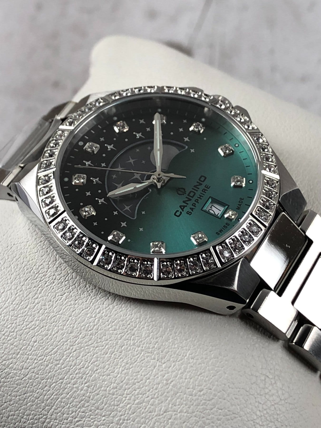 Женские наручные часы Candino Lady Elegance Moonphase C4760/2 с надёжным кварцевым механизмом. Корпус и браслет часов изготовлены из нержавеющей стали. Сапфировое стеклоСапфировое стеклоПрочный и надёжный материал из кристалла сапфира синтетического происхождения, характеризующийся особой твёрдостью и устойчивостью к царапинам и повреждениям. повышенной прозрачности, устойчивое к мелким механическим повреждениям. Стальной браслет на раскладной застёжкеРаскладная застёжкаТакой тип застёжки используется только на браслетах из металла. Она никогда не раскрывается полностью, происходит разделение на 2 и более частей. Раскладывающая застёжка снизит вероятность потери часов к минимуму.. Стрелки и метки с люминесцентным покрытиемЛюминесцентное покрытиеПозволяет считывать показания времени в темноте. Производители наносят на стрелки, часовые индексы, безель или поверхность циферблата светонакопительный состав, дающий холодное свечение.. Двухцветный циферблат с индикатором фазы луны и безельБезельВнешний ободок, закрепляющий стекло. В спортивных часах так называется поворотное кольцо с делениями на циферблате, выполняет роль таймера – замеряет отрезки времени на шкале. Неподвижный безель – элемент декора. Однонаправленно вращающийся безель на дайверских часах позволяет фиксировать моменты погружения и выныривания на поверхность. инкрустированы цирконами. Класс водозащиты: 50 метров, позволит защитить корпус от случайных брызг или капель дождя. Окошко даты находится в положении 6 часов.