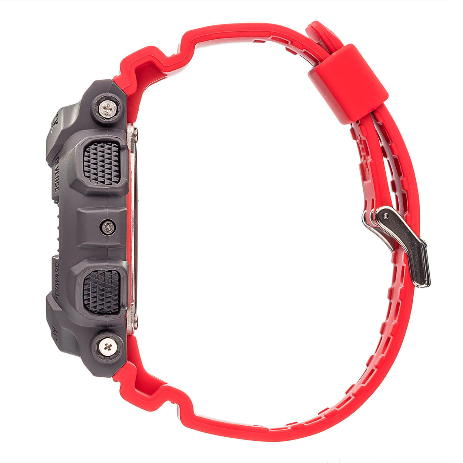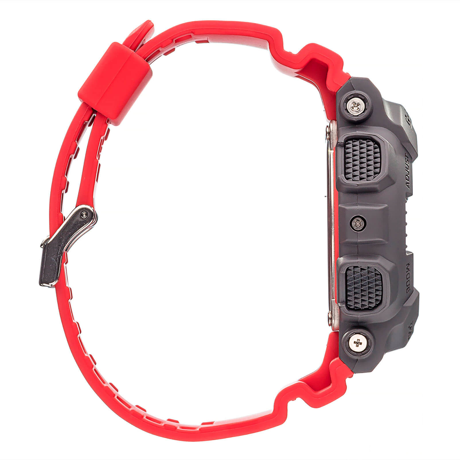 Противоударный корпусУдаропрочный корпусМеханизм заключён в корпус, выполненный из современных материалов, устойчивых к ударам, механическим повреждениям и падению с высоты: инновационный пластик, карбон, нержавеющая сталь, титан. модели позаимствован у серии GA-100, обновления коснулись циферблата и стрелок. Наручные часы представлены в минималистичном исполнении, но яркие элементы оформления делают их интереснее. Для изготовления аксессуара был выбран полимерный пластик, это способствует максимальной защите японского кварцевого механизма от ударов и вибрации. Точность хода +/- 15 секунд в месяц. Батарейка рассчитана на 2 года. Закаленное минеральное стекло. СветодиоднаяСветодиодная подсветкаСветодиодная или LED-подсветка обеспечивает появление яркого холодного свечения за счёт LED-элементов - маленьких лампочек. Они потребляют минимальное количество энергии, чаще всего можно встретить 1 светодиод, в нижней части циферблата. подсветка. Комфортный и гибкий красный ремешок. Отсутствие восприимчивости к магнитным полям. Водонепроницаемость 20 бар. Секундомер, средняя скорость пути, 5 будильников, хронографХронографФункция позволяет измерять отрезки времени с особой точностью: часы, минуты, секунды. Верным признаком хронографа является наличие на циферблате 3 дополнительных окошек-счётчиков., автоматический календарь, мировое времяМировое время Полезное часовое усложнение, отображающее время в основных городах и известных областях по всему миру, оно связано с часовыми поясами, удобно для путешественников и бизнесменов. , таймер. Габариты: 55 x 51,2 x 16,9 мм.