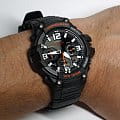 В часах имеется хронограф. Корпус и браслет черного цвета выполнены из высококачественных полимерных материалов. На дисплее отображается текущая дата. Изделие надежно защищено выпуклым акриловым стеклом. Высокая точность информации - прошедшее время отображается с точностью до доли секунды. Информация на дисплее четко видна даже в темное время суток благодаря неоновому покрытию. Высокая водонепроницаемость, которая составляет 10 Бар.