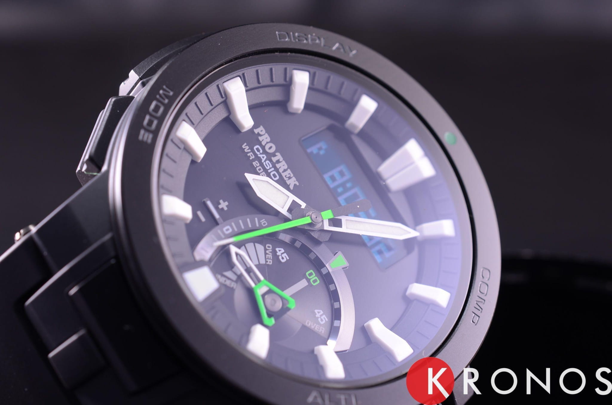 Модель с зелёными деталями отражает спортивный стиль и выигрышно смотрится на запястье. Ударопрочный корпусУдаропрочный корпусМеханизм заключён в корпус, выполненный из современных материалов, устойчивых к ударам, механическим повреждениям и падению с высоты: инновационный пластик, карбон, нержавеющая сталь, титан. выполнен из пластика и стали 316L с IP-покрытиемIP-покрытиеМетод ионного напыления. Демонстрирует повышенную устойчивость к истиранию, окислению и химическим веществам. Под воздействием высокого давления и температуры около 1500°C молекулы металла надёжно соединяются с частицами корпуса часов., что делает его устойчивым к различным видам повреждений. Наручные часы с японским кварцевым механизмом работают от солнечной батареи , функция сохранения энергии увеличивает срок работы часов без подзарядки до 21 месяца. Сапфировое стекло с покрытием «антиблик». Двойная светодиодная подсветкаСветодиодная подсветкаСветодиодная или LED-подсветка обеспечивает появление яркого холодного свечения за счёт LED-элементов - маленьких лампочек. Они потребляют минимальное количество энергии, чаще всего можно встретить 1 светодиод, в нижней части циферблата.. Водостойкость 20 бар. Устойчивость к температуре ниже -10°C. Коррекция времени радиосигналом, барометр, лунный календарь, высотомер, таймер, график восхода и заката солнца, датчик приливов и отливов, мировое времяМировое время Полезное часовое усложнение, отображающее время в основных городах и известных областях по всему миру, оно связано с часовыми поясами, удобно для путешественников и бизнесменов. – 31 часовой пояс, календарь, хронографХронографФункция позволяет измерять отрезки времени с особой точностью: часы, минуты, секунды. Верным признаком хронографа является наличие на циферблате 3 дополнительных окошек-счётчиков.. Таймер рыбалки подсказывает, какое время оптимально подходит для ловли рыбы. Габариты: 58,7 x 52,3 x 14,5 мм.