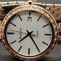 Дизайнеры декорировали безельБезельВнешний ободок, закрепляющий стекло. В спортивных часах так называется поворотное кольцо с делениями на циферблате, выполняет роль таймера – замеряет отрезки времени на шкале. Неподвижный безель – элемент декора. Однонаправленно вращающийся безель на дайверских часах позволяет фиксировать моменты погружения и выныривания на поверхность. модели сияющими кристаллами Swarovski, привлекательно смотрится перламутровый циферблат. Японский кварцевый механизм защищён стальным корпусом с IP-покрытиемIP-покрытиеМетод ионного напыления. Демонстрирует повышенную устойчивость к истиранию, окислению и химическим веществам. Под воздействием высокого давления и температуры около 1500°C молекулы металла надёжно соединяются с частицами корпуса часов. цвета розового золота. На метке 3 часов размещена апертура даты. Сохраняется водостойкость при давлении до 5 бар.