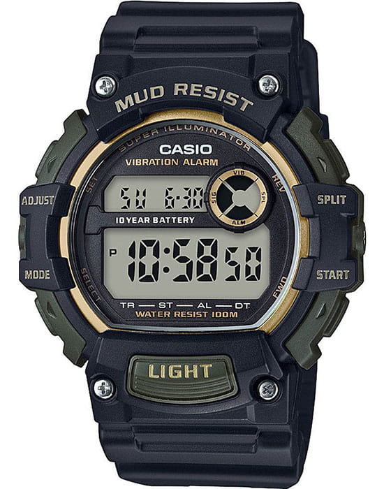 Благодаря данной модели наручных часов от Casio, занятия спортом будут проходить в комфорте. Встроен секундомер с точностью в 1/100 секунды, пределы измерения которого достигают до 10000 часов. Аксессуар грязеустойчив благодаря своей особой конструкции. Для удобства время отображается в 12-ти и 24-часовом форматах.