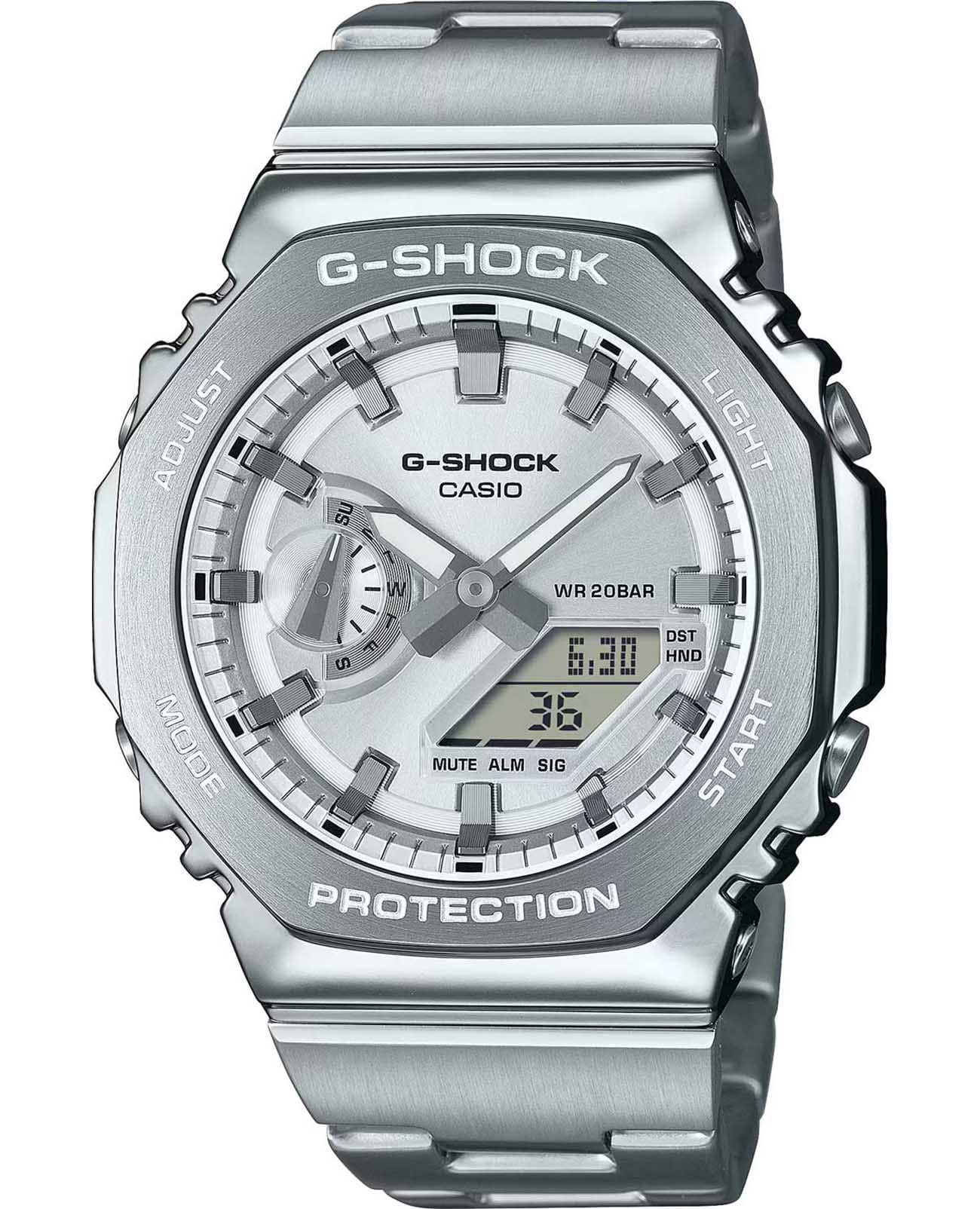 Японские ударопрочныеУдаропрочный корпусМеханизм заключён в корпус, выполненный из современных материалов, устойчивых к ударам, механическим повреждениям и падению с высоты: инновационный пластик, карбон, нержавеющая сталь, титан. мужские часы-хронографХронографФункция позволяет измерять отрезки времени с особой точностью: часы, минуты, секунды. Верным признаком хронографа является наличие на циферблате 3 дополнительных окошек-счётчиков. Casio G-Shock GM-2110D-7A в стальном корпусе. Минеральное стеклоМинеральное стеклоМинеральное стекло представляет собой искусственно выращенный минерал кварца. Такое стекло отличается особой устойчивостью к повреждениям и царапинам. Уступает по некоторым качествам сапфировому стеклу. устойчивое к появлению царапин, обладающее высокой прозрачностью. Сверхмощная двойная подсветка. При нажатии на кнопку подсветки циферблат часов освещает светодиод, а также отдельно подсвечивается цифровой дисплей. На стрелки часов нанесено NeobriteПодсветка NeobriteИспользование светонакопительных составов на основе сульфида цинка или алюмината стронция, яркий свет можно наблюдать на протяжении 6-10 часов после «зарядки» часов около источника света.-покрытие. Полный автокалендарь (до 2099 года). Включение/выключение звукового сигнала нажатия кнопки. 12/24-часовой формат времени. Мировое время Мировое время Полезное часовое усложнение, отображающее время в основных городах и известных областях по всему миру, оно связано с часовыми поясами, удобно для путешественников и бизнесменов. 31 часовой пояс (48 городов + всемирное координированное время), переход на летнее время вкл./выкл. СекундомерСекундомерСекундоме́р — прибор, способный измерять интервалы времени с точностью до долей секунды.. ТаймерТаймерОтсчитывает секунды в обратном направлении в заданном интервале времени.. 5 ежедневных будильников. Почасовой сигнал времени. Класс водозащиты: 200 метров, позволит плавать, нырять и заниматься другими водными видами спорта. Стальной браслет на раскладной застёжкеРаскладная застёжкаТакой тип застёжки используется только на браслетах из металла. Она никогда не раскрывается полностью, происходит разделение на 2 и более частей. Раскладывающая застёжка снизит вероятность потери часов к минимуму..