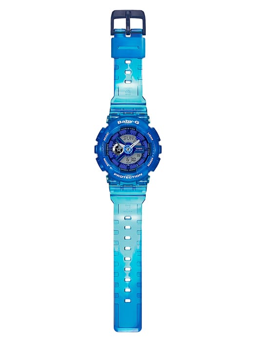 Противоударные японские женские часы Casio Baby-G BA-110JM-2A, кварцевый механизм с высокой точностью. Класс водозащиты: 100 метров, позволит плавать, нырять и заниматься другими водными видами спорта. Корпус часов изготовлен из пластика, прозрачного цвета.