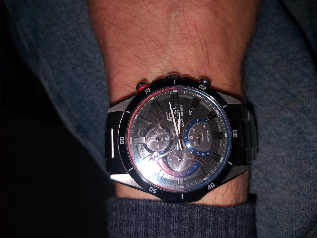 Мужские часы-хронографХронографФункция позволяет измерять отрезки времени с особой точностью: часы, минуты, секунды. Верным признаком хронографа является наличие на циферблате 3 дополнительных окошек-счётчиков. Casio Edifice EFR-571DB-1A1, кварцевый механизм с высокой точностью. Тонкий корпус толщиной менее 10 мм обеспечивает комфортную носку в любимом вами спортивном дизайне хронографа с дополнительными циферблатами. Металлический сетчатый циферблат напоминает решетку радиатора спортивного автомобиля, создавая впечатление чистой спортивной скорости, а устойчивое к царапинам сапфировое стеклоСапфировое стеклоПрочный и надёжный материал из кристалла сапфира синтетического происхождения, характеризующийся особой твёрдостью и устойчивостью к царапинам и повреждениям. обеспечивает высокую прозрачность и легкость считывания показаний. На циферблате имеется индикатор запас хода. Светонакопительное покрытие позволяет видеть время в темноте даже после непродолжительного нахождения часов на свету. Подойдут как для повседневной, так и для активной деятельности. Питание от солнечной энергии, индикатор заряда батареи. Приблизительное время автономной работы без подзарядки на свету около 6 месяцев. Долговечный стальной корпус, закрытый сапфировым стеклом с антибликовым покрытием. БезельБезельВнешний ободок, закрепляющий стекло. В спортивных часах так называется поворотное кольцо с делениями на циферблате, выполняет роль таймера – замеряет отрезки времени на шкале. Неподвижный безель – элемент декора. Однонаправленно вращающийся безель на дайверских часах позволяет фиксировать моменты погружения и выныривания на поверхность. с IP-покрытиемIP-покрытиеМетод ионного напыления. Демонстрирует повышенную устойчивость к истиранию, окислению и химическим веществам. Под воздействием высокого давления и температуры около 1500°C молекулы металла надёжно соединяются с частицами корпуса часов.. Светонакопительное покрытие NeobriteПодсветка NeobriteИспользование светонакопительных составов на основе сульфида цинка или алюмината стронция, яркий свет можно наблюдать на протяжении 6-10 часов после «зарядки» часов около источника света. продолжает светиться в темноте даже после непродолжительного пребывания на свету.СекундомерСекундомерСекундоме́р — прибор, способный измерять интервалы времени с точностью до долей секунды. с точностью показаний 1/10с и временем измерения 1ч. Корпус изготовлен из нержавеющей стали. На циферблате находится три дополнительных индикатора. Окошко даты находится в положении 4 часов. Класс водозащиты: 100 метров, позволит плавать, нырять и заниматься другими водными видами спорта. Заводная головка с защитой. Стальной браслет на раскладной застёжкеРаскладная застёжкаТакой тип застёжки используется только на браслетах из металла. Она никогда не раскрывается полностью, происходит разделение на 2 и более частей. Раскладывающая застёжка снизит вероятность потери часов к минимуму..