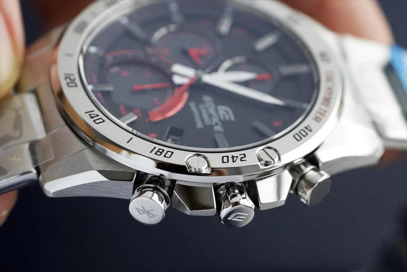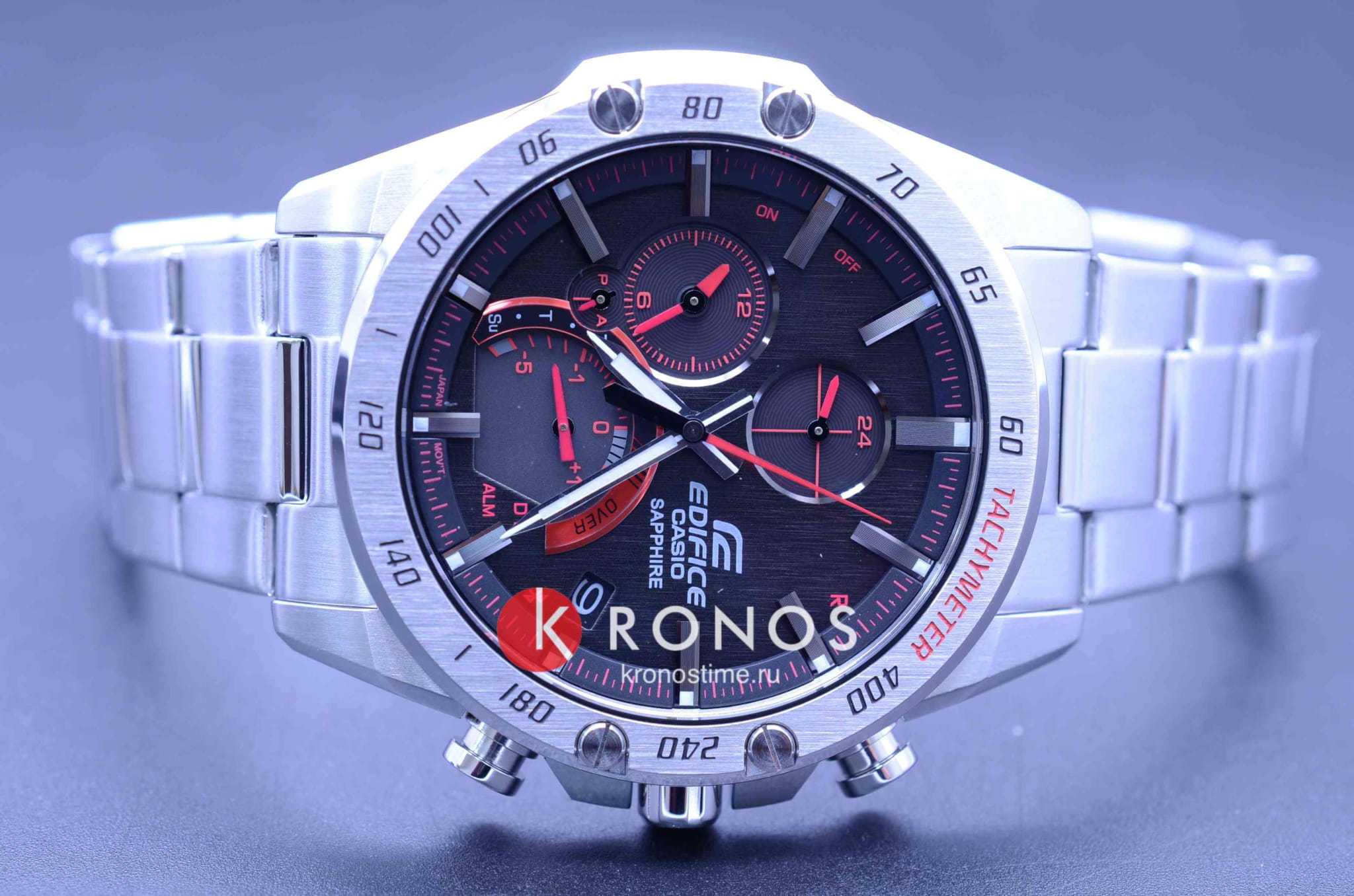 Стильная расцветка включает яркие красные акценты. Счётчик на позиции 6 часов имеет градиентную окантовку, что стало отсылкой к скорости и динамике. Аксессуар обладает ультратонким корпусом в 8,9 мм по сравнению с предшественниками серии EQB. Этого удалось добиться за счёт более плотного расположения деталей на модуле. Часы способны синхронизироваться со смартфоном для настроек точного времени и поиска телефона – технология BluetoothBluetoothСовременная технология, позволяющая синхронизировать часы с телефоном и переносить данные. Часы с Bluetooth расширяют возможности вашего смартфона и делают его использование ещё более удобным.. Питание японского кварцевого механизма обеспечивается за счёт солнечной батареи , следить за уровнем зарядки устройства можно благодаря специальному индикатору. Циферблат защищён сапфировым стеклом, устойчивым к появлению царапин. Стрелки имеют люминесцентное покрытиеЛюминесцентное покрытиеПозволяет считывать показания времени в темноте. Производители наносят на стрелки, часовые индексы, безель или поверхность циферблата светонакопительный состав, дающий холодное свечение.. Модель подходит для плавания, отличается водостойкостью до 10 бар и заводной головкой с защитой. Функции: хронографХронографФункция позволяет измерять отрезки времени с особой точностью: часы, минуты, секунды. Верным признаком хронографа является наличие на циферблате 3 дополнительных окошек-счётчиков., секундомер, тахиметрТахиметрРазмеченная шкала, располагается на ободке или безеле часов. Тахиметр позволяет рассчитать скорость на определённом участке пути, расстояние измеряется в километрах или милях., будильник, мировое времяМировое время Полезное часовое усложнение, отображающее время в основных городах и известных областях по всему миру, оно связано с часовыми поясами, удобно для путешественников и бизнесменов. , календарь. Есть индикатор последнего круга для любителей гонок. Габариты: 49,9 x 45,6 x 8,9 мм.