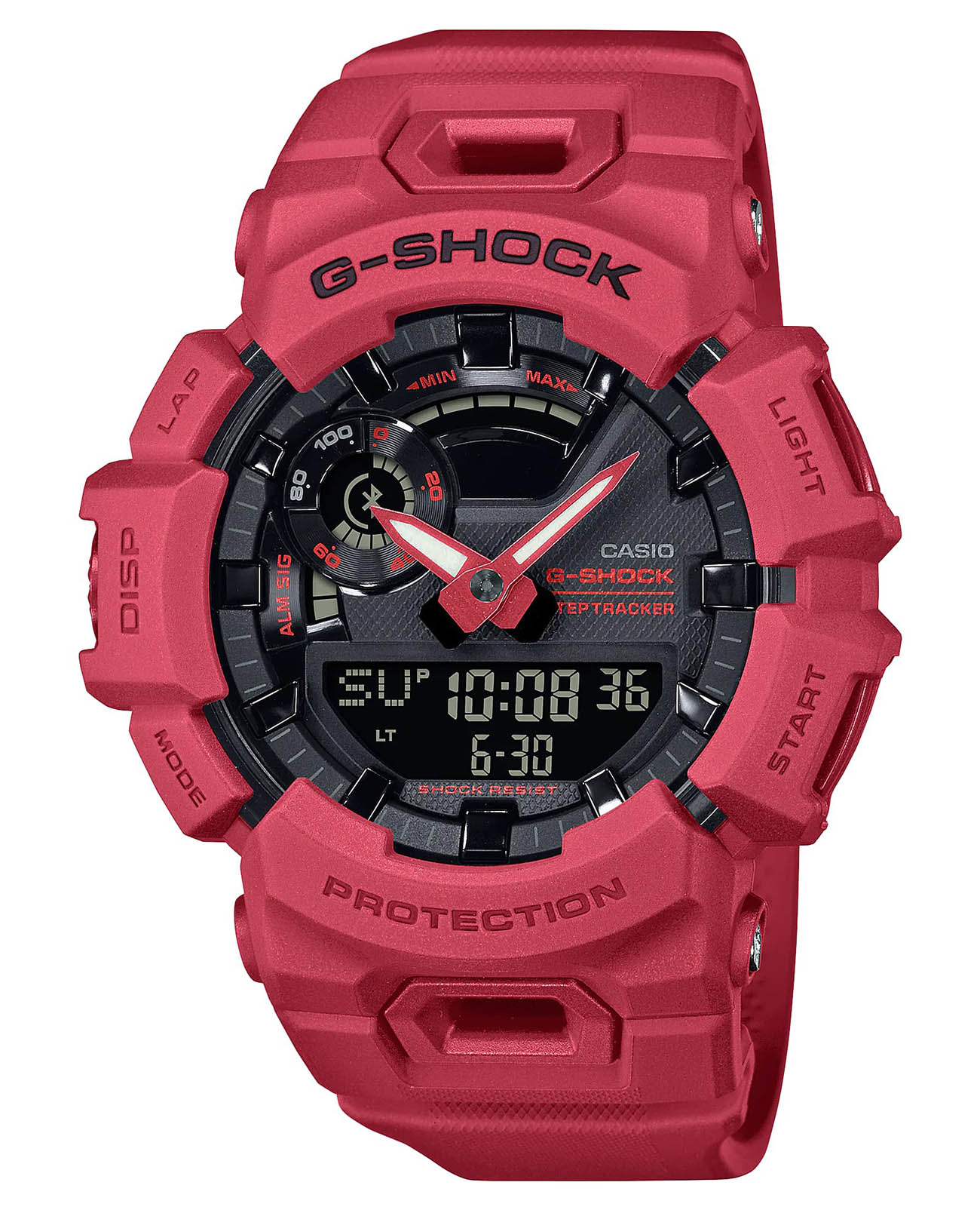 Японские мужские противоударные часы с шагомером Casio G-Shock GBA-900RD-4A, кварцевый механизм с высокой точностью. Класс водозащиты: 200 метров, позволит плавать, нырять и заниматься другими водными видами спорта. Корпус часов изготовлен из пластика красного цвета. Ударопрочный корпусУдаропрочный корпусМеханизм заключён в корпус, выполненный из современных материалов, устойчивых к ударам, механическим повреждениям и падению с высоты: инновационный пластик, карбон, нержавеющая сталь, титан. защищает механизм от ударов и вибрации. Модель обладает функцией шагомера и способна отслеживать дневную активность. Часы обладают многофункциональным таймером, который можно использовать для интервальных тренировок. с помощью технологии BluetoothBluetoothСовременная технология, позволяющая синхронизировать часы с телефоном и переносить данные. Часы с Bluetooth расширяют возможности вашего смартфона и делают его использование ещё более удобным.® часы способны синхронизироваться со смартфоном. БудильникБудильникБуди́льник — часы, в заданный момент времени подающие звуковой, световой и/или в редких случаях другой сигнал. и секундомерСекундомерСекундоме́р — прибор, способный измерять интервалы времени с точностью до долей секунды..