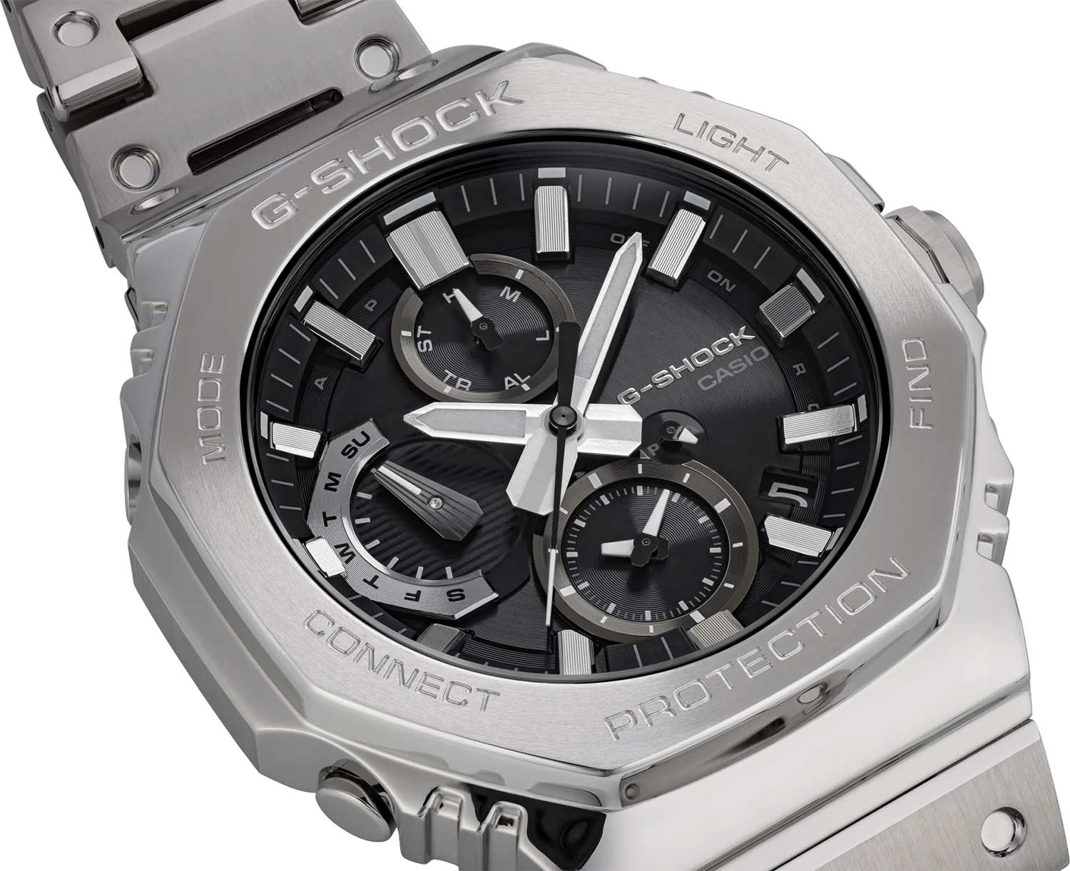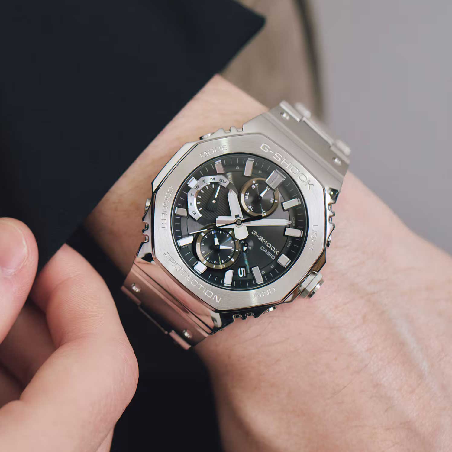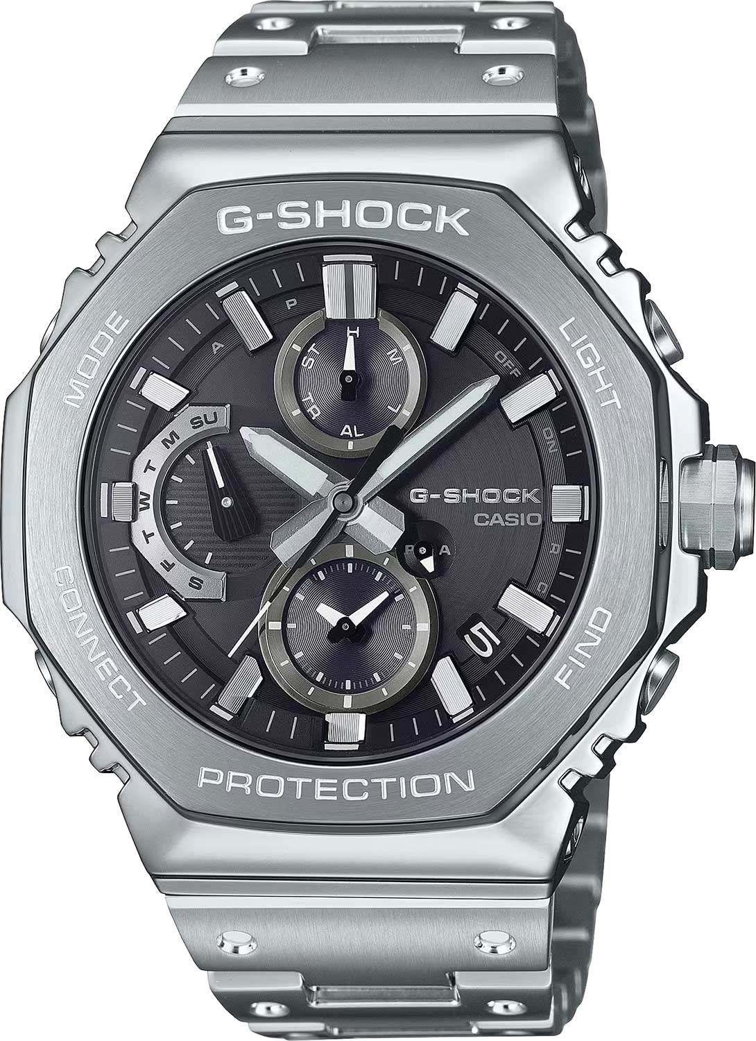 Модель Casio G-SHOCK GMC-B2100D-1A сочетает элегантность металлического корпуса и передовые технологии. Восьмиугольный безельБезельВнешний ободок, закрепляющий стекло. В спортивных часах так называется поворотное кольцо с делениями на циферблате, выполняет роль таймера – замеряет отрезки времени на шкале. Неподвижный безель – элемент декора. Однонаправленно вращающийся безель на дайверских часах позволяет фиксировать моменты погружения и выныривания на поверхность., вдохновленный оригинальной моделью DW-5000C 1983 года, придает часам современный минималистичный стиль. Корпус и браслет изготовлены из нержавеющей стали, а амортизирующие элементы из мелкозернистой смолы защищают механизм от ударов и вибраций, обеспечивая ударопрочностьУдаропрочный корпусМеханизм заключён в корпус, выполненный из современных материалов, устойчивых к ударам, механическим повреждениям и падению с высоты: инновационный пластик, карбон, нержавеющая сталь, титан.. Часы оснащены солнечным питанием Tough SolarTough SolarТехнология основана на подзарядке аккумулятора от источника солнечного света, специальная панель улавливает солнечные лучи и преобразует их в энергию для работы часов. Достаточно пары минут нахождения на солнце для функционирования часов в течении суток., которое позволяет заряжать аккумулятор от солнечного света, а также Bluetooth®-синхронизациейBluetoothСовременная технология, позволяющая синхронизировать часы с телефоном и переносить данные. Часы с Bluetooth расширяют возможности вашего смартфона и делают его использование ещё более удобным., обеспечивающей автоматическую корректировку времени и управление настройками через приложение CASIO WATCHES. Дополнительные функции включают мировое времяМировое время Полезное часовое усложнение, отображающее время в основных городах и известных областях по всему миру, оно связано с часовыми поясами, удобно для путешественников и бизнесменов. , секундомерСекундомерСекундоме́р — прибор, способный измерять интервалы времени с точностью до долей секунды., таймер обратного отсчетаТаймерОтсчитывает секунды в обратном направлении в заданном интервале времени., будильникиБудильникБуди́льник — часы, в заданный момент времени подающие звуковой, световой и/или в редких случаях другой сигнал. и светодиодную подсветкуСветодиодная подсветкаСветодиодная или LED-подсветка обеспечивает появление яркого холодного свечения за счёт LED-элементов - маленьких лампочек. Они потребляют минимальное количество энергии, чаще всего можно встретить 1 светодиод, в нижней части циферблата.. Водонепроницаемость до 200 метров делает модель подходящей для плавания и активного отдыха. Casio G-SHOCK GMC-B2100D-1A — это надежный и стильный аксессуар, идеально сочетающий прочность, технологичность и современный дизайн.