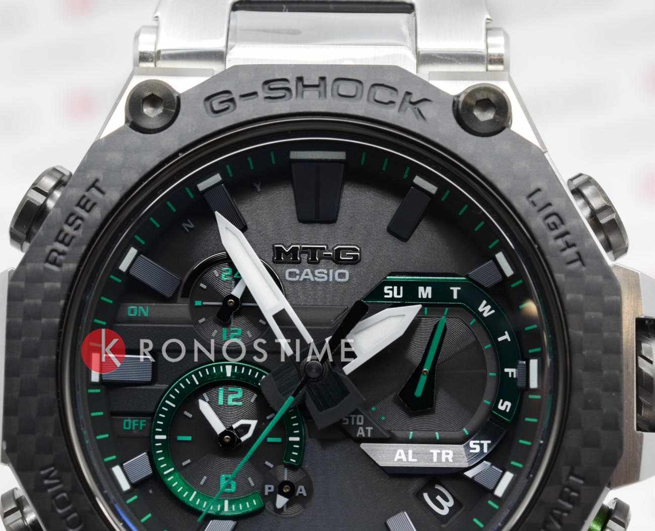 Мужские наручные часы-хронографХронографФункция позволяет измерять отрезки времени с особой точностью: часы, минуты, секунды. Верным признаком хронографа является наличие на циферблате 3 дополнительных окошек-счётчиков. Casio G-Shock MTG-B2000XD-1A из коллекции MT-G сочетают в себе стильный дизайн и передовые технологии. Модель обладает круглым корпусом диаметром 55,9 мм, изготовленным из нержавеющей стали с карбоновымКарбонОт «carbon», «carbone» - углерод, углепластик - полимерный композиционный материал из переплетённых под определенным углом между собой нитей углеродного волокна, применяется для изготовления лёгких, но прочных деталей. В часах часто используют для украшения циферблатов и ремешков. Так же карбон используется в изготовлении корпусов. Такие корпуса обладают антикоррозионным свойством, не поддаются электромагнитному излучению, обладают повышенной прочностью и противоударностью. вставками, что обеспечивает высокую устойчивость к внешним воздействиям и легкость. Для защиты циферблата используется сапфировое стеклоСапфировое стеклоПрочный и надёжный материал из кристалла сапфира синтетического происхождения, характеризующийся особой твёрдостью и устойчивостью к царапинам и повреждениям., которое особо устойчиво к царапинам и имеет антибликовое покрытиеАнтибликовое покрытиеСлой оксида металла в 0,13-0,3 микрон, благодаря которому стекло часов не бликует и не отражает свет. Антибликовое покрытие уменьшает отражение света в 10 раз, обеспечивая отличную читаемость показателей циферблата.. Часы оснащены кварцевым механизмом с функцией Tough SolarTough SolarТехнология основана на подзарядке аккумулятора от источника солнечного света, специальная панель улавливает солнечные лучи и преобразует их в энергию для работы часов. Достаточно пары минут нахождения на солнце для функционирования часов в течении суток., обеспечивающей автономную работу за счет солнечной энергии. Модель также поддерживает технологию BluetoothBluetoothСовременная технология, позволяющая синхронизировать часы с телефоном и переносить данные. Часы с Bluetooth расширяют возможности вашего смартфона и делают его использование ещё более удобным., которая позволяет синхронизировать часы со смартфоном для настройки времени и управления дополнительными функциями. Водонепроницаемость часов достигает 200 метров (WR 200), что делает их пригодными для дайвинга. Браслет выполнен из нержавеющей стали с раскладной застежкойРаскладной замокДанный вариант застежки используется только на часах с металлическим браслетом. Отличительная особенность такого крепления в том, что длина браслета становится универсальной и вы можете самостоятельно отрегулировать нужный вам размер – застежка просто двигается по браслету часов., гарантирующей комфортное ношение и безопасность. Часы оснащены функцией секундомераСекундомерСекундоме́р — прибор, способный измерять интервалы времени с точностью до долей секунды., второго часового поясаВторой часовой поясФункция, позволяющая отображать время двух часовых поясов одновременно. и мирового времениМировое время Полезное часовое усложнение, отображающее время в основных городах и известных областях по всему миру, оно связано с часовыми поясами, удобно для путешественников и бизнесменов. , что особенно полезно для путешественников. Допо