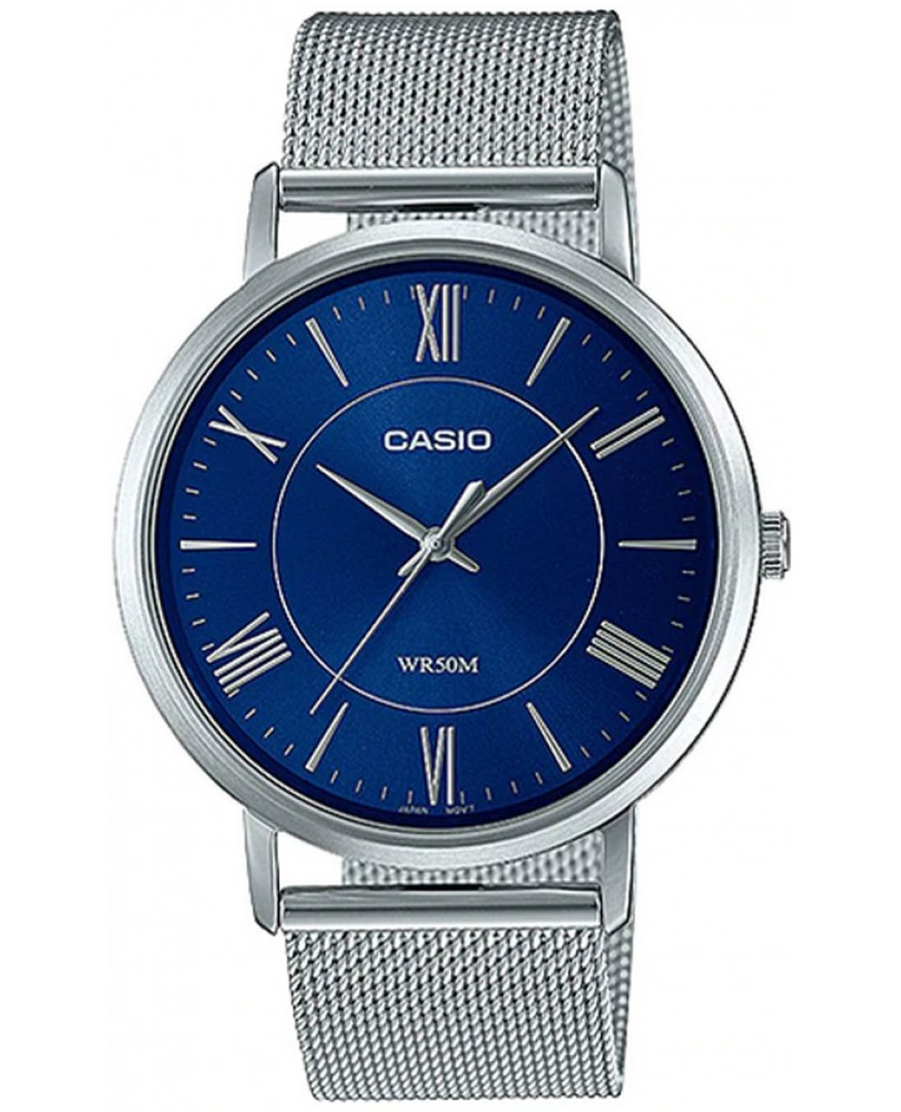 Японские мужские часы с минеральным стекломМинеральное стеклоМинеральное стекло представляет собой искусственно выращенный минерал кварца. Такое стекло отличается особой устойчивостью к повреждениям и царапинам. Уступает по некоторым качествам сапфировому стеклу. Casio Collection MTP-B110M-2A, кварцевый механизм с высокой точностью. Класс водозащиты: 50 метров, позволит защитить корпус от случайных брызг или капель дождя. Корпус и браслет часов изготовлены из стали. Браслет миланского плетения с раскладной застёжкойРаскладная застёжкаТакой тип застёжки используется только на браслетах из металла. Она никогда не раскрывается полностью, происходит разделение на 2 и более частей. Раскладывающая застёжка снизит вероятность потери часов к минимуму..