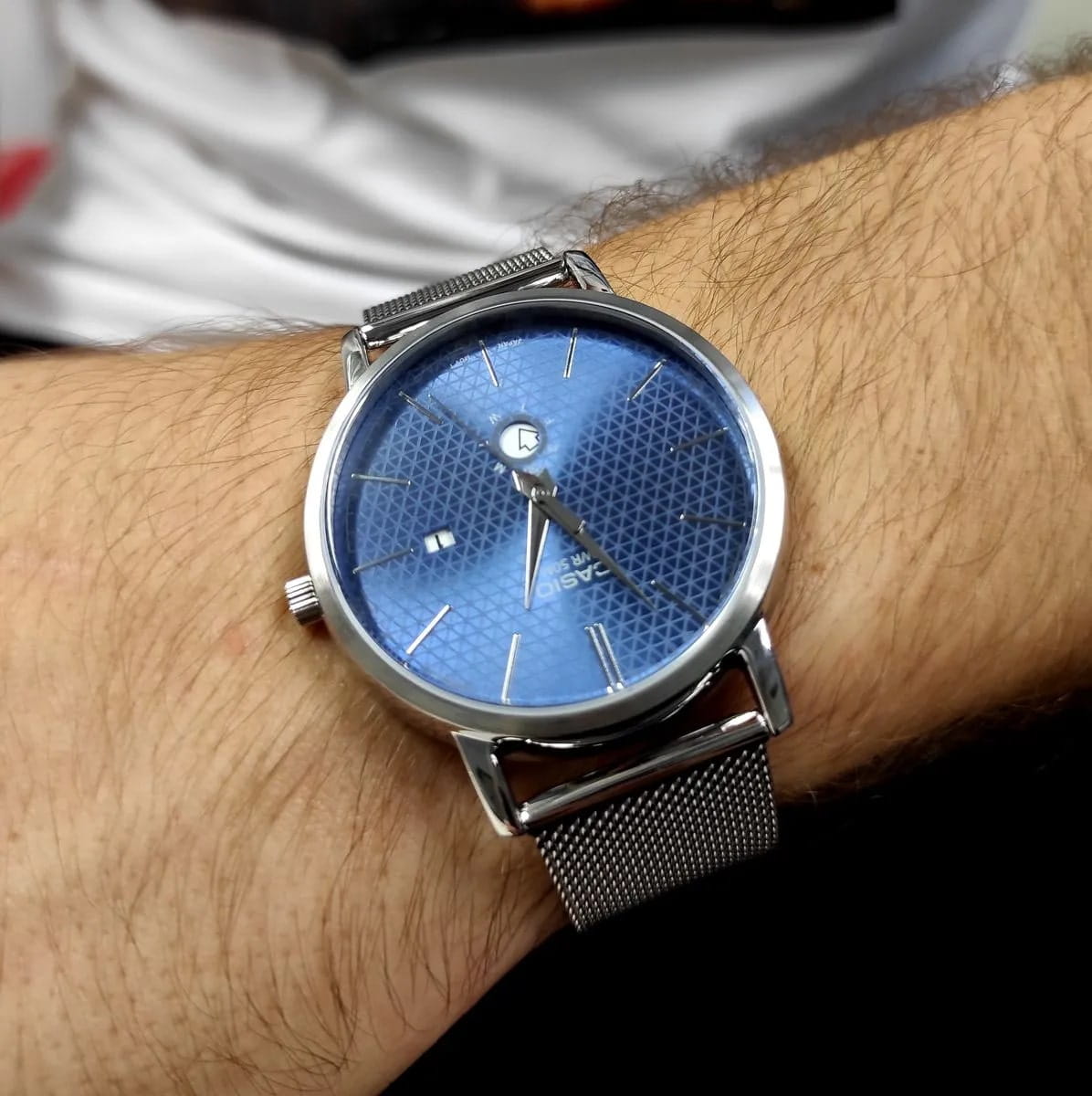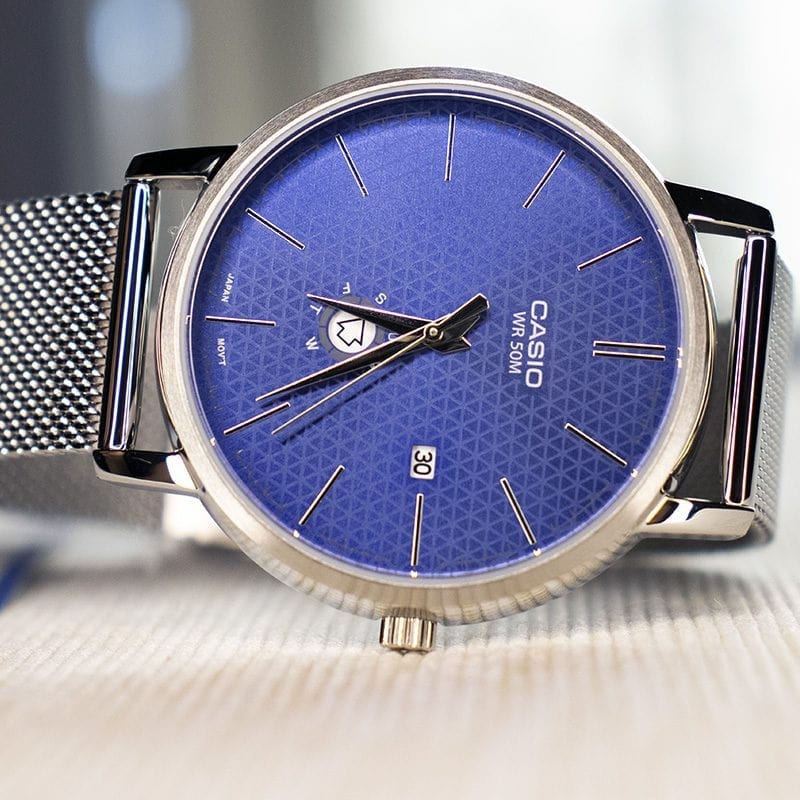 Японские мужские наручные часы с минеральным стекломМинеральное стеклоМинеральное стекло представляет собой искусственно выращенный минерал кварца. Такое стекло отличается особой устойчивостью к повреждениям и царапинам. Уступает по некоторым качествам сапфировому стеклу. Casio Collection MTP-B125M-2A, кварцевый механизм с высокой точностью. Класс водозащиты: 50 метров, позволит защитить корпус от случайных брызг или капель дождя. Корпус часов изготовлен из стали. Стальной браслет на раскладной застёжкеРаскладная застёжкаТакой тип застёжки используется только на браслетах из металла. Она никогда не раскрывается полностью, происходит разделение на 2 и более частей. Раскладывающая застёжка снизит вероятность потери часов к минимуму.. Окошко даты находится в положении 3 часа. Окошко дня недели находится в положении 6 часов.