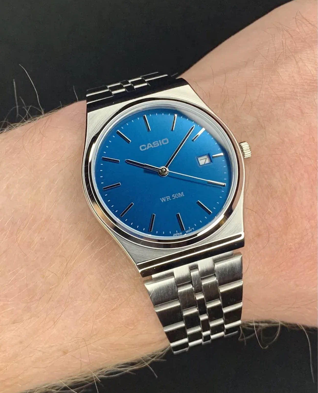 Японские мужские часы с минеральным стекломМинеральное стеклоМинеральное стекло представляет собой искусственно выращенный минерал кварца. Такое стекло отличается особой устойчивостью к повреждениям и царапинам. Уступает по некоторым качествам сапфировому стеклу. Casio Collection MTP-B145D-2A2, кварцевый механизм с высокой точностью. Корпус часов изготовлен из стали. Циферблат с метками в виде штрихов выполнен по технологии Sunray (солнечные лучи). Окошко даты находится в положении 3 часа. Батарейка рассчитана на 3 года. Класс водозащиты: 50 метров, позволит защитить корпус от случайных брызг или капель дождя. Стальной браслет на раскладной застёжкеРаскладная застёжкаТакой тип застёжки используется только на браслетах из металла. Она никогда не раскрывается полностью, происходит разделение на 2 и более частей. Раскладывающая застёжка снизит вероятность потери часов к минимуму..