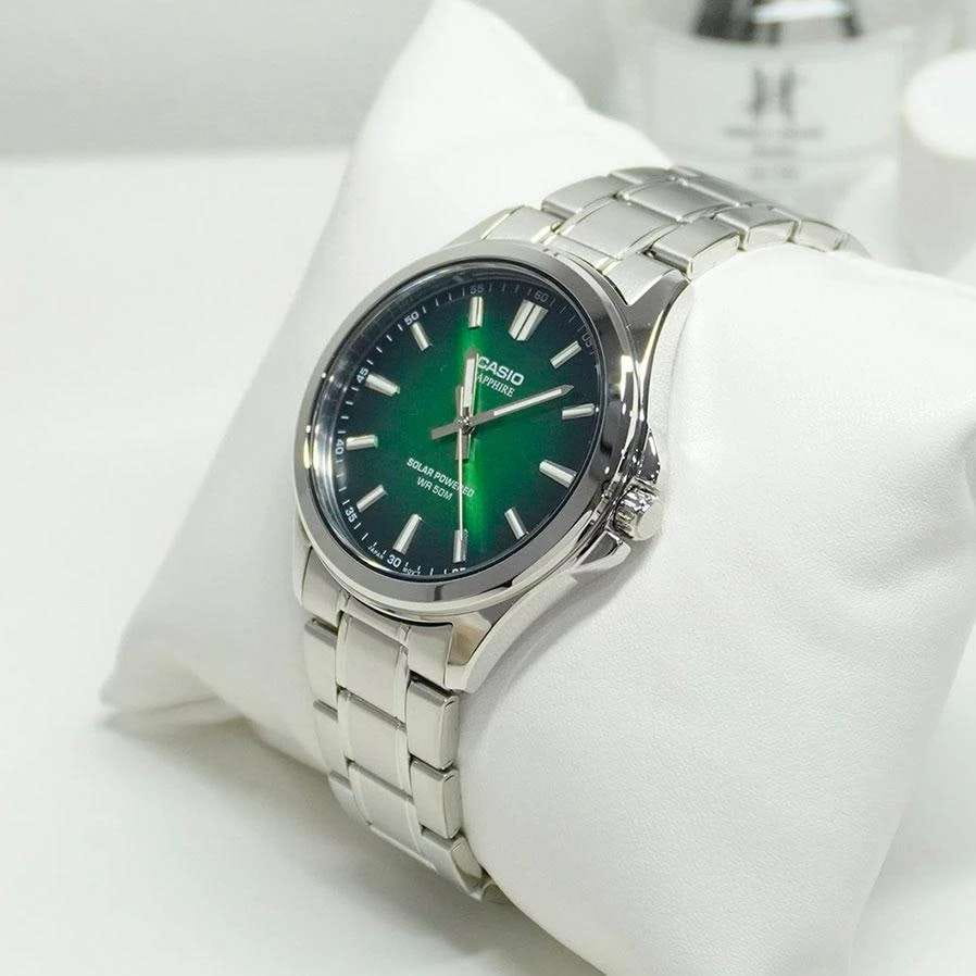 Мужские кварцевые часы Casio Collection — это современный и практичный аксессуар с питанием от солнечной энергии. Корпус размером 41,7 мм и толщиной 9,5 мм выполнен из нержавеющей стали. Циферблат зелёного цвета оформлен штрихами и стрелками. Циферблат защищён сапфировым стекломСапфировое стеклоПрочный и надёжный материал из кристалла сапфира синтетического происхождения, характеризующийся особой твёрдостью и устойчивостью к царапинам и повреждениям. с антибликовым покрытиемАнтибликовое покрытиеСлой оксида металла в 0,13-0,3 микрон, благодаря которому стекло часов не бликует и не отражает свет. Антибликовое покрытие уменьшает отражение света в 10 раз, обеспечивая отличную читаемость показателей циферблата.. Механизм — японский кварцевый калибр Miyota с центральной секундной стрелкой. Часы оснащены стальным браслетом из нержавеющей стали на раскладной застёжкеРаскладная застёжкаТакой тип застёжки используется только на браслетах из металла. Она никогда не раскрывается полностью, происходит разделение на 2 и более частей. Раскладывающая застёжка снизит вероятность потери часов к минимуму.. Заводная головка с защитой повышает надёжность. Водонепроницаемость 50 м позволяет использовать часы при мытье рук или в дождь. Идеальный выбор для тех, кто ценит японское качество и универсальный дизайн.