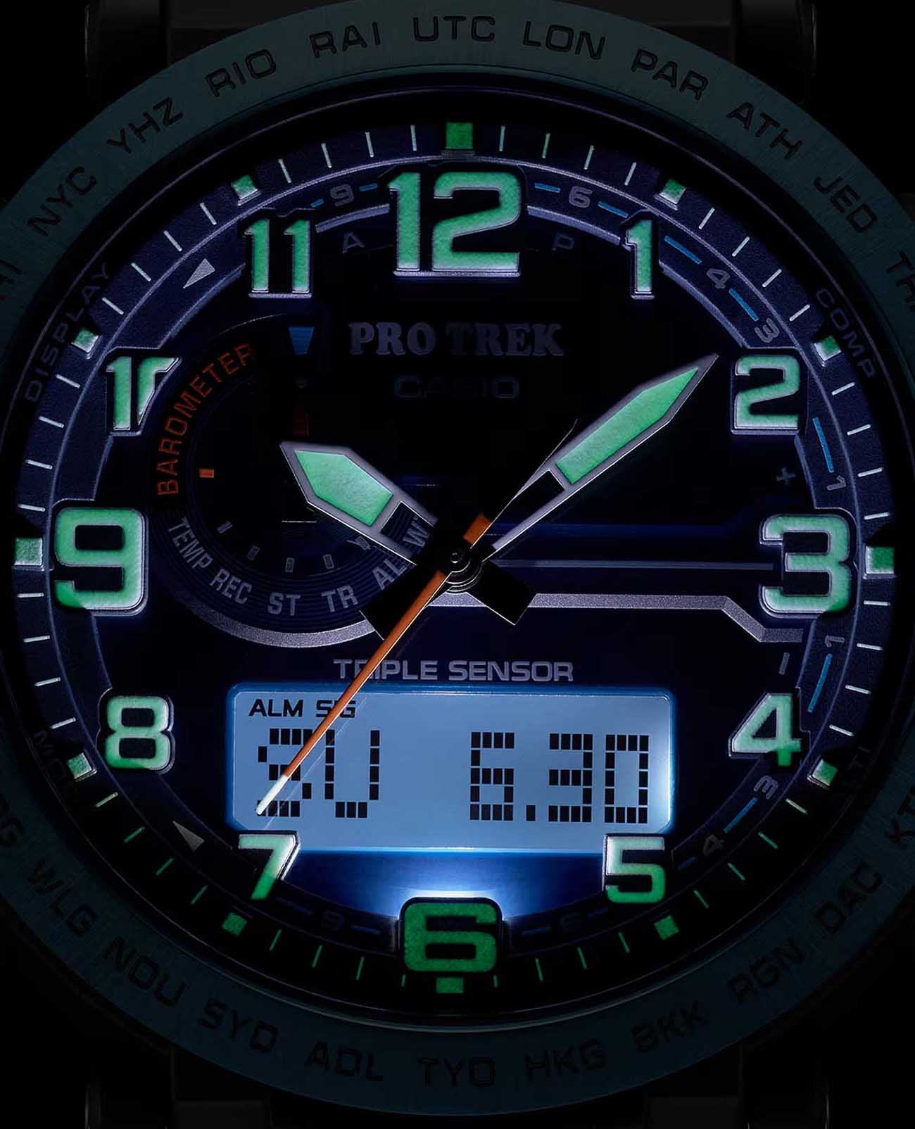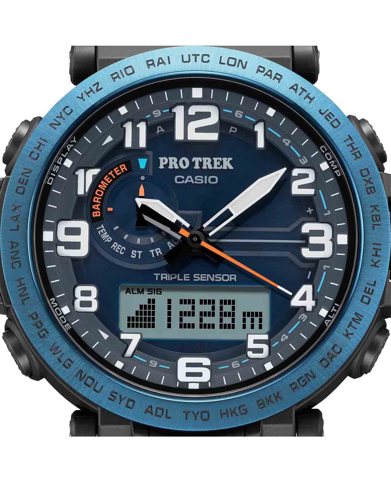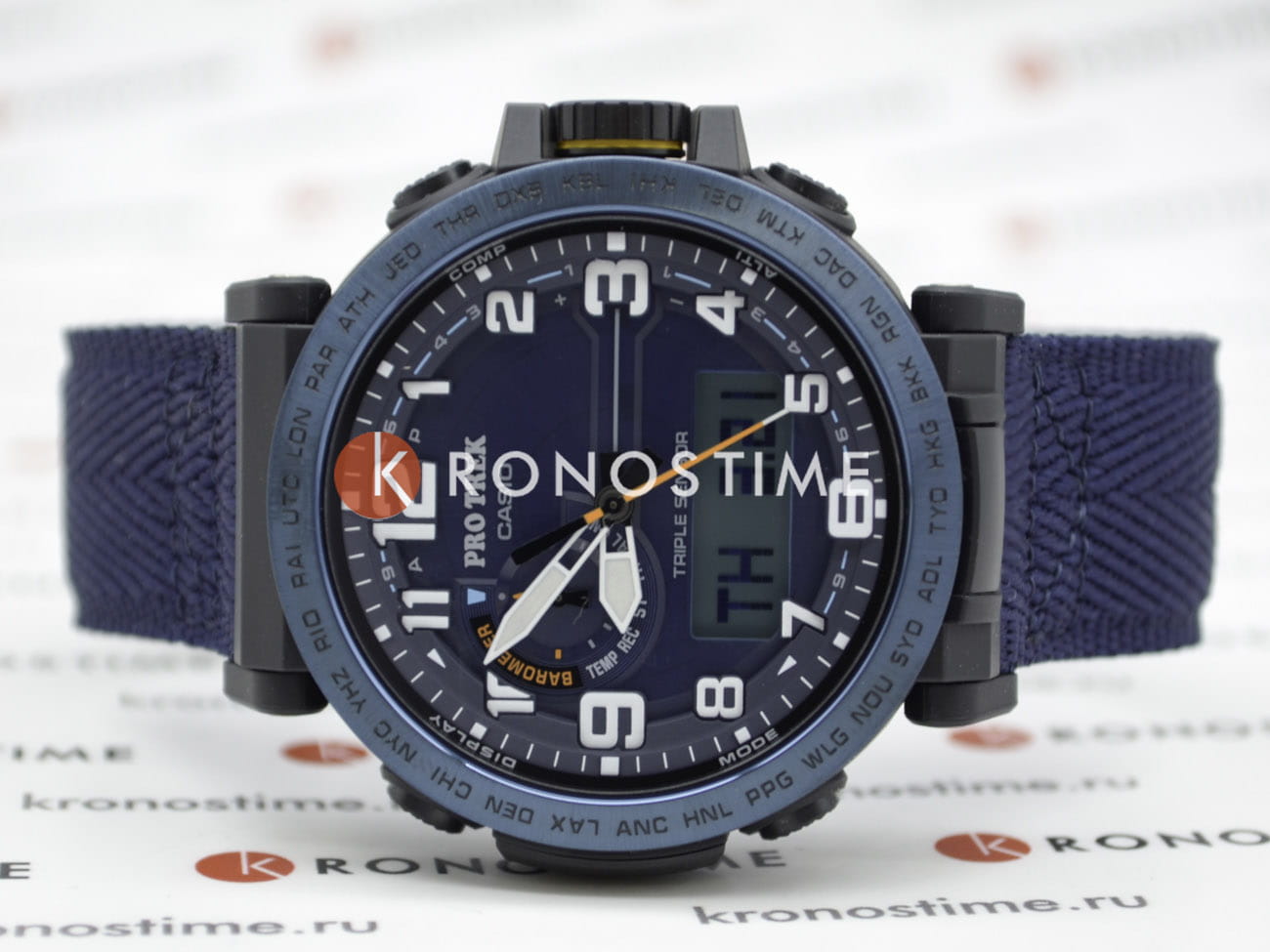 Любое ваше путешествие выйдет на новый уровень благодаря этим часам из коллекции Pro Trek. Casio Pro Trek PRG-601YB-2 для активного отдыха. Корпус и ремешок выполнены из биопластика, который изготавливается из возобновляемых органических ресурсов. Питание от солнечной энергии Tough SolarTough SolarТехнология основана на подзарядке аккумулятора от источника солнечного света, специальная панель улавливает солнечные лучи и преобразует их в энергию для работы часов. Достаточно пары минут нахождения на солнце для функционирования часов в течении суток. - солнечные батарейки большой мощности, индикатор заряда батареи. Функция автоматического сохранения энергии. Время работы аккумулятора без подзарядки приблизительно 7 месяцев, при включенной функции сохранения энергии приблизительно 25 месяцев. Модуль часов рассчитан на работу при низких температурах до -10°С/14°F. Двойная подcветка: циферблат и ЖК-дисплеи подсвечиваются светодиодом, благодаря наличию функции задержки, после отпускания кнопки освещение горит еще несколько секунд. Настраиваемое послесвечение 1,5 или 3сек. Цвет подсветки: белый. Необритовое покрытиеПодсветка NeobriteИспользование светонакопительных составов на основе сульфида цинка или алюмината стронция, яркий свет можно наблюдать на протяжении 6-10 часов после «зарядки» часов около источника света. обеспечивает длительное послесвечение в темноте даже после кратковременного нахождения на свету. 12-ти и 24-х часовой формат времени. СекундомерСекундомерСекундоме́р — прибор, способный измерять интервалы времени с точностью до долей секунды. с точностью показаний 1/100с и временем измерения 24ч. Сплит-хронографСплит-хронографИспользуется для измерения продолжительности нескольких временных отрезков, начинающихся одновременно, а заканчивающихся в разное время.. ТаймерТаймерОтсчитывает секунды в обратном направлении в заданном интервале времени. обратного отсчета от 1с до 1ч. Мировое времяМировое время Полезное часовое усложнение, отображающее время в основных городах и известных областях по всему миру, оно связано с часовыми поясами, удобно для путешественников и бизнесменов. – 29 городов (29 часовых поясов), всемирное координированное время (UTC). Функция включения/отключения летнего времени. Функция автоматической коррекции положения стрелок проверяет положение стрелок каждый час и корректирует его в случае необходимости. Технология Triple Sensor позволяет точно и легко определять сторону света, температуру и атмосферное давление. Термометр от -10° до +60°С с точностью 0,1°C. Барометр - измерение атмосферного давления от 260 до 1100 гПа (от 195 до 825 мм рт. ст.). Встроенный цифровой компас. Диапазон измерения от 0° до 359° с точностью 1°. Высотомер - встроенный датчик барометрического давления с возможностью вывода результатов в единицах высоты над уровнем моря (от -700 до 10000 метров). График набора высоты. Хранение до 30 записей о высотных точках рельефа местности - измеренной абсолютной высоты, даты и времени. Система Smart Access с помощью электронной заводной головки обеспечивает простой и удобный доступ ко всем важным функциям часов. Нажатие или поворот заводной головки позволяет переключаться между различными режимами и активировать будильникБудильникБуди́льник — часы, в заданный момент времени подающие звуковой, световой и/или в редких случаях друго